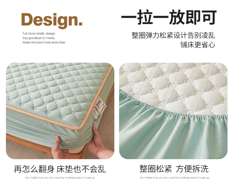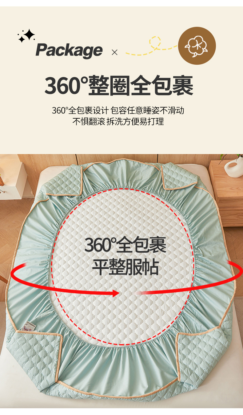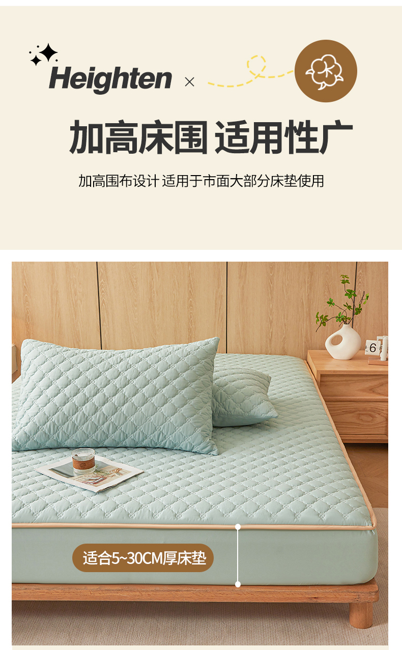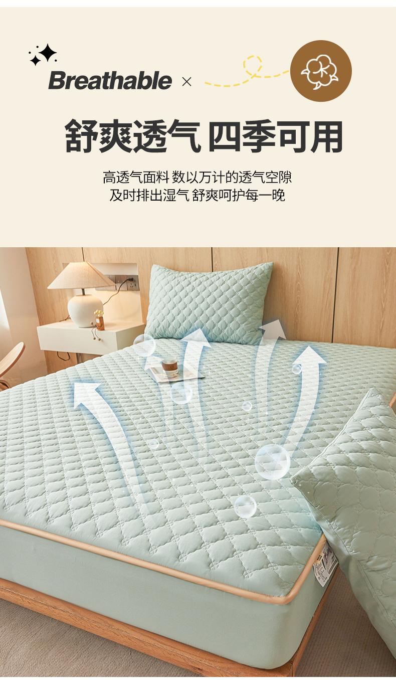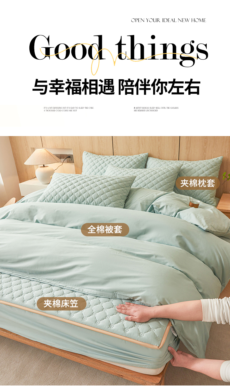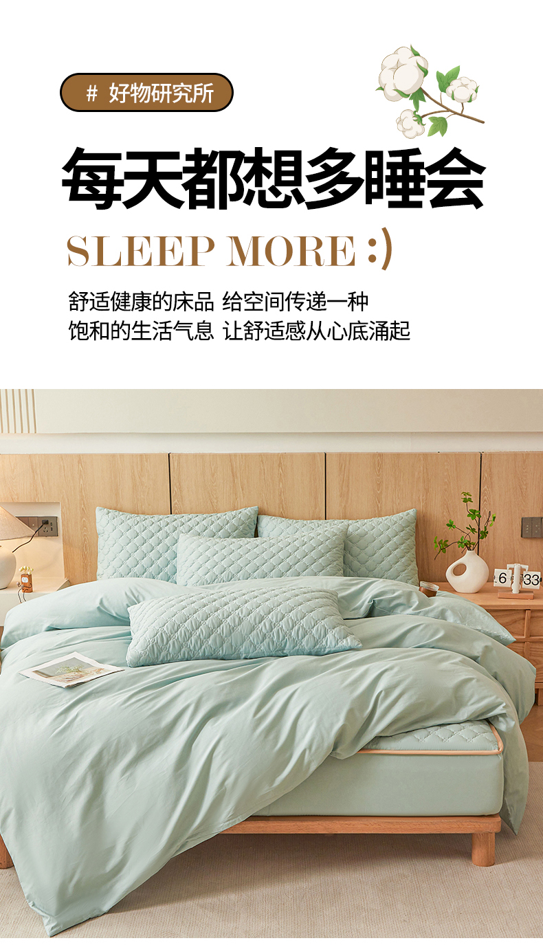 • 91家纺网 家纺一手货源 找家纺 名优家纺 2025新款全棉夹棉床笠 幸运草-莫奈绿