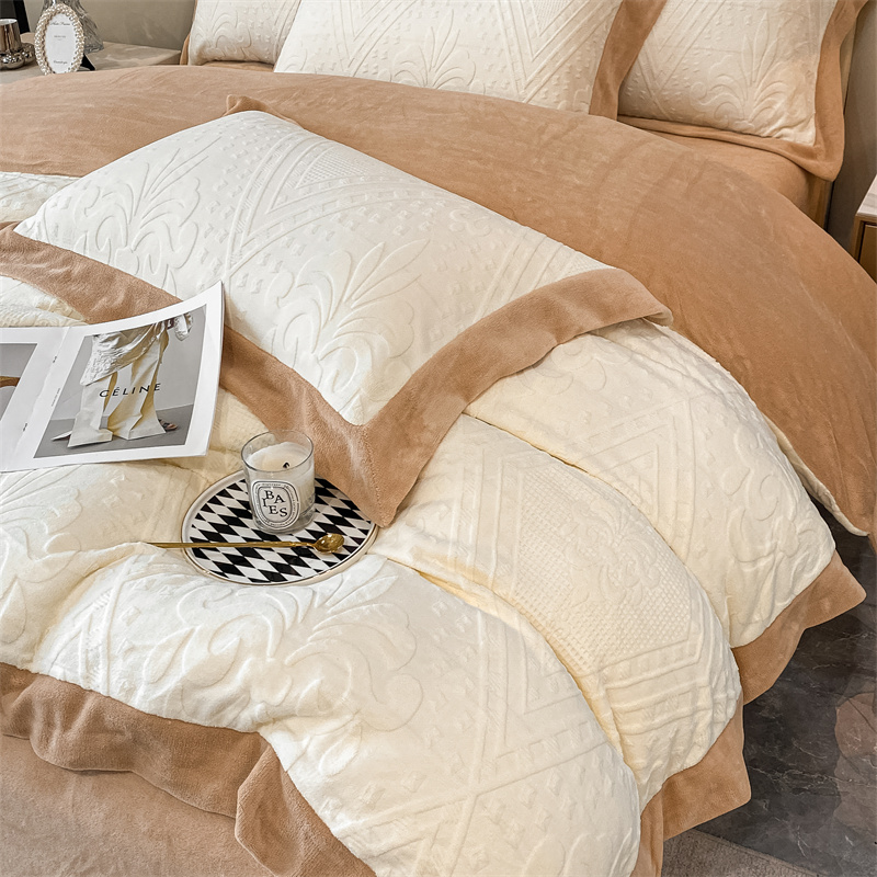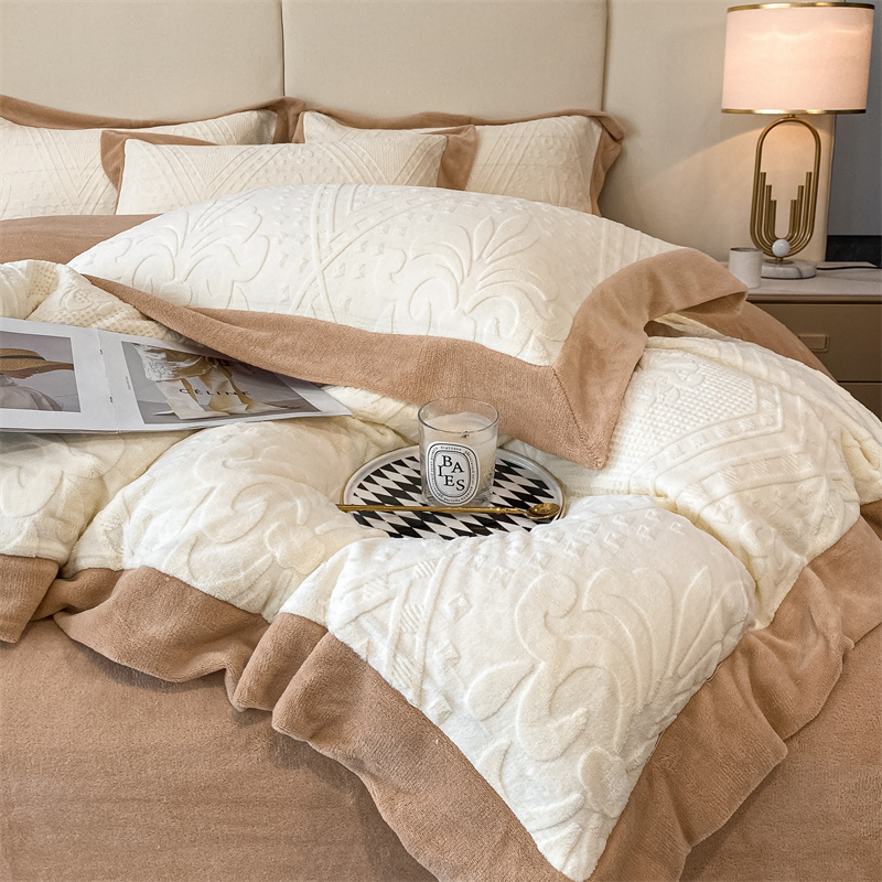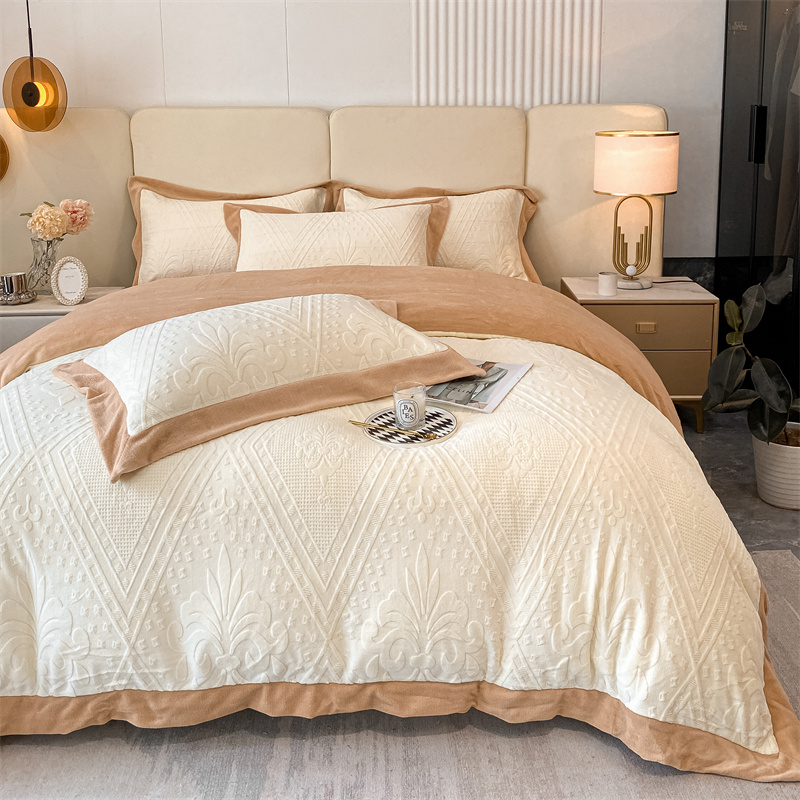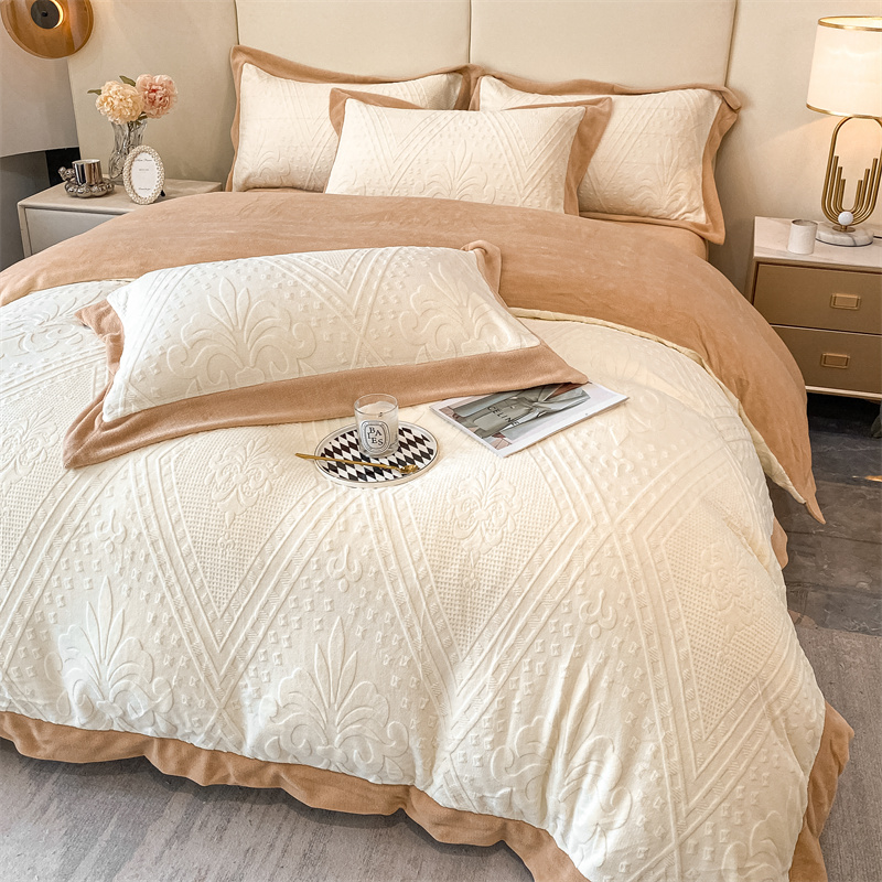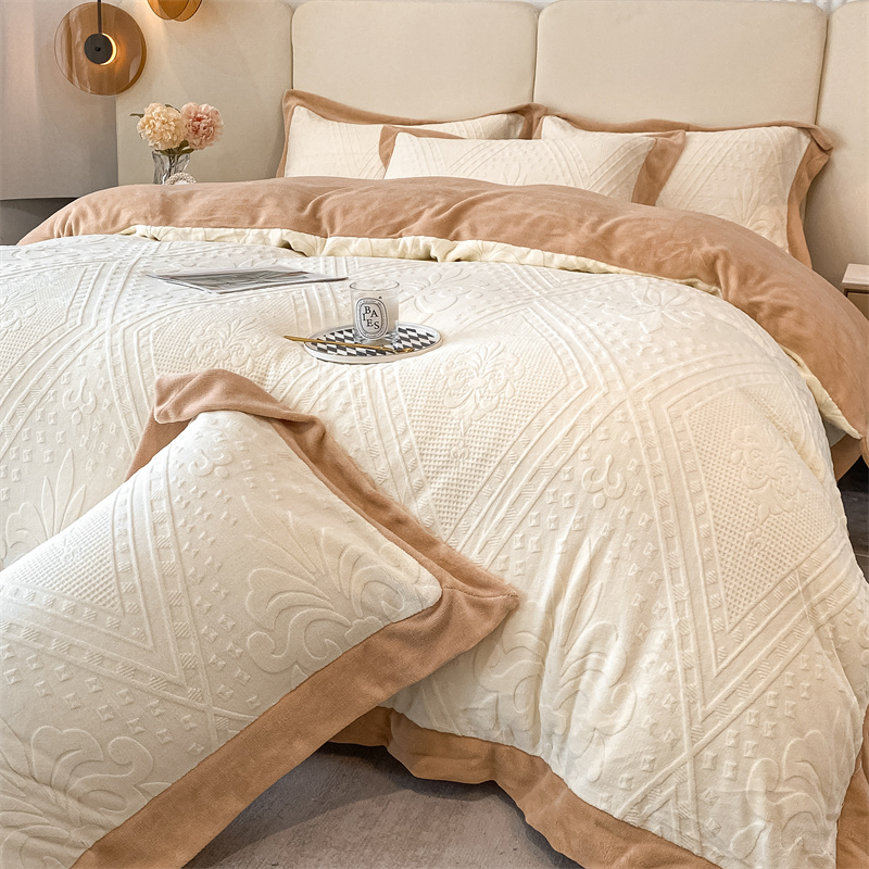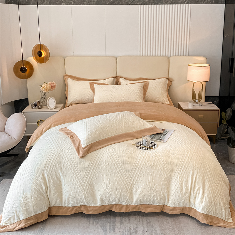(总)金喜 2024新款高克重全消光牛奶绒雕花绒床盖四件套加厚牛奶绒床盖套件--极简主义床盖套件系列,皮粉,石灰,蔚蓝,杏仁