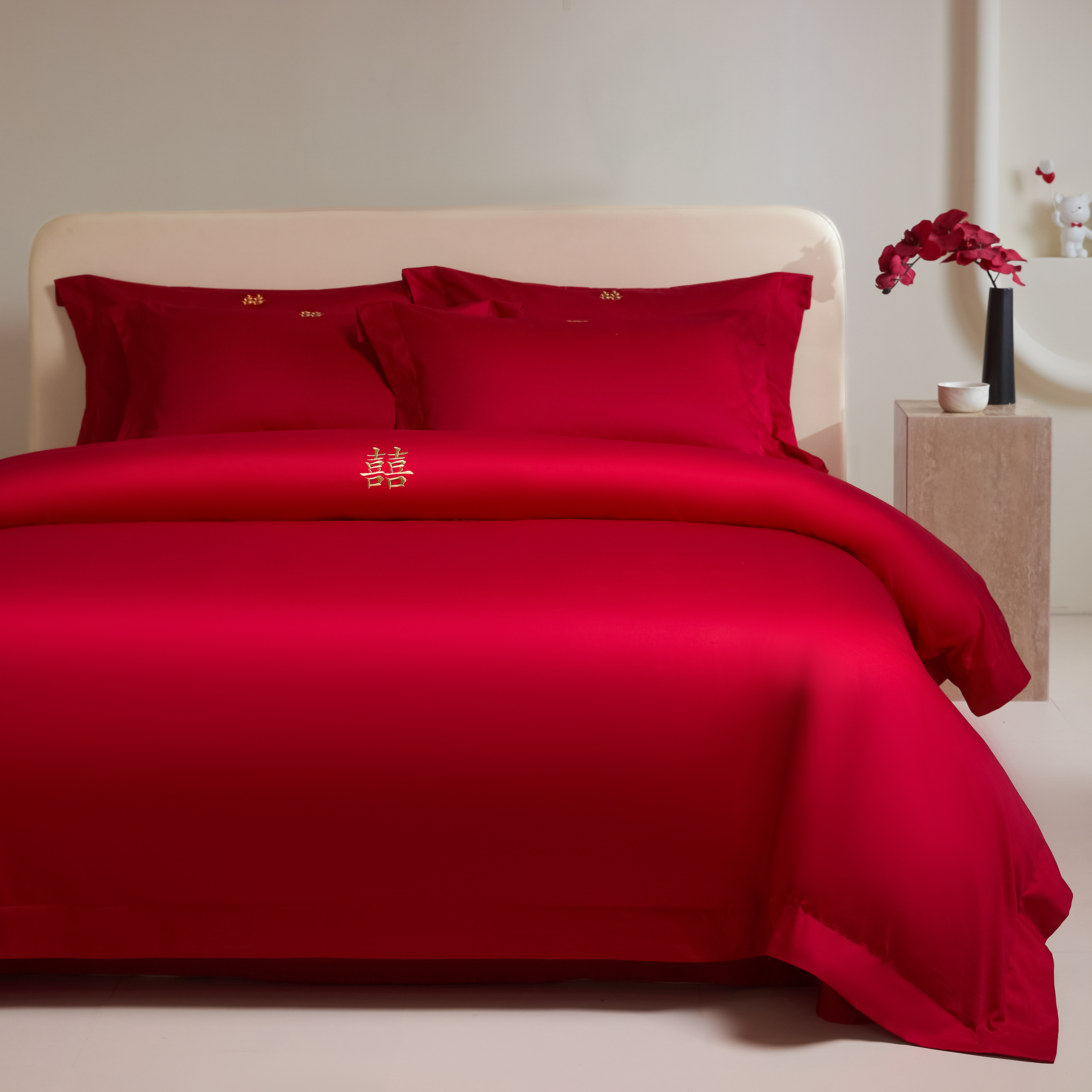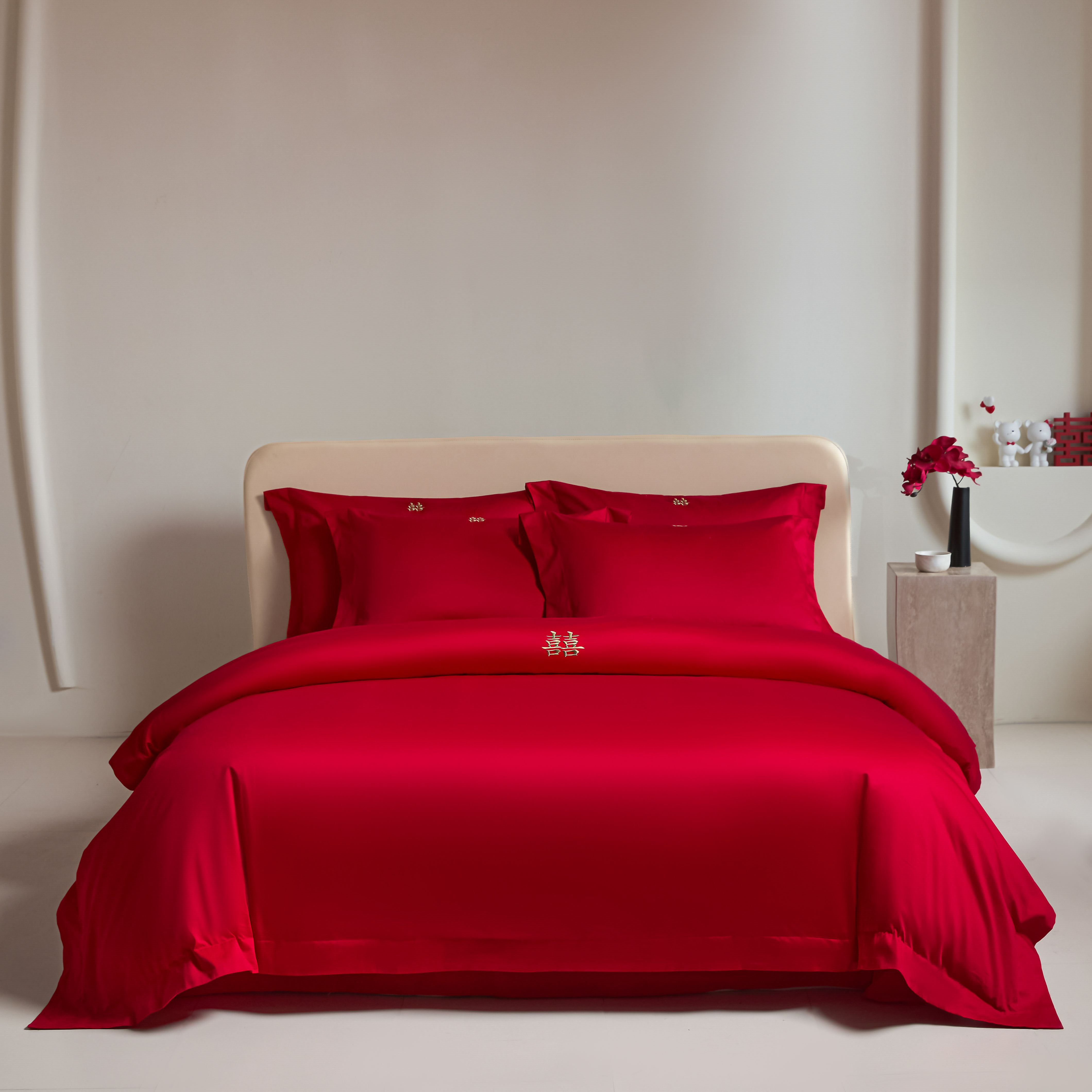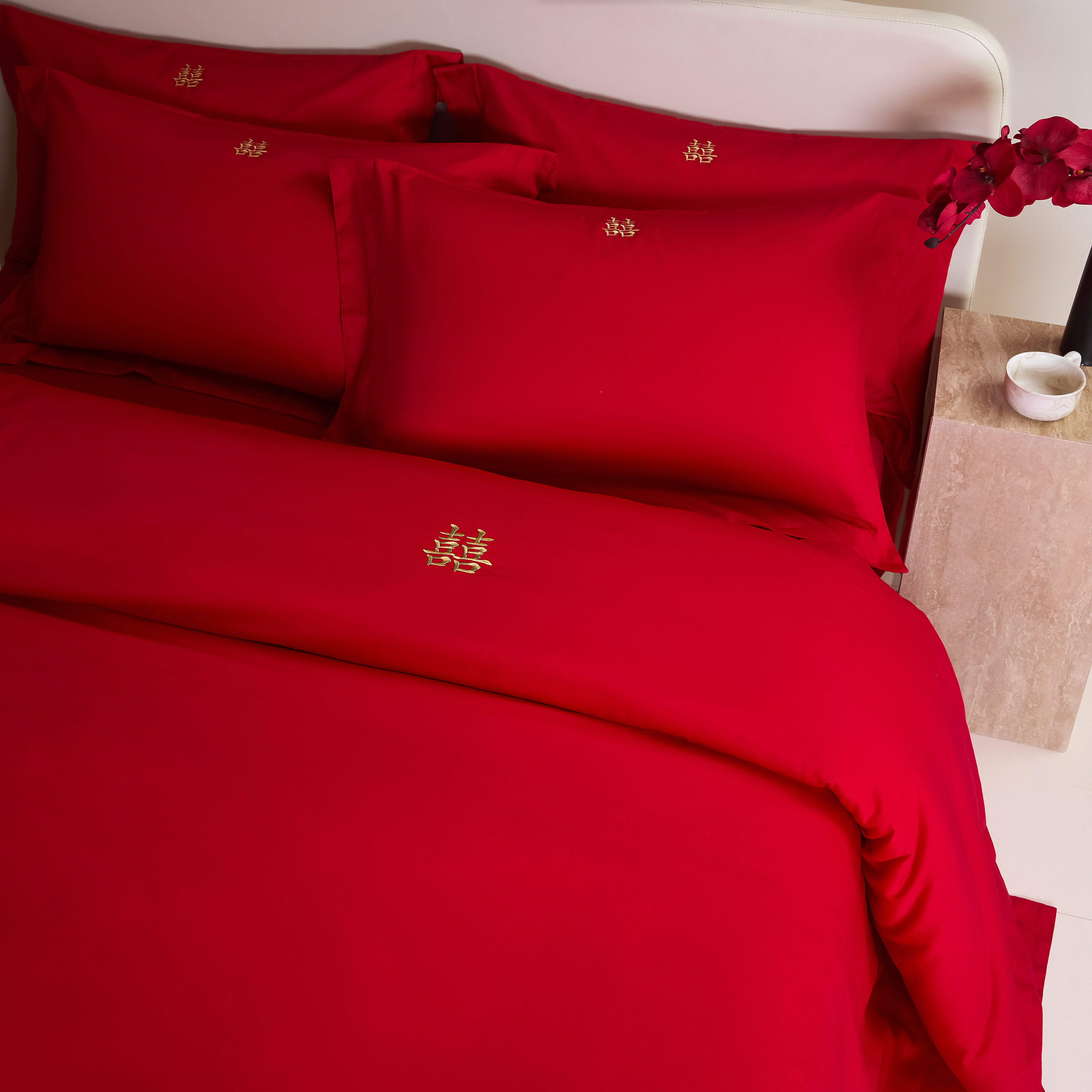 (总)秀色家纺 2025新款高档100支新疆长绒棉婚庆四件套纯棉喜被全棉大红色结婚床单被套-囍