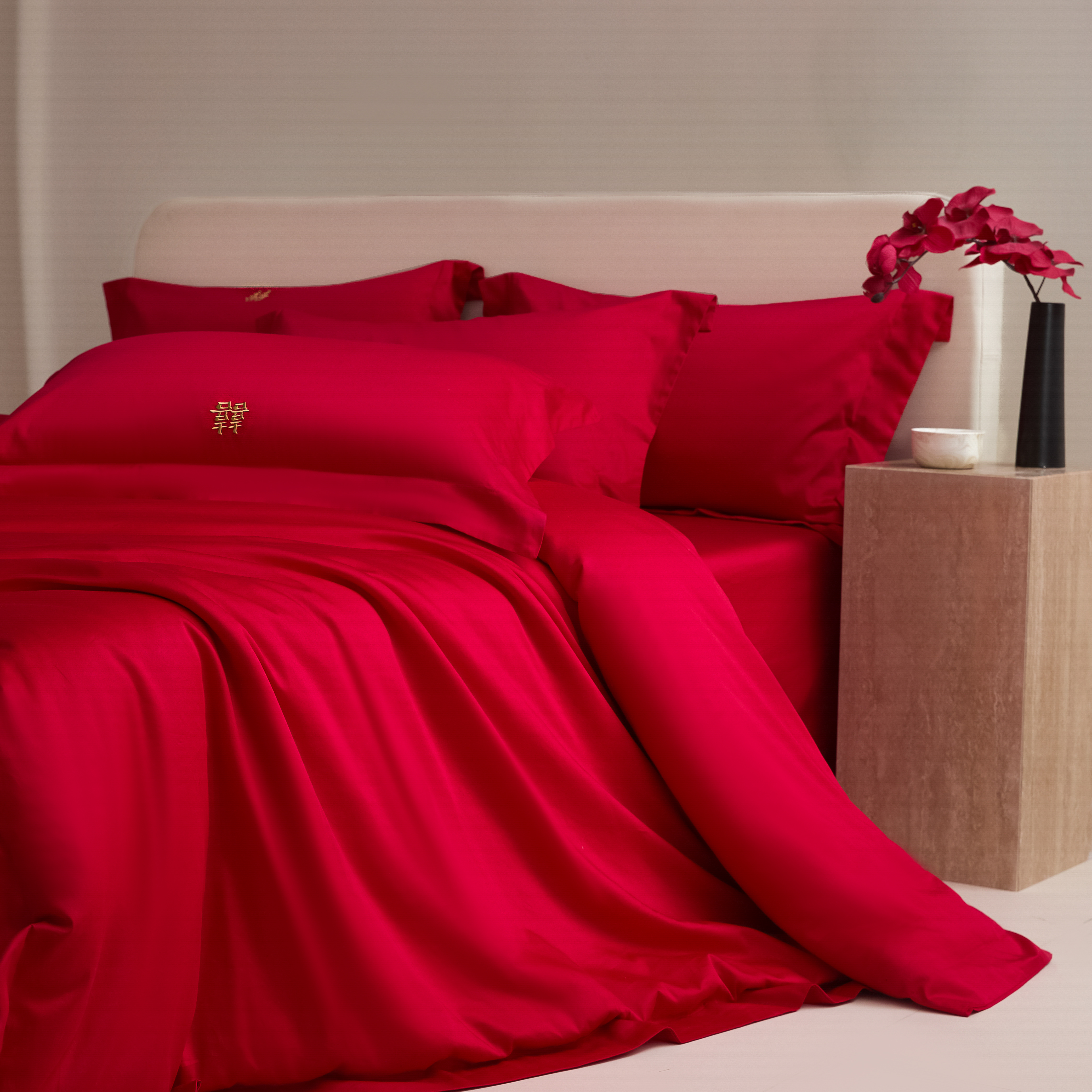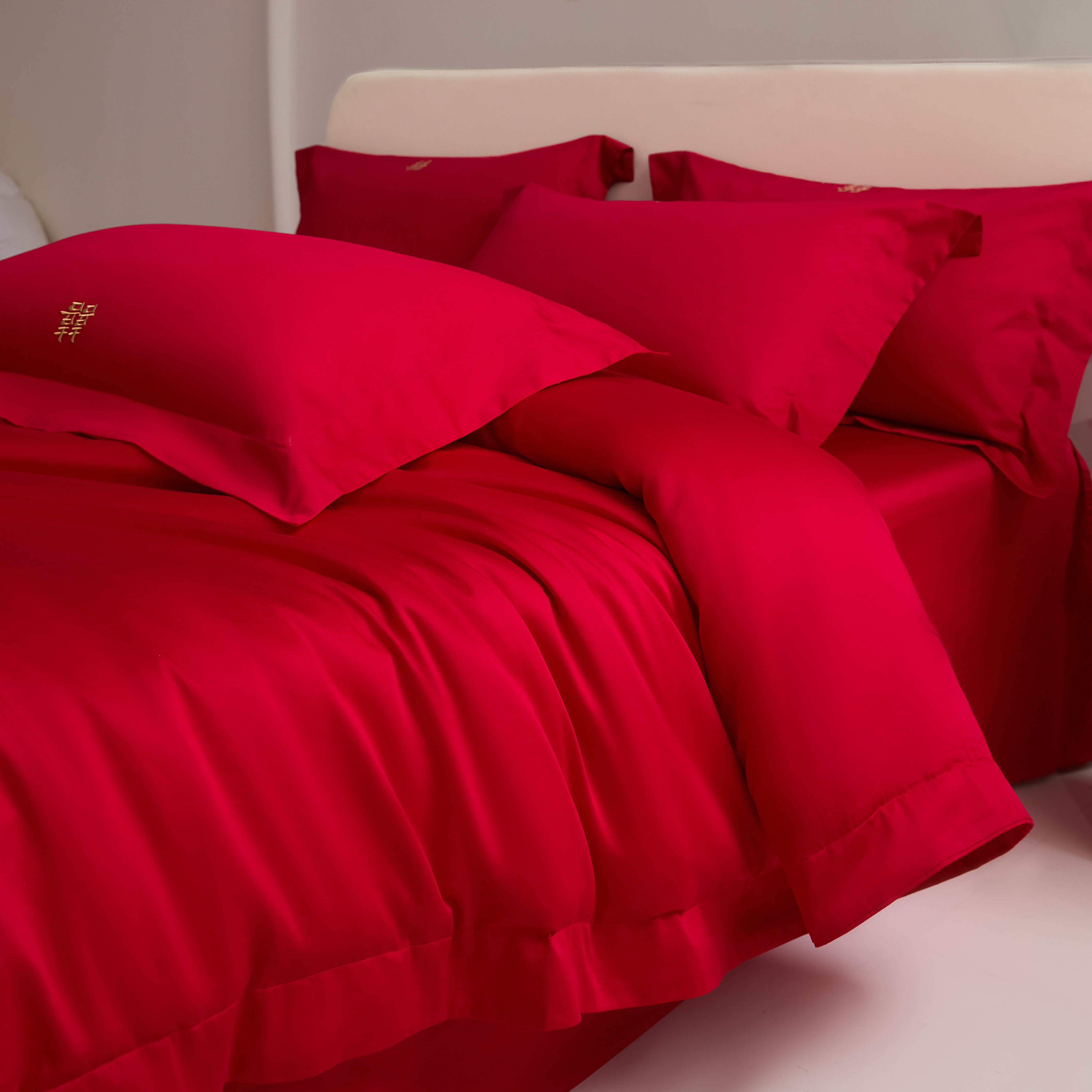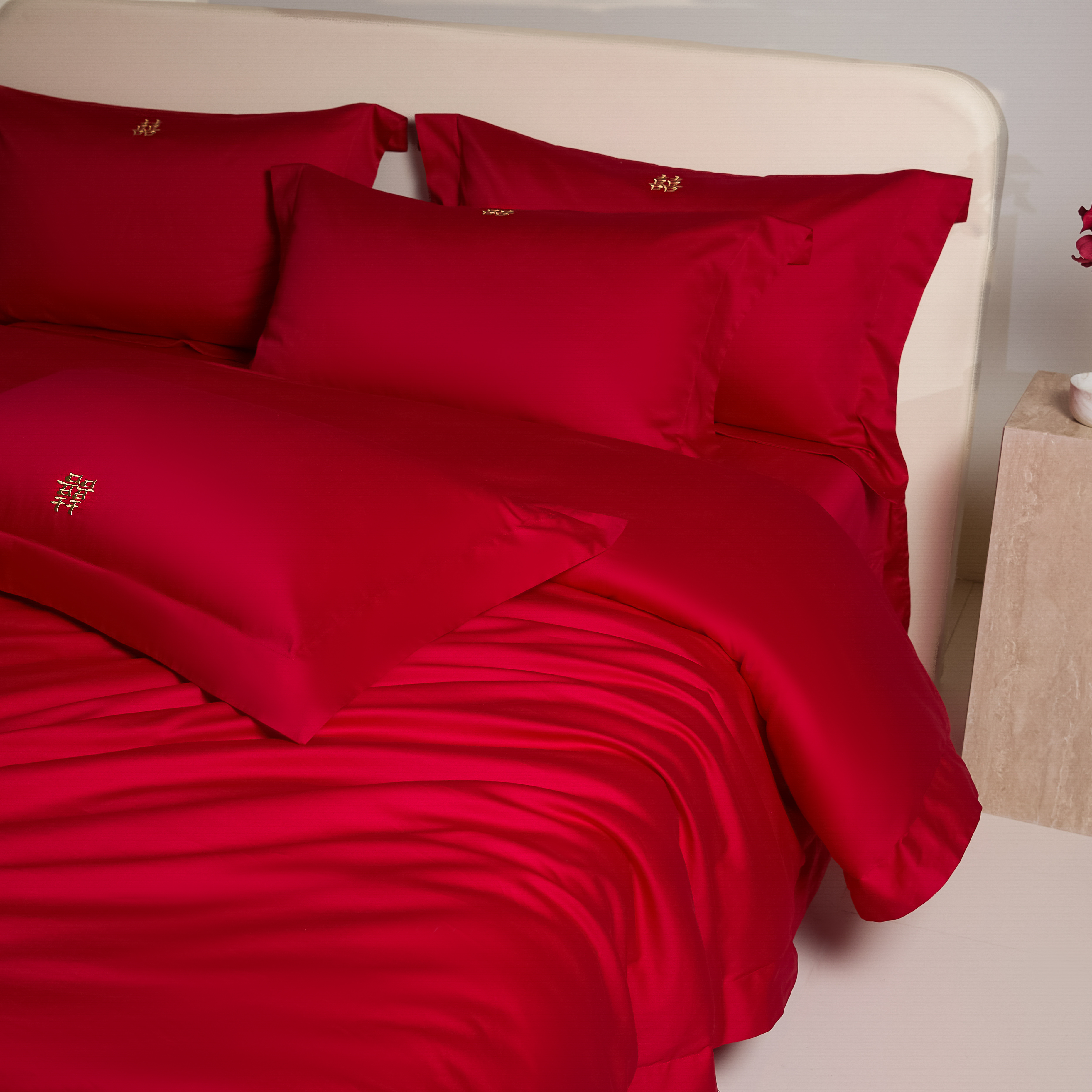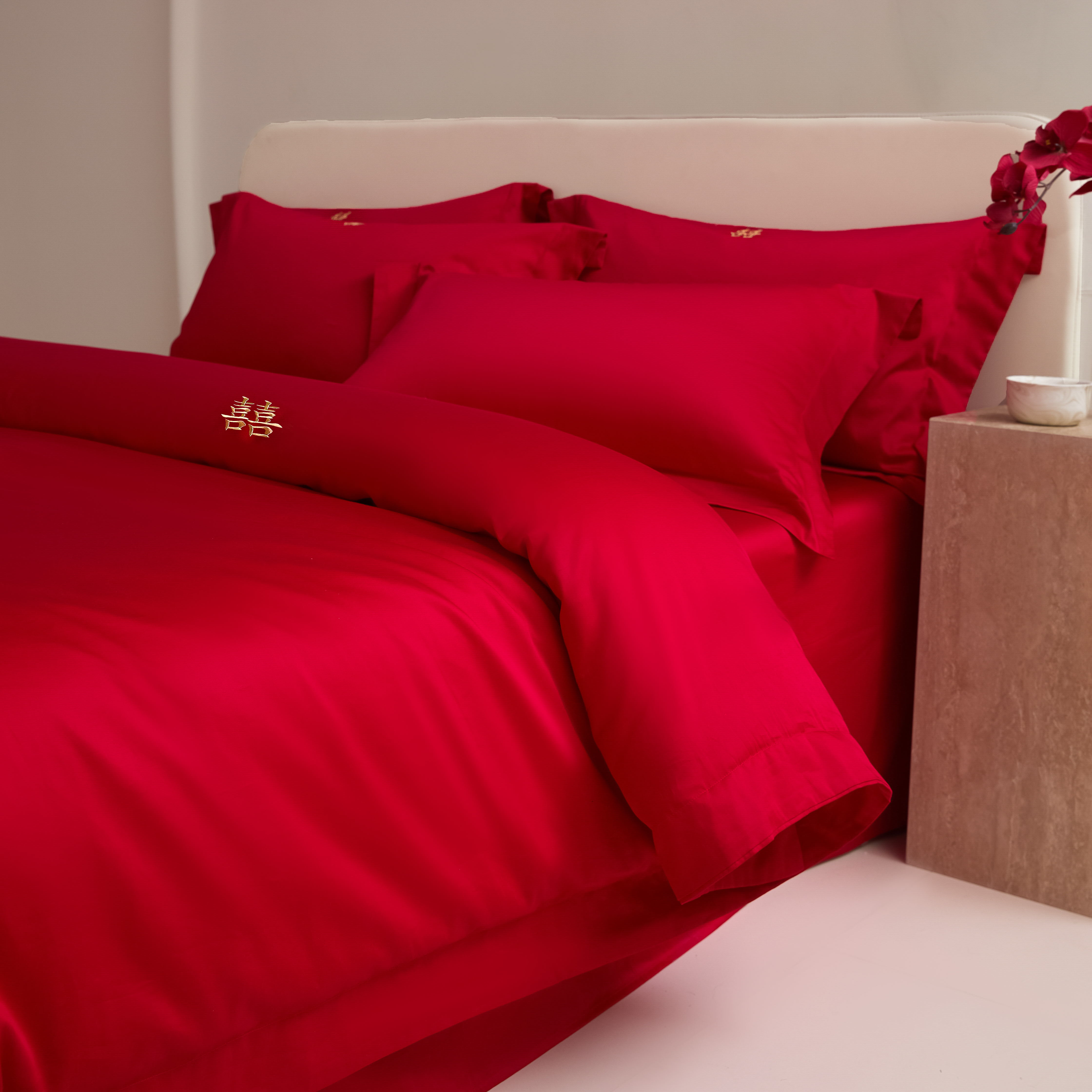 (总)秀色家纺 2025新款高档100支新疆长绒棉婚庆四件套纯棉喜被全棉大红色结婚床单被套-囍