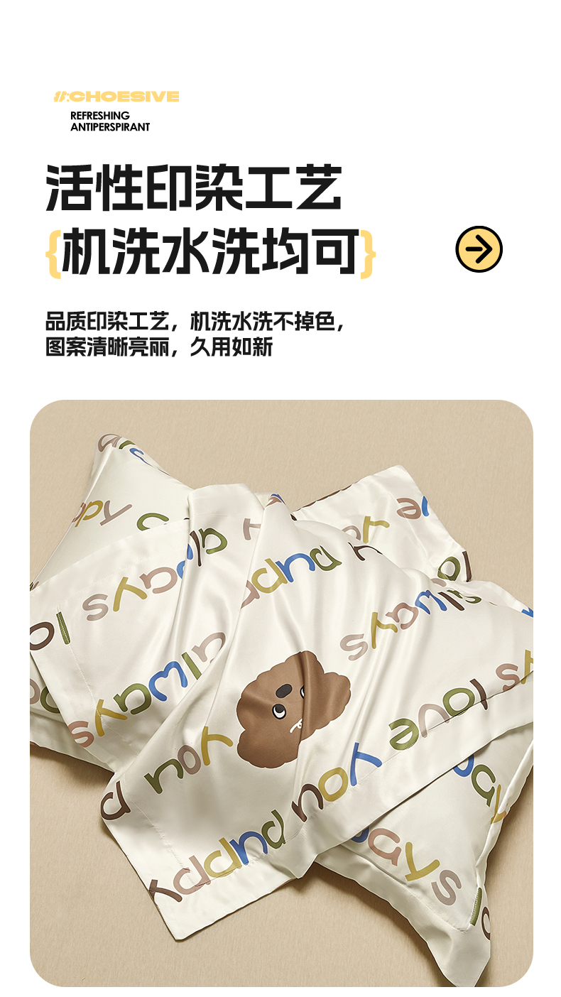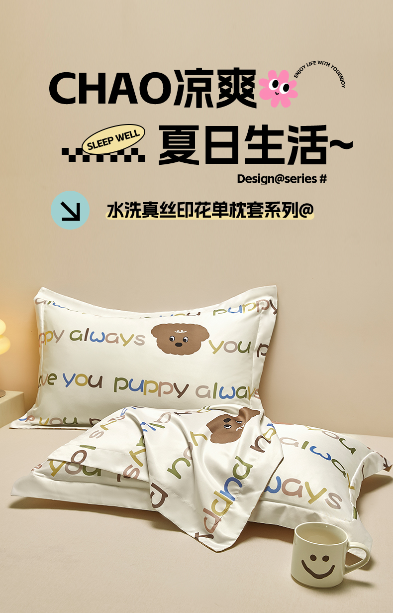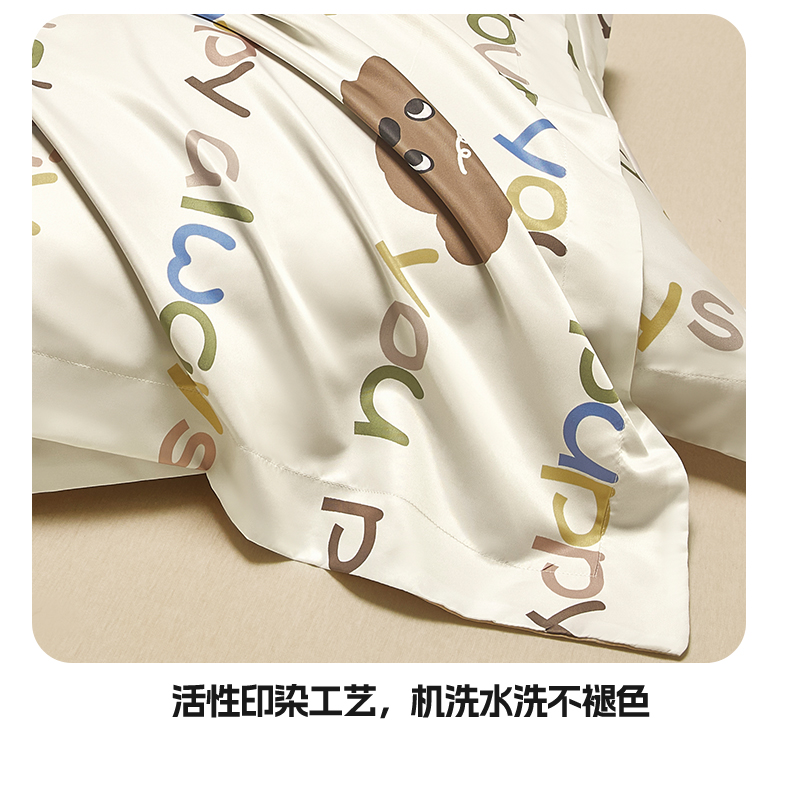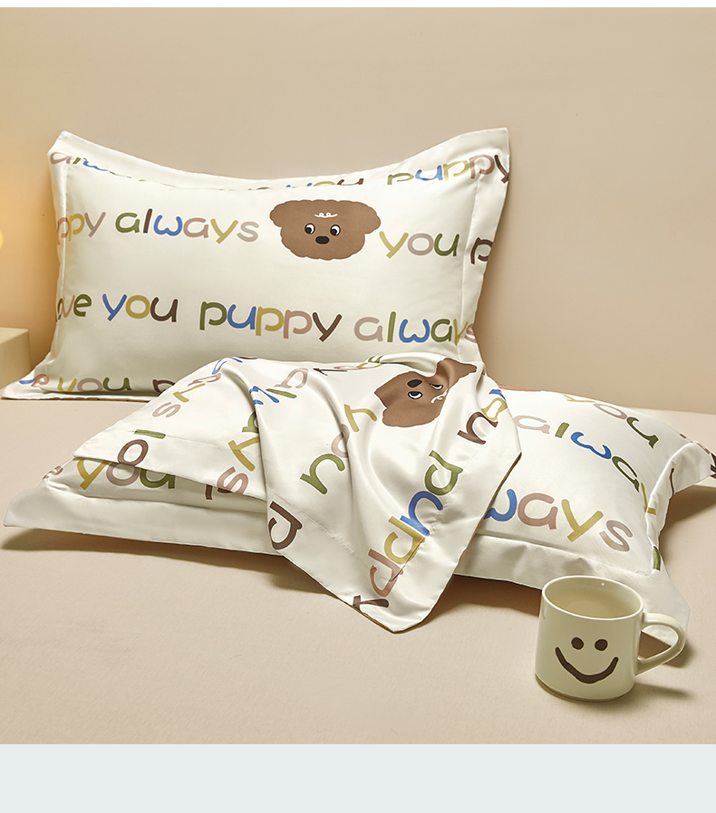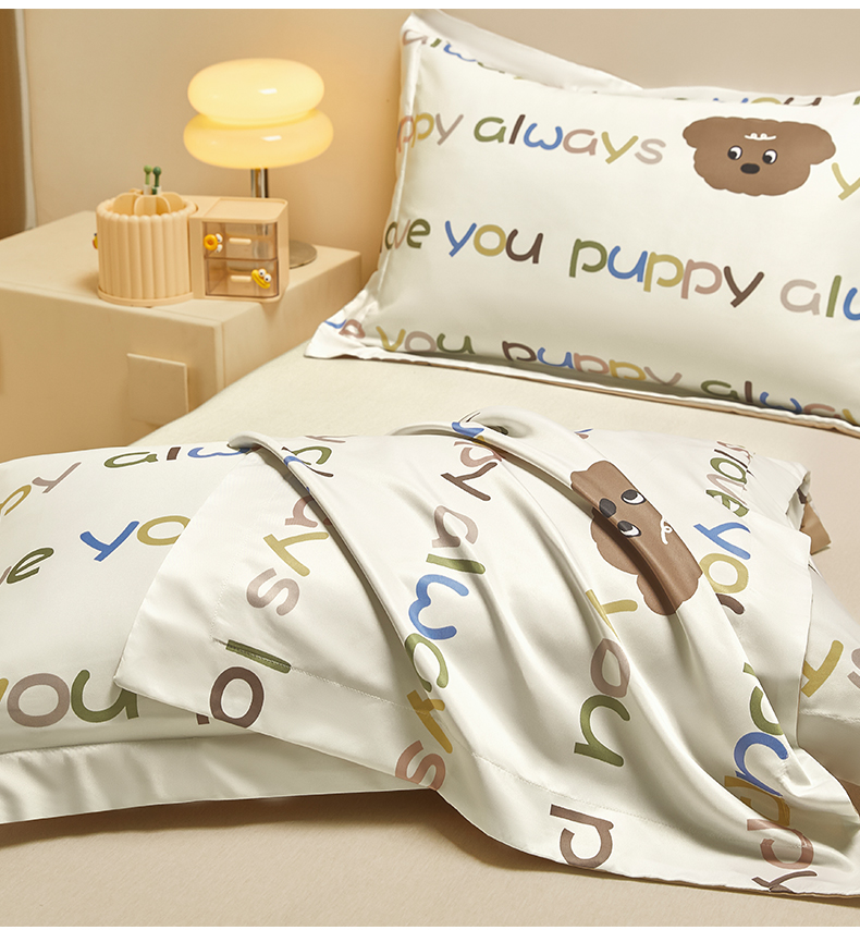 笙意家纺 2025新款水洗真丝数码印花卡通枕套 泰迪狗