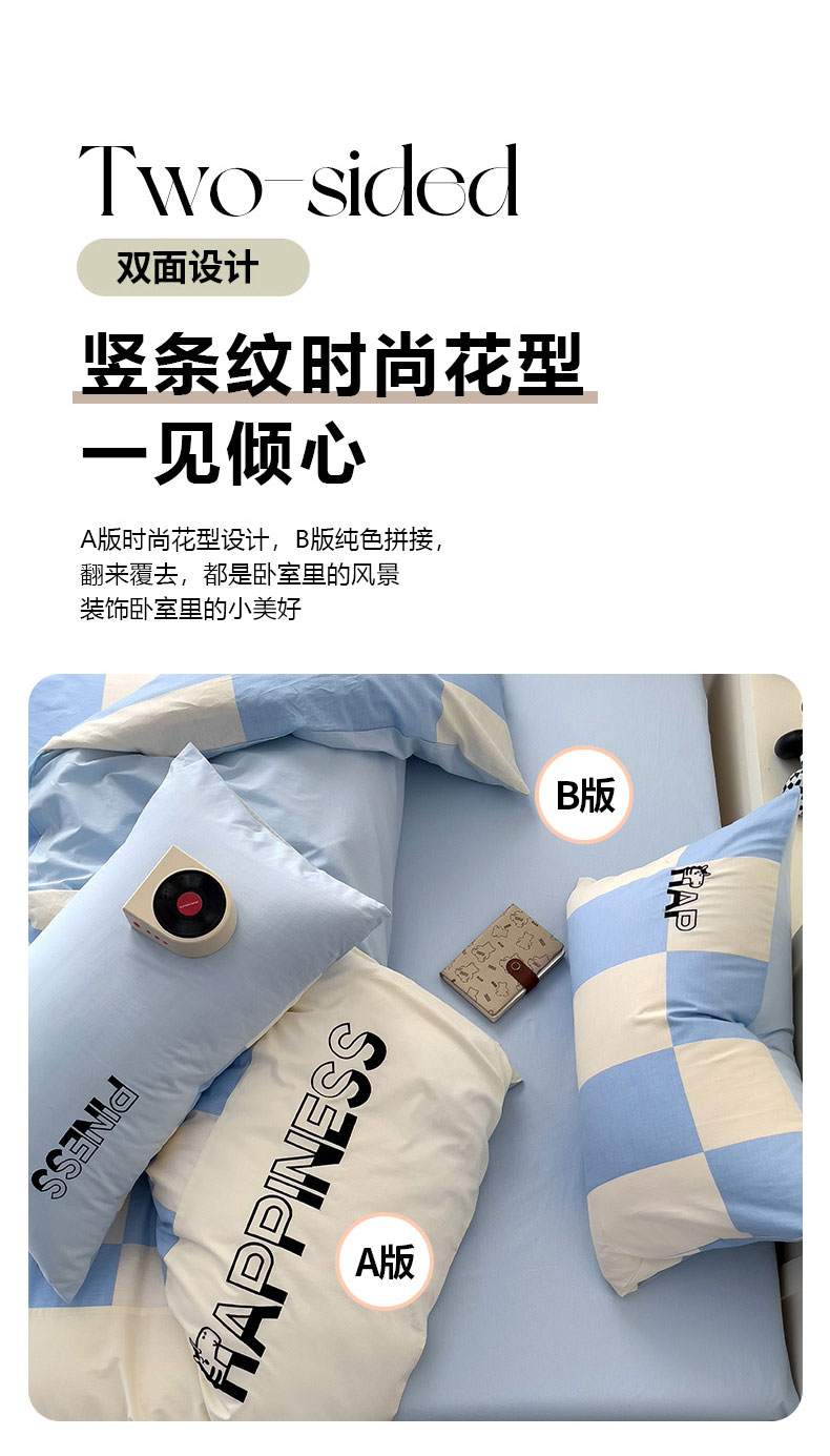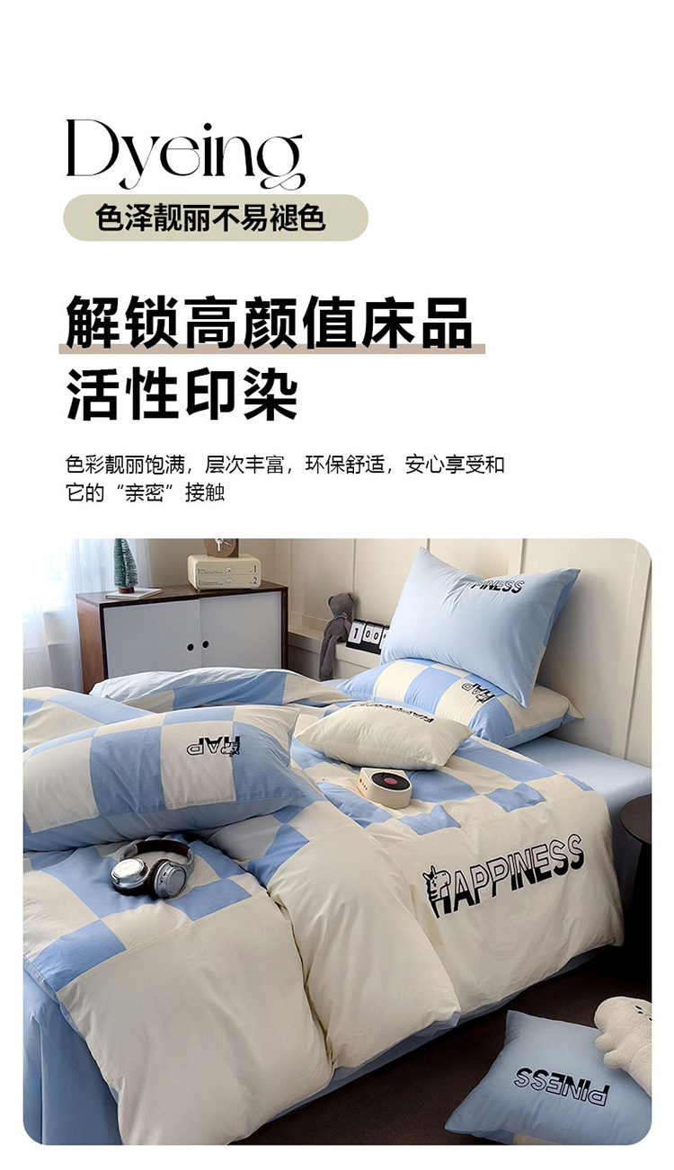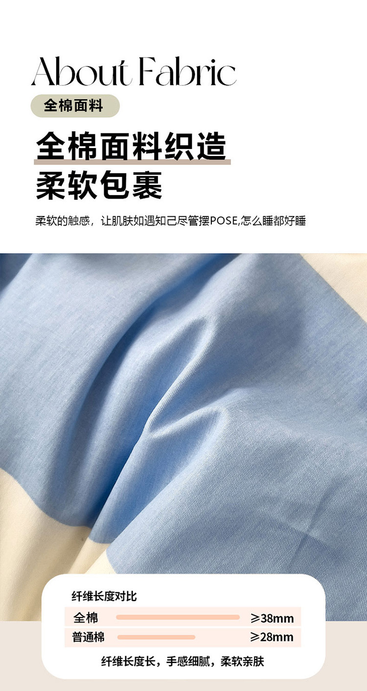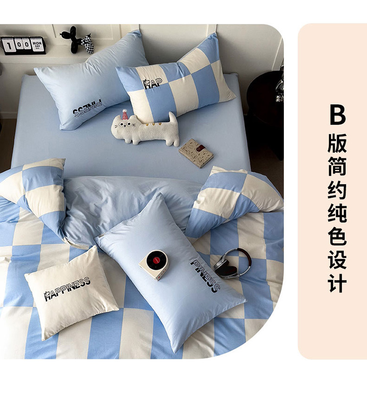 商品名称:娜娜 2025新款全棉拼接条纹绣花四件套 马克-格子蓝
