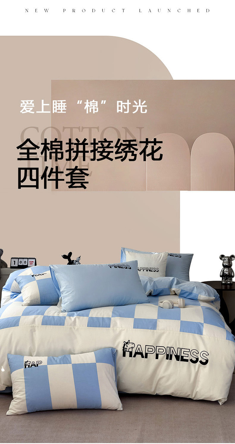 娜娜 2025新款全棉拼接条纹绣花四件套 马克-格子蓝