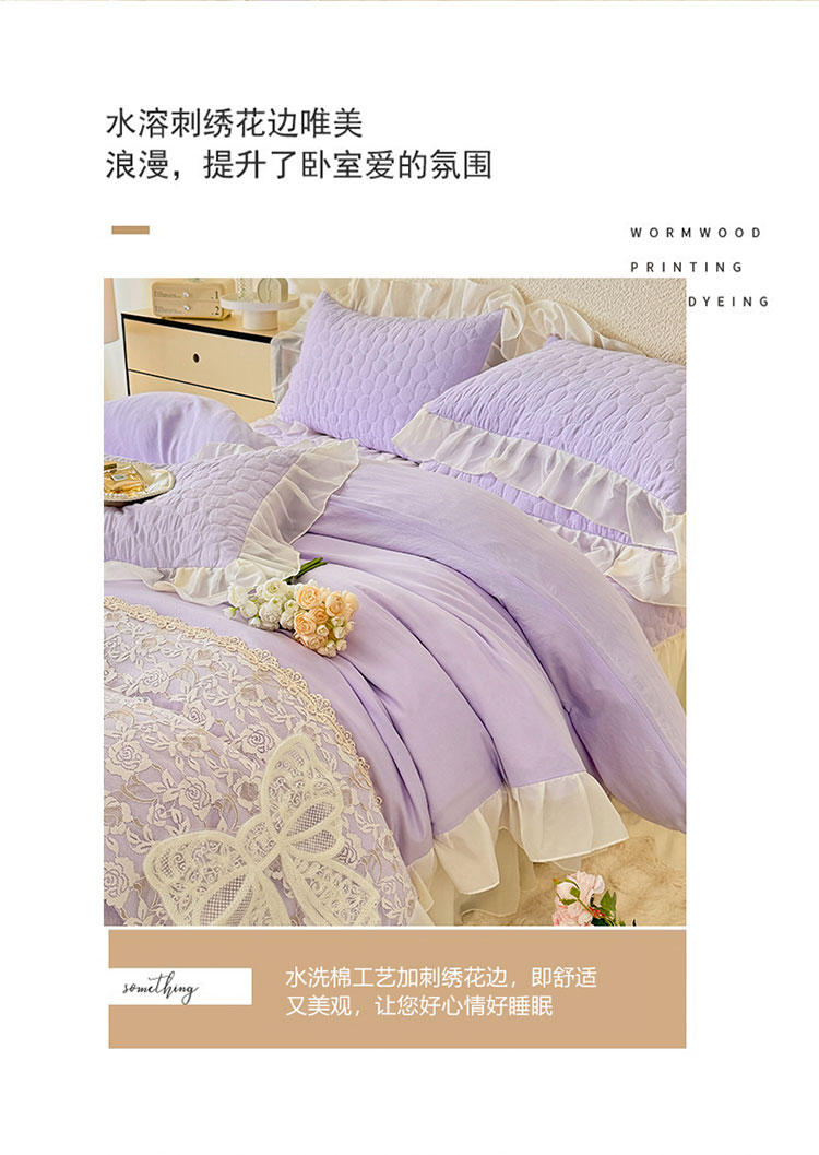 商品名称:2025韩版法式公主风水洗棉立体花绣花床盖款四件套蕾丝床盖款夏被四件套 玛奇朵—梦幻紫