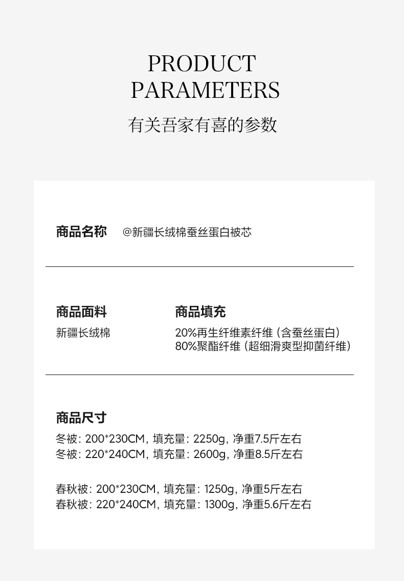 [{"sp_id":11,"sp_name":"\u989c\u8272\u5206\u7c7b","sp_format":2,"sp_list":[{"sp_value_id":645,"sp_value_name":"\u543e\u5bb6\u6709\u559c-\u73cd\u73e0\u767d","sp_value_image":{"id":999,"path":"https:\/\/img3.91jf.com\/ghelp\/2025\/20250228\/edb38669-9d54-4f87-8b33-8d988bab2c4120250228155535463.jpg_30_30.jpg"},"sp_value_video":{"id":0,"img":"","path":"","time":0,"download_num":0,"play_num":0},"price":"190.00","storage":400,"weight":"2.000","is_check_weight":0,"plus_price":"","sp_sort":14}]},{"sp_id":27,"sp_name":"\u5c3a\u5bf8","sp_format":1,"sp_list":[{"sp_value_id":306,"sp_value_name":"200*230cm\u6625\u79cb\u88ab","sp_value_image":{"id":0,"path":""},"sp_value_video":{"id":0,"img":"","path":"","time":0,"download_num":0,"play_num":0},"price":"190.00","storage":100,"weight":"2.000","is_check_weight":0,"plus_price":"","sp_sort":9},{"sp_value_id":307,"sp_value_name":"220*240cm\u6625\u79cb\u88ab","sp_value_image":{"id":0,"path":""},"sp_value_video":{"id":0,"img":"","path":"","time":0,"download_num":0,"play_num":0},"price":"205.00","storage":100,"weight":"1.500","is_check_weight":0,"plus_price":"","sp_sort":10},{"sp_value_id":308,"sp_value_name":"200*230cm\u51ac\u88ab","sp_value_image":{"id":0,"path":""},"sp_value_video":{"id":0,"img":"","path":"","time":0,"download_num":0,"play_num":0},"price":"220.00","storage":100,"weight":"4.000","is_check_weight":0,"plus_price":"","sp_sort":11},{"sp_value_id":309,"sp_value_name":"220*240cm\u51ac\u88ab","sp_value_image":{"id":0,"path":""},"sp_value_video":{"id":0,"img":"","path":"","time":0,"download_num":0,"play_num":0},"price":"235.00","storage":100,"weight":"4.000","is_check_weight":0,"plus_price":"","sp_sort":12}]}]