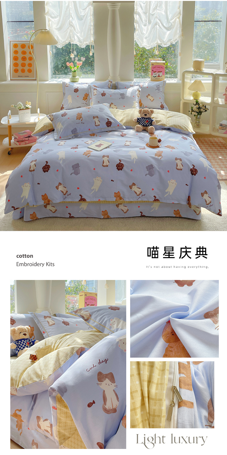 铭博家纺 新款直播爆款网红全棉四件套13070印花吊边一字绣纯棉被套工艺款 喵星庆典