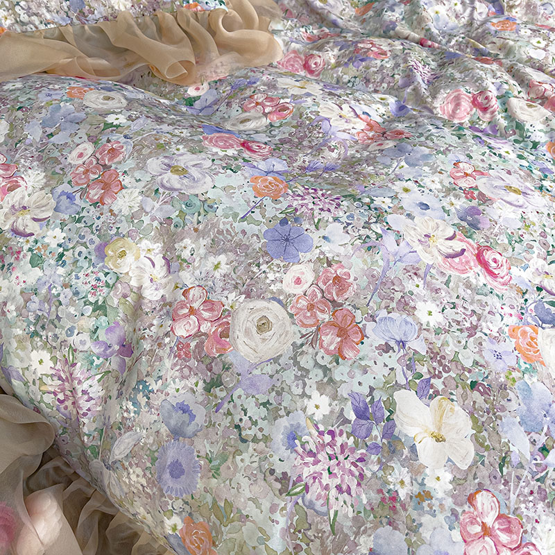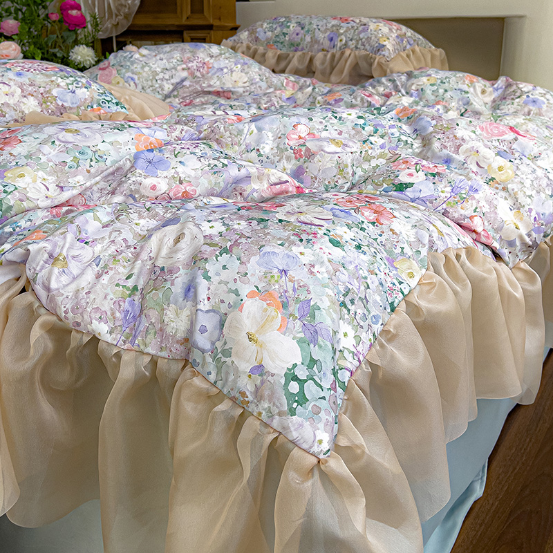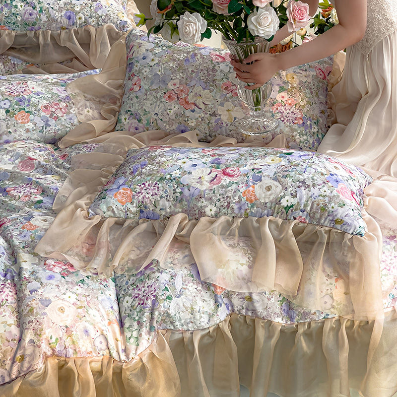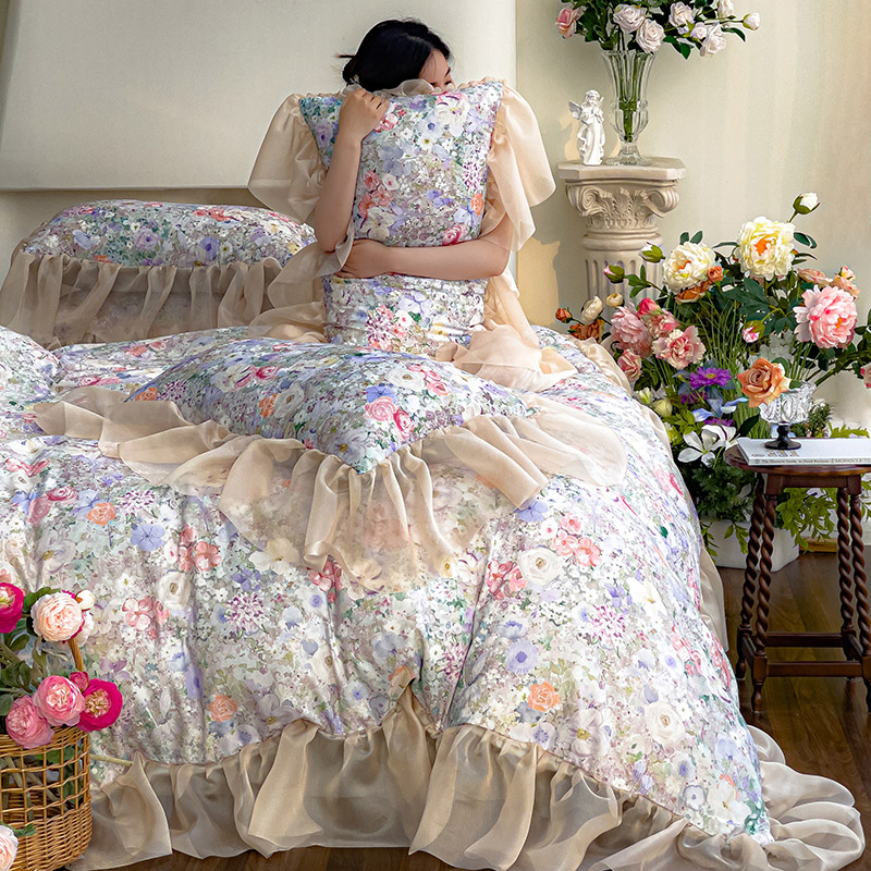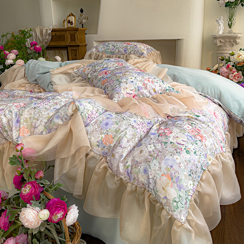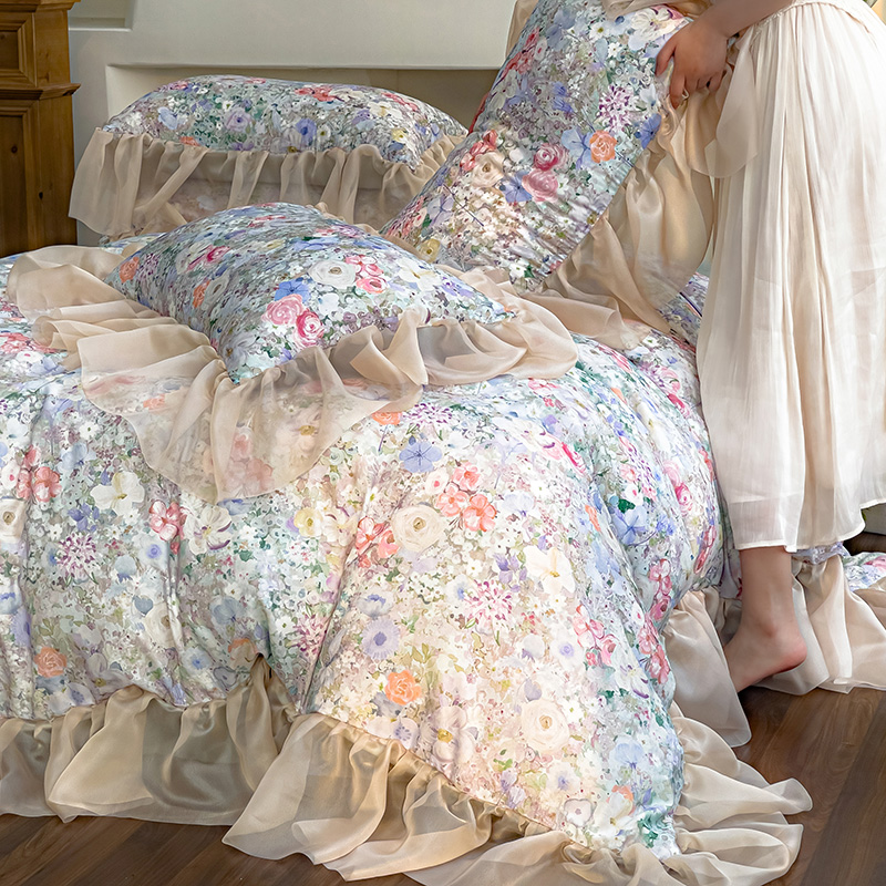 商品名称:赛丽雅 2025新款法式浪漫花边款公主风荷叶边高级田园风四件套 海德林-青色