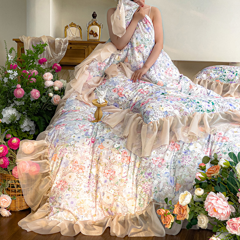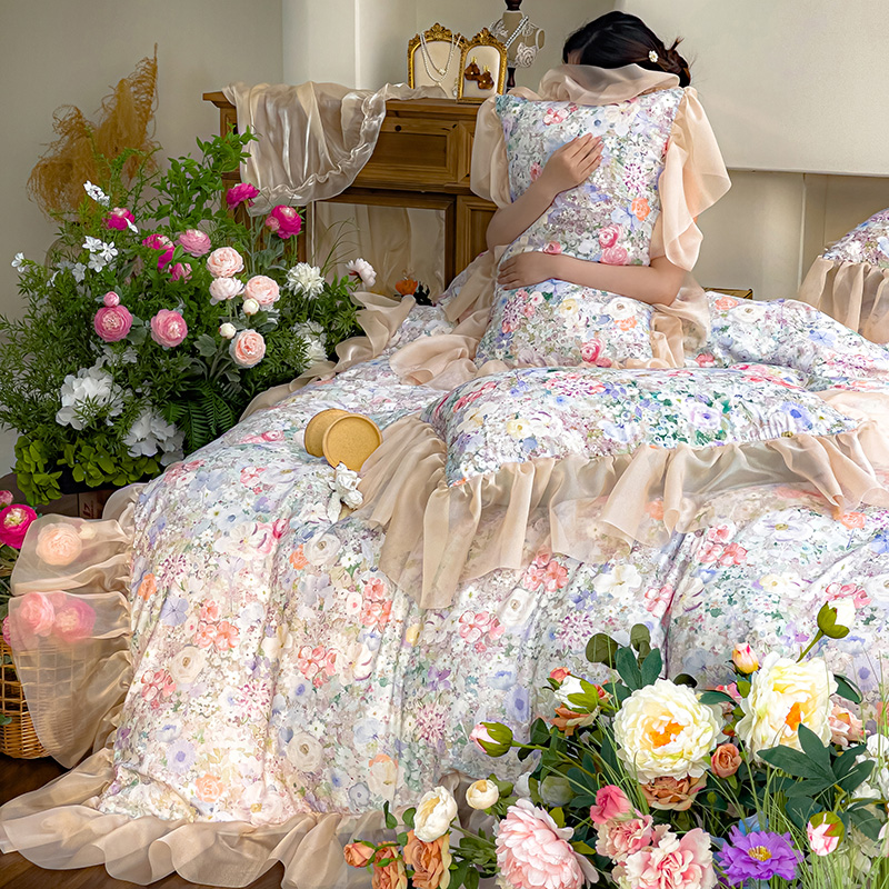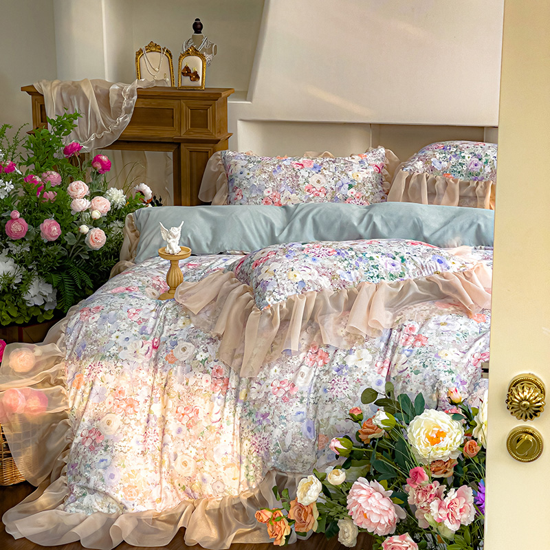 赛丽雅 2025新款法式浪漫花边款公主风荷叶边高级田园风四件套 海德林-青色
