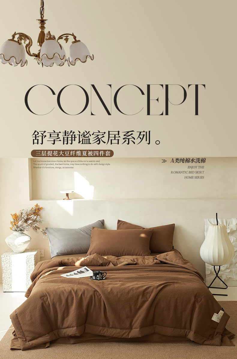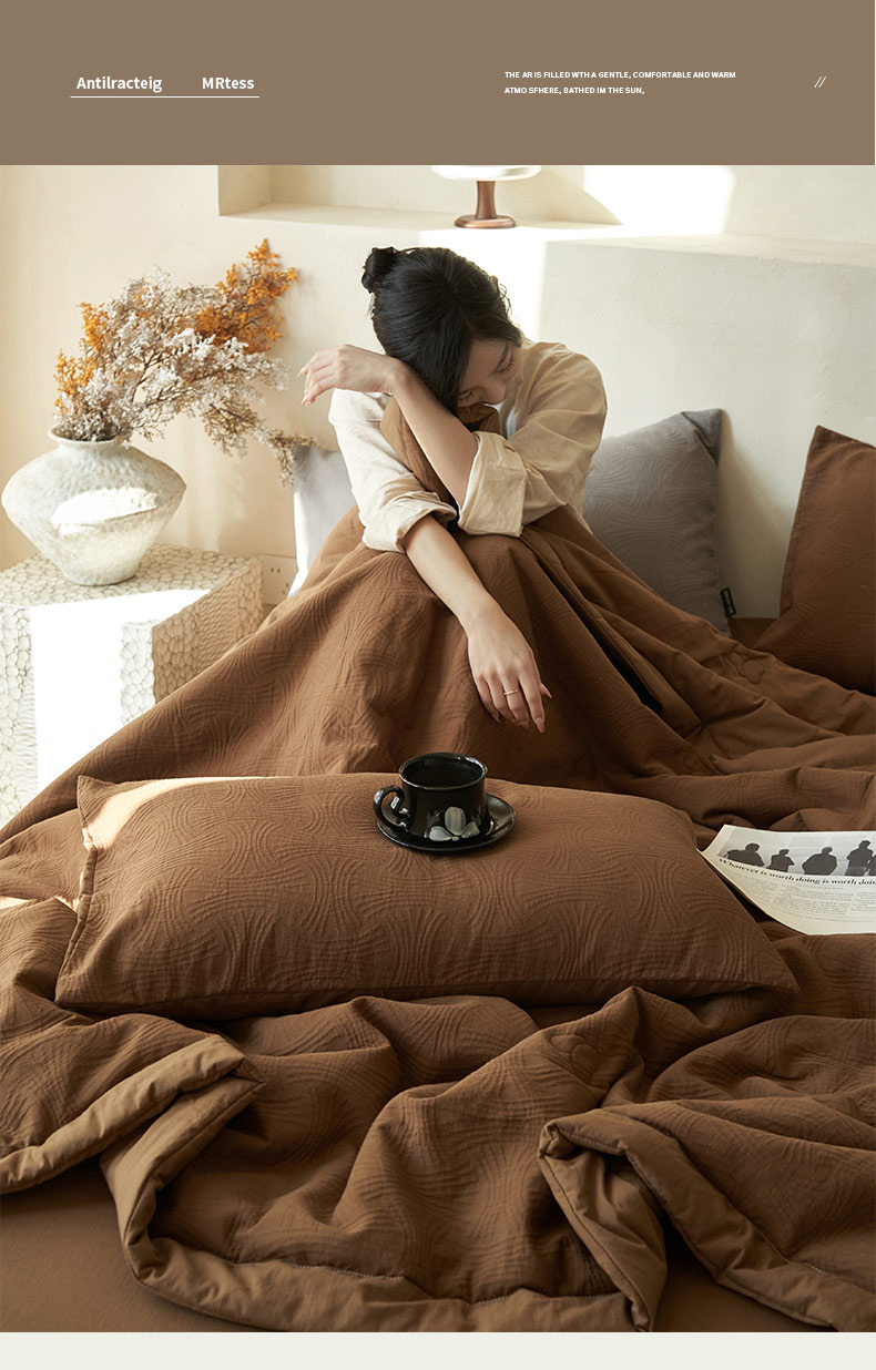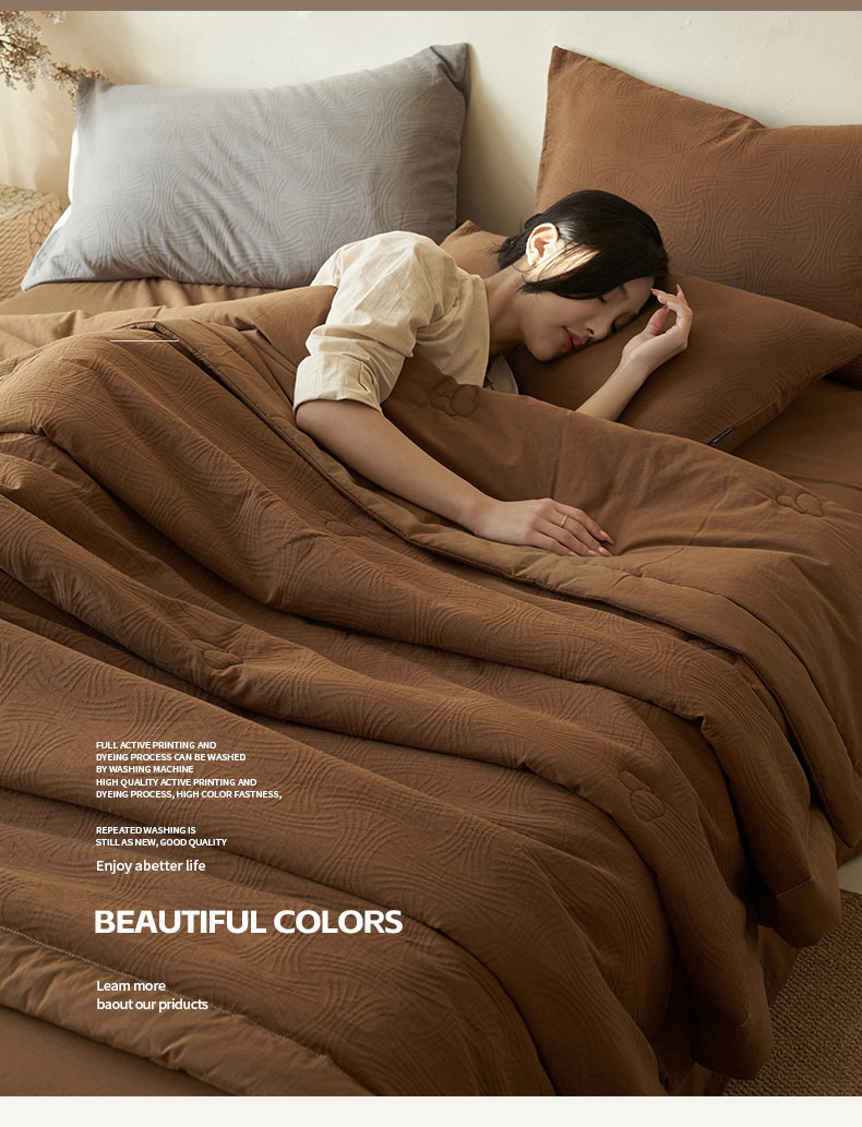 • 91家纺网 家纺一手货源 找家纺 寐绸家纺 2025新款纯棉水洗棉三层提花大豆纤维夏被四件套 线球纹夏被-焦糖