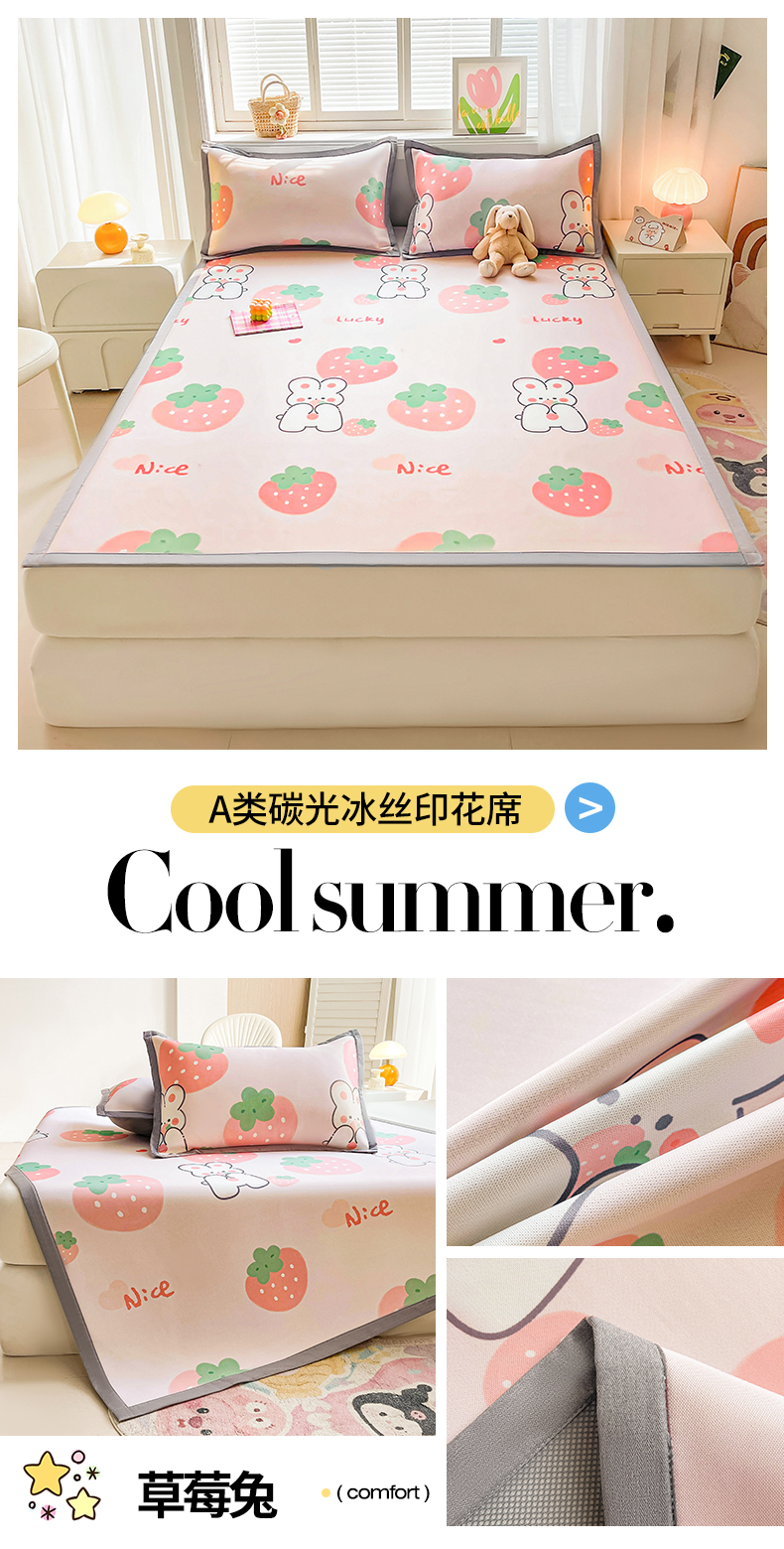 当前位置: 91家纺网 > 商品网购 > 床品套件 > 四件套 > 夏被四件套 > 2025新款A类碳光冰丝印花凉席学生床席空调被夏被四件套配送买家秀 彩虹草莓