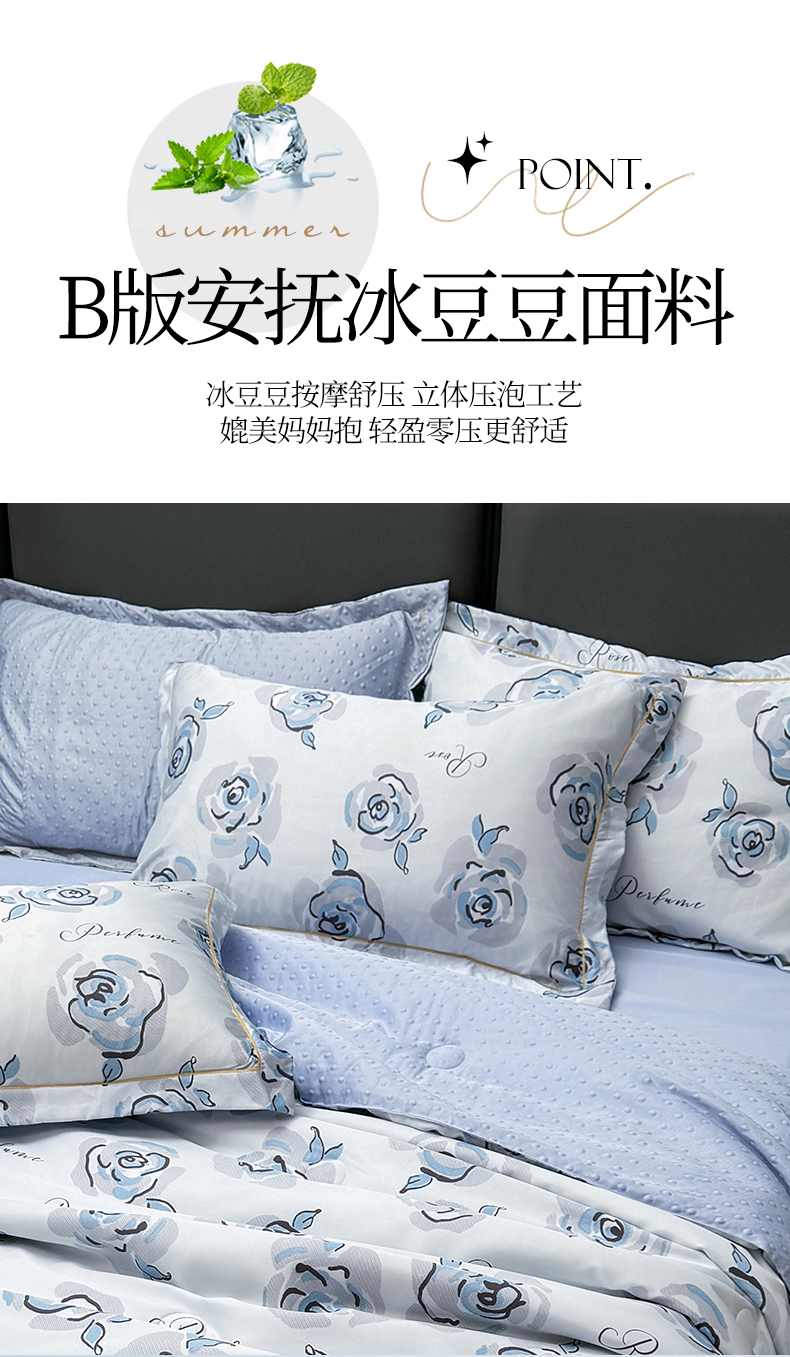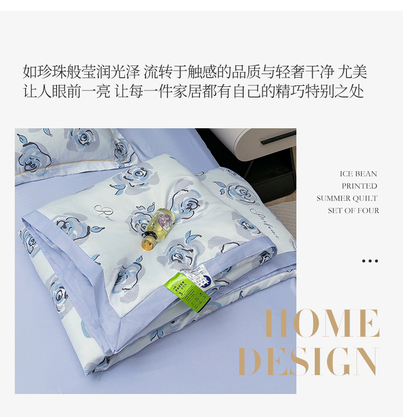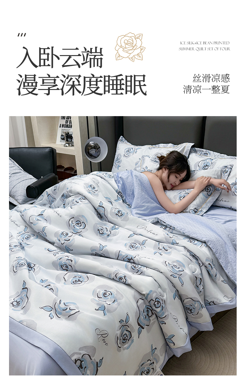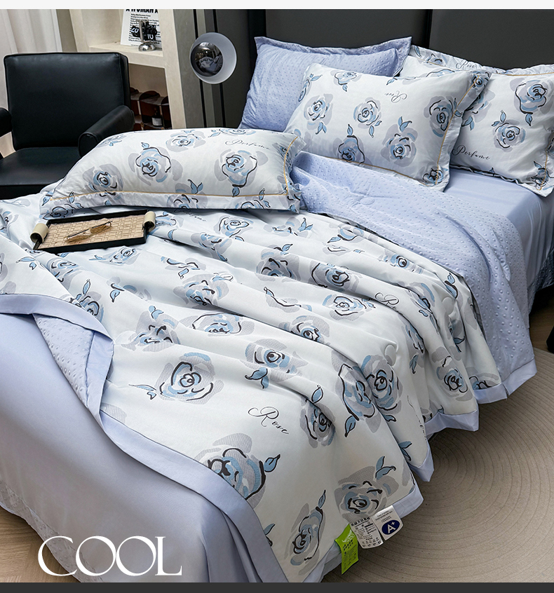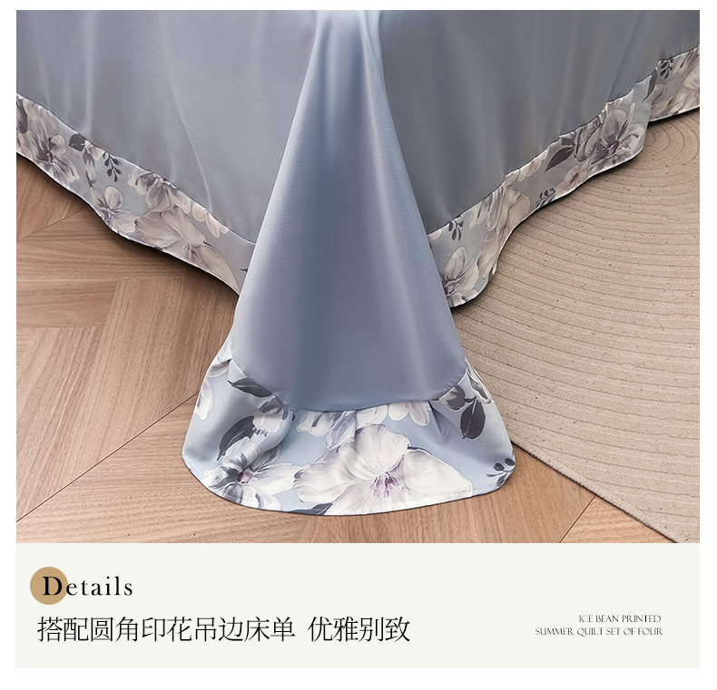 当前位置: 91家纺网 > 商品网购 > 床品套件 > 四件套 > 夏被四件套 > 满羽家纺 2025热款冰丝绸冰豆豆被夏被四件套凉感空调被(踩棉工艺)(吊边床单)-印花 浅艺 浅兰