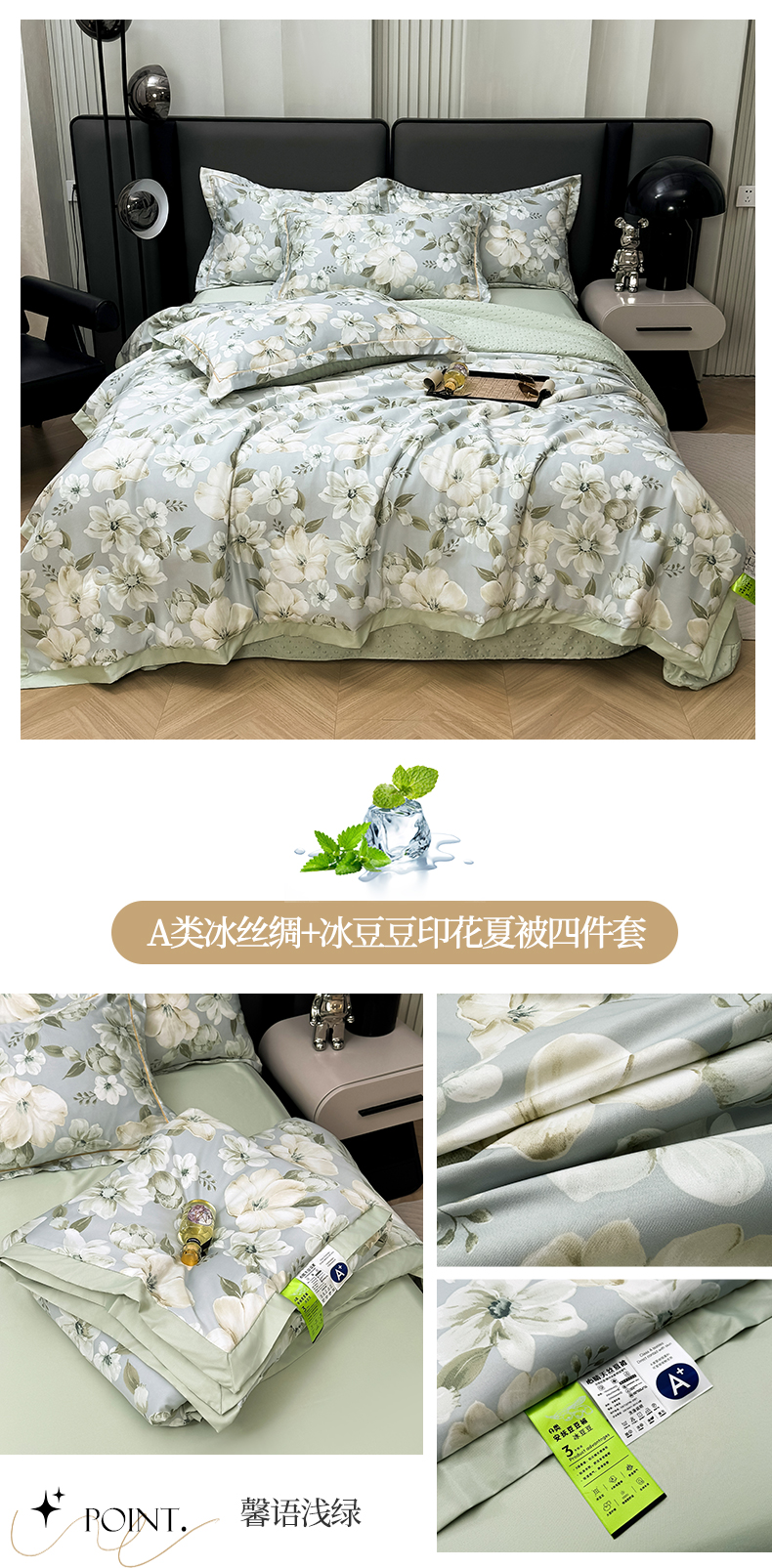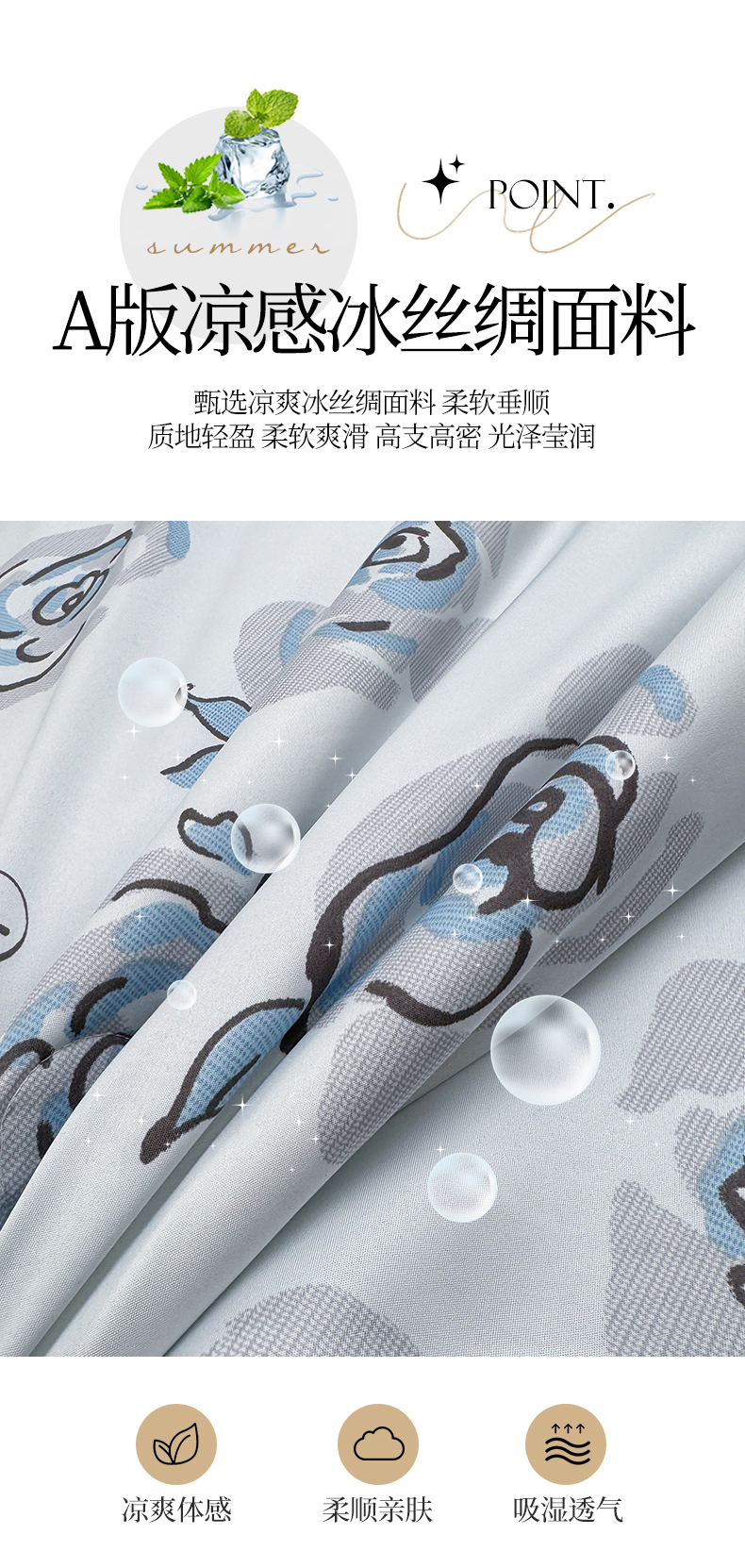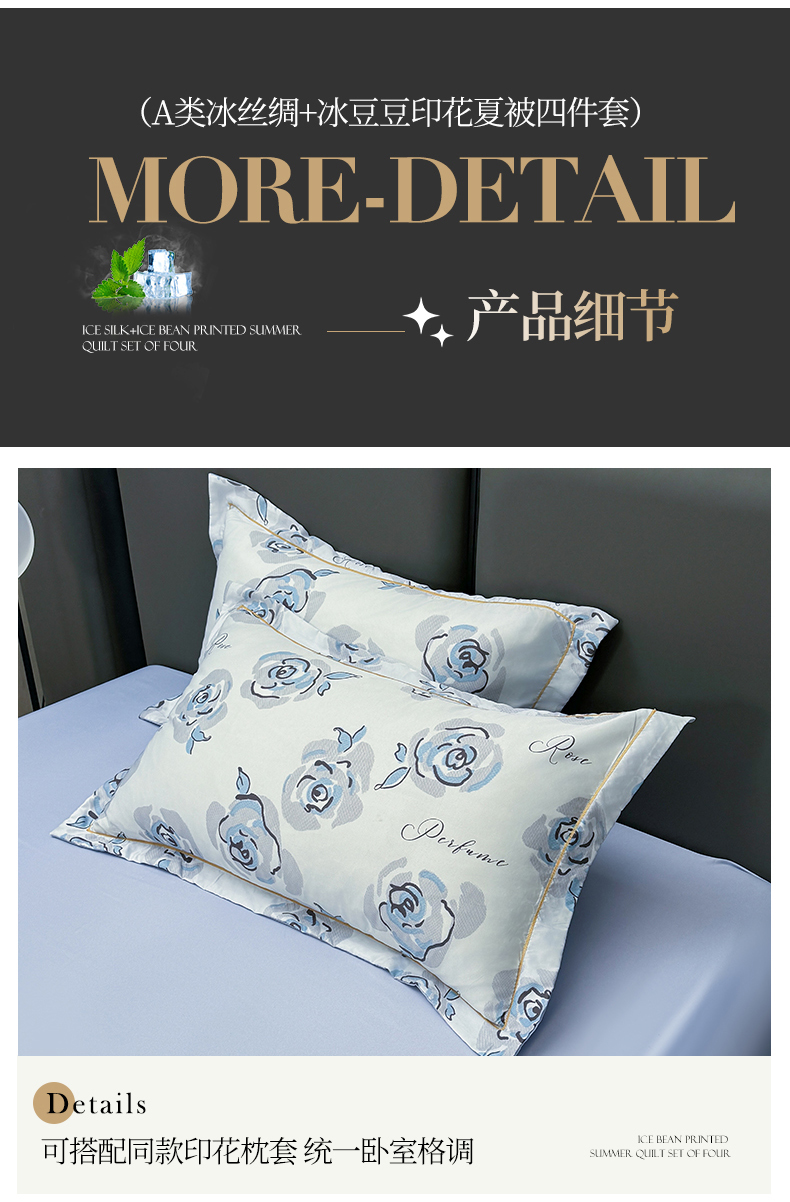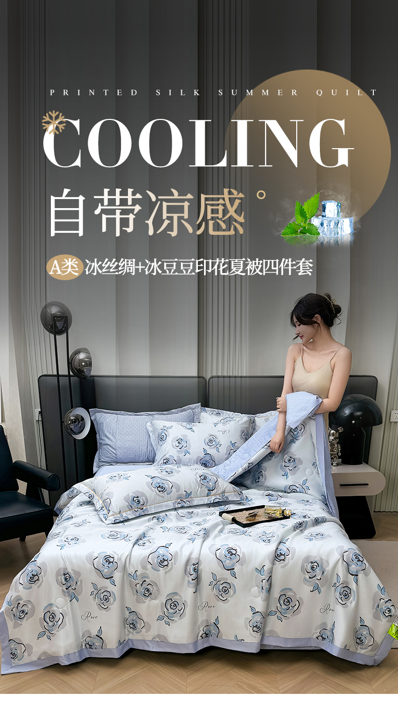 当前位置: 91家纺网 > 商品网购 > 床品套件 > 四件套 > 夏被四件套 > 满羽家纺 2025热款冰丝绸冰豆豆被夏被四件套凉感空调被(踩棉工艺)(吊边床单)-印花 浅艺 浅兰
