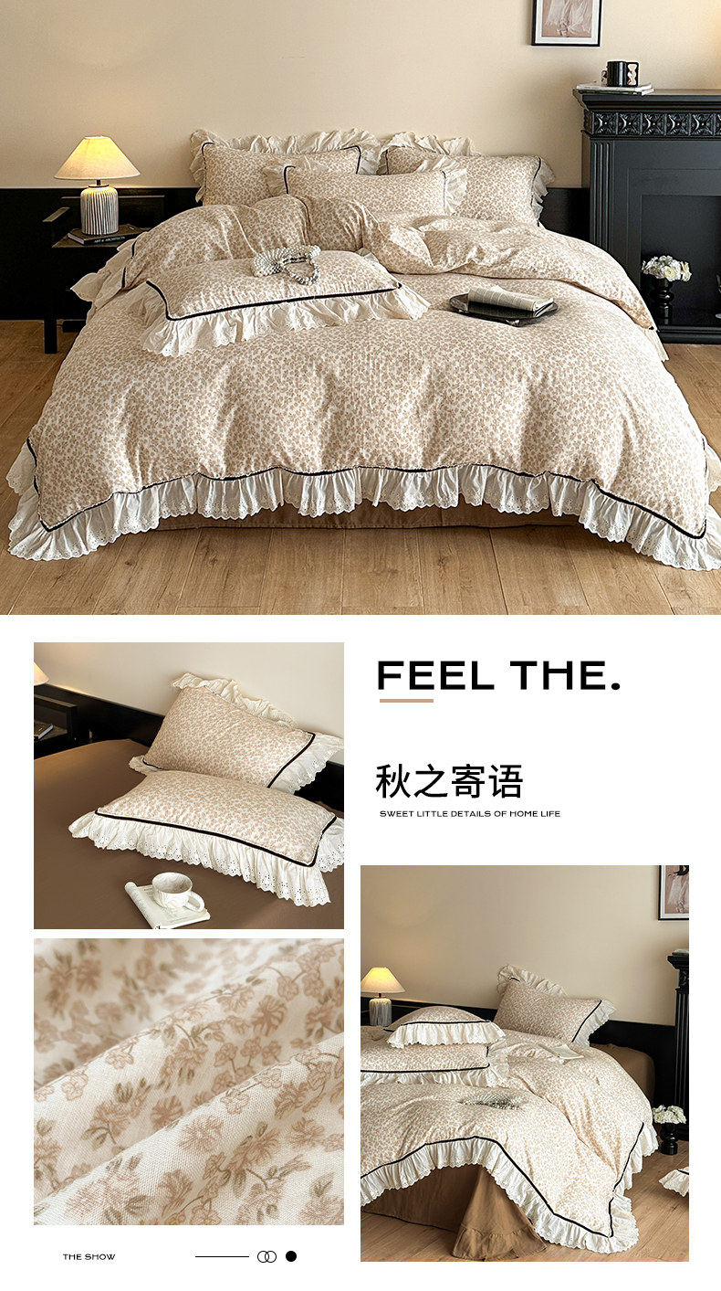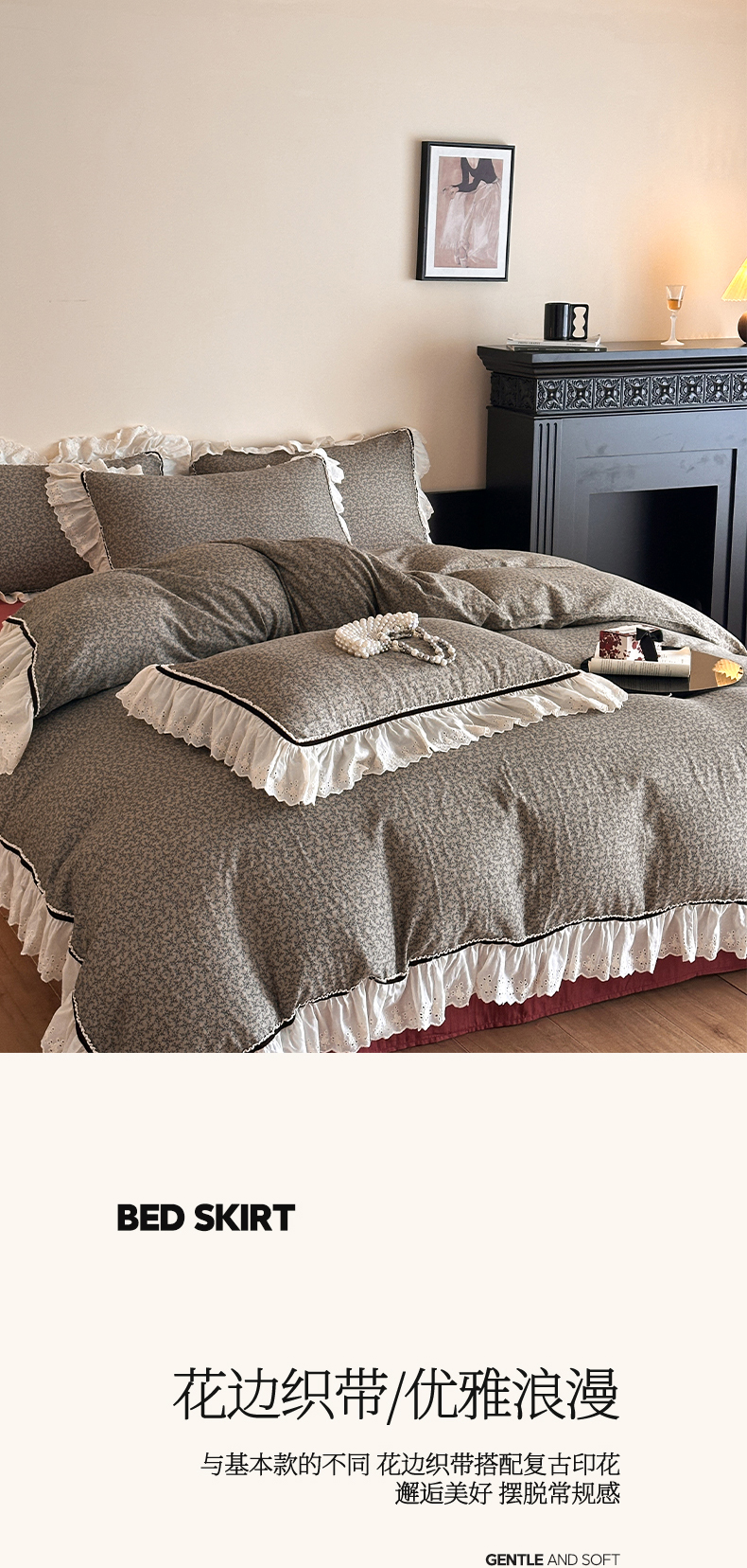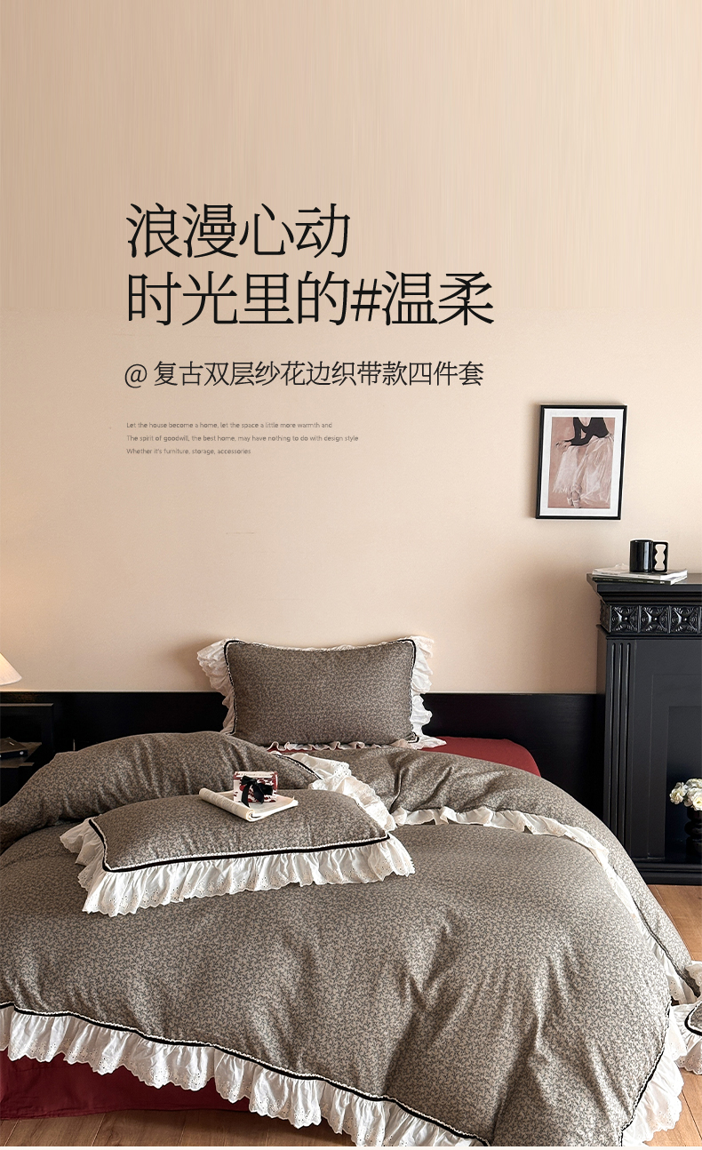 蓝邻家纺 2025春夏新款全棉纯棉复古双层纱花边织带款四件套 春风细叶