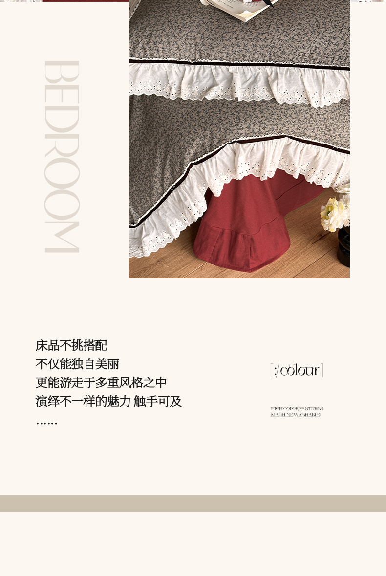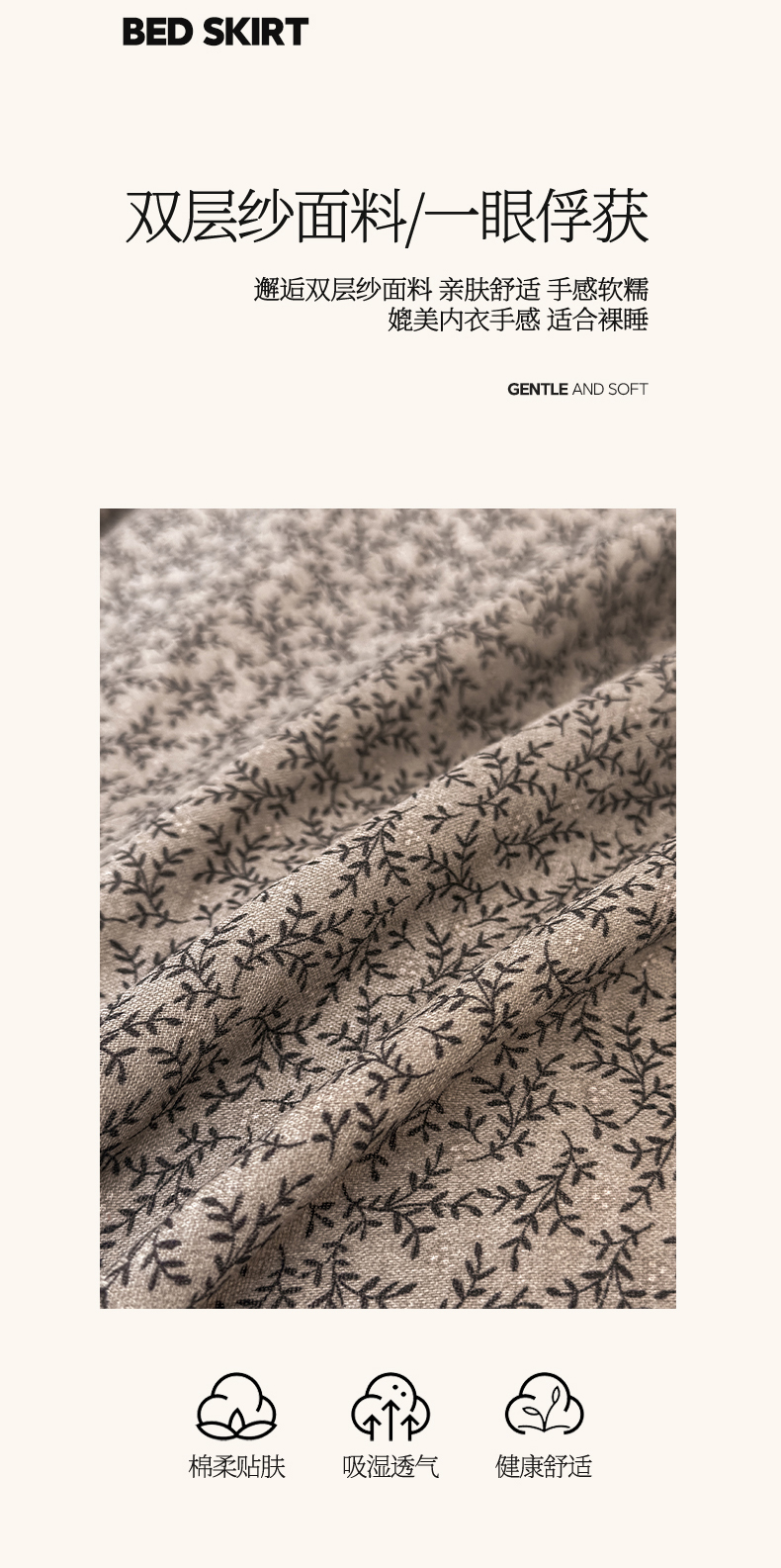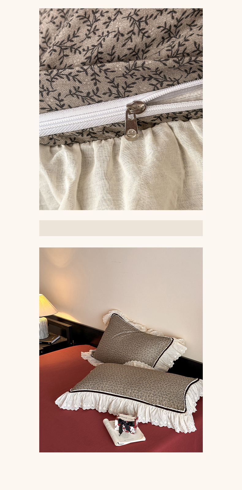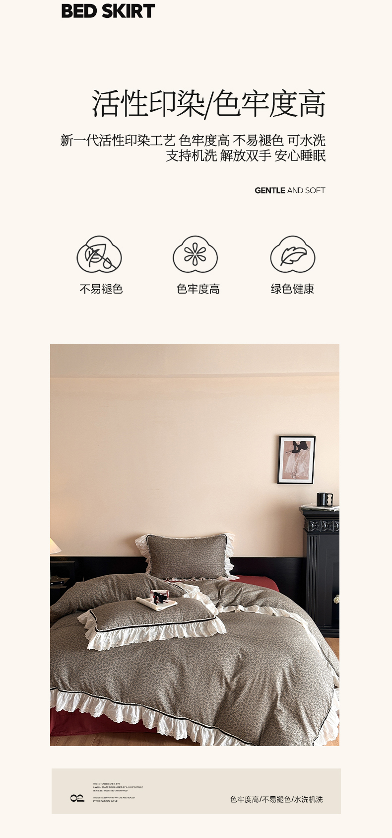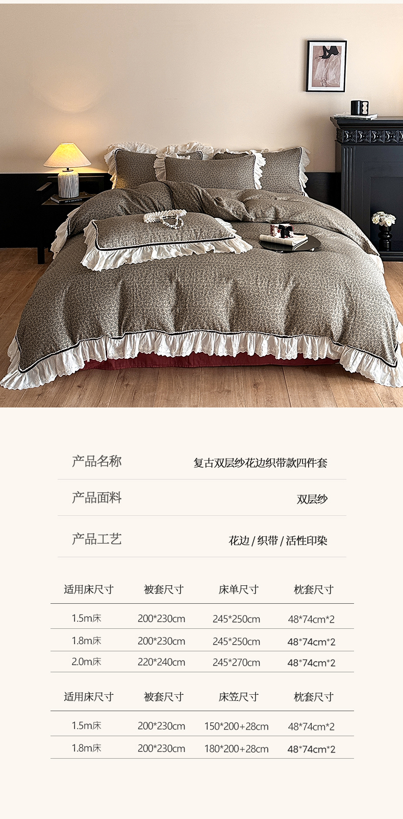 商品名称:蓝邻家纺 2025春夏新款全棉纯棉复古双层纱花边织带款四件套 春风细叶