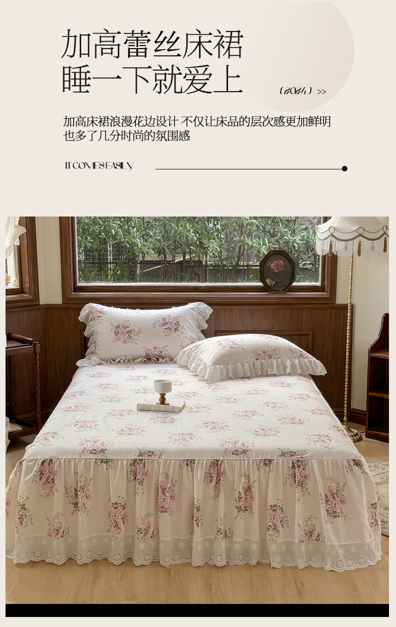 商品名称:胜权家纺 2025新款全棉法式花边款单床裙 粉色佳人