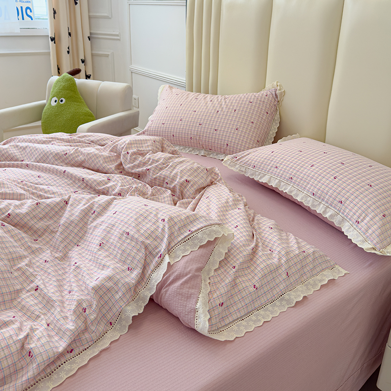 商品名称:竹合家纺 2025新款云感皱皱四件套-镂空花边款法式 花边款-彩格樱桃