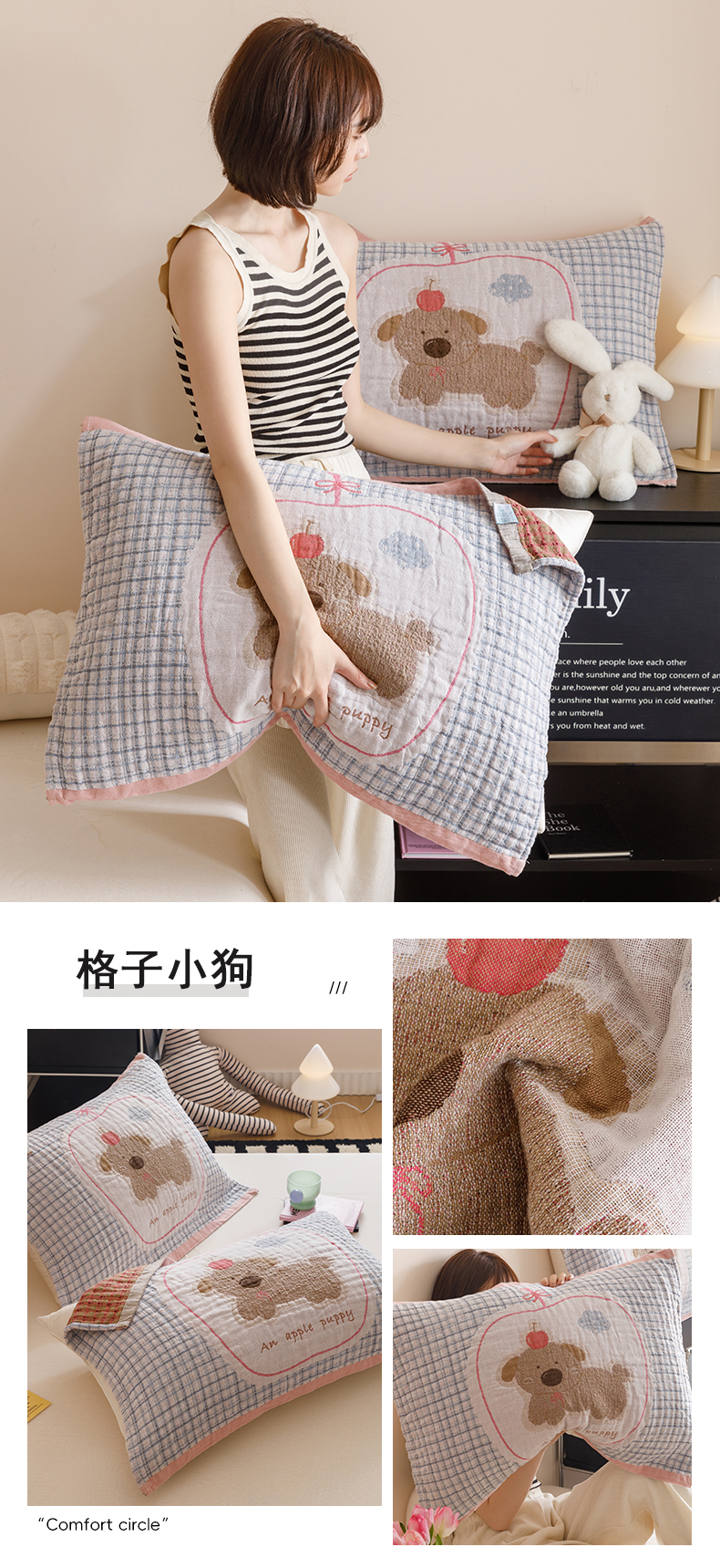 商品名称:2025新款纯棉全棉纱布枕巾一对装全棉四层纱布 格子小狗