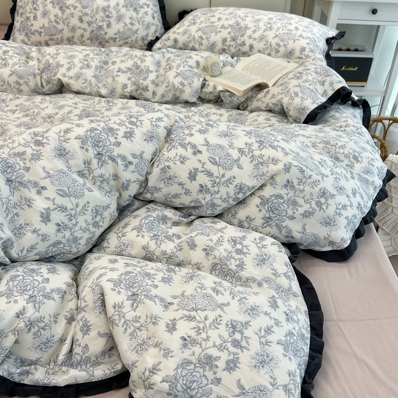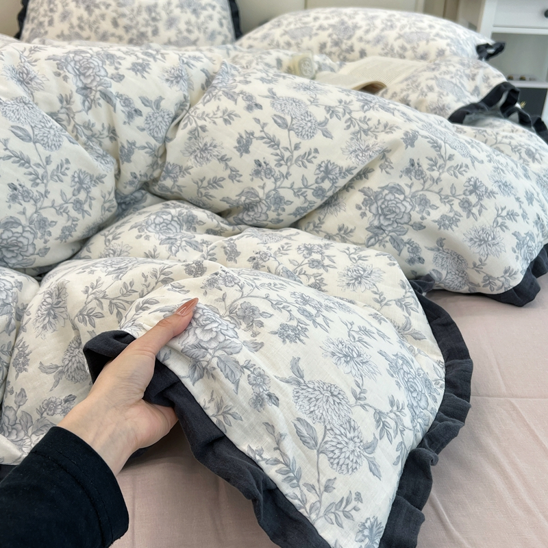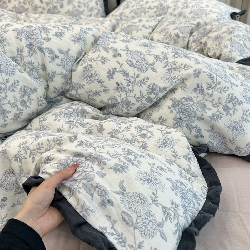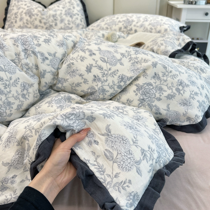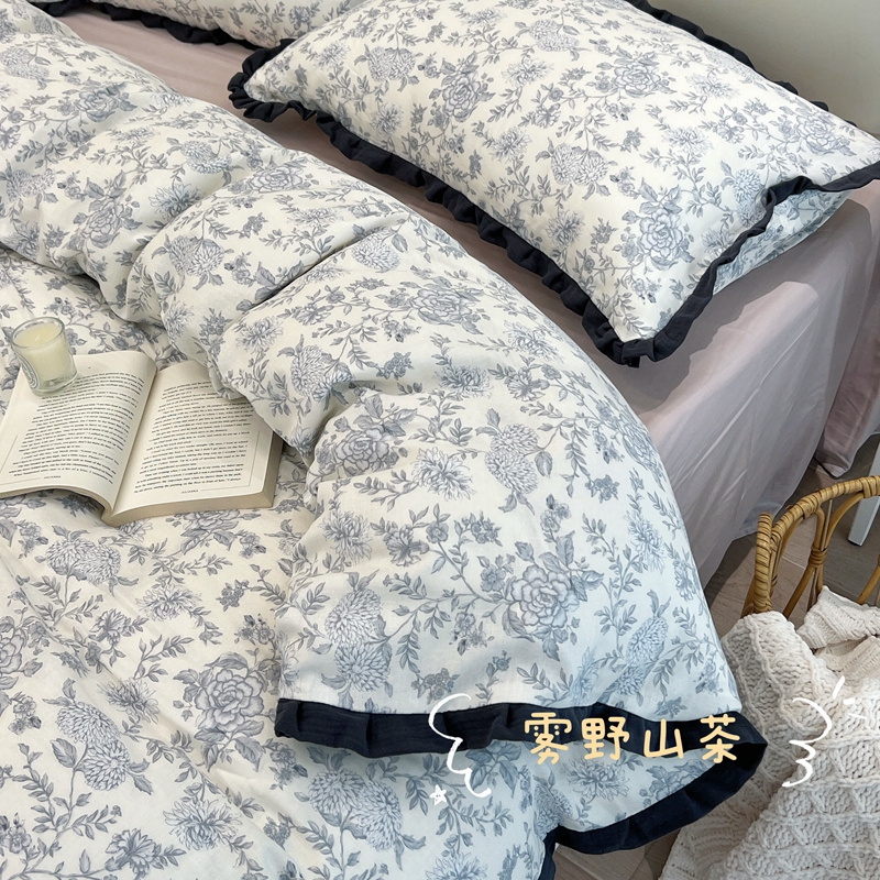 荣轩 2024新款全棉印花双层纱四件套 皱皱纱花边款 雾野山茶