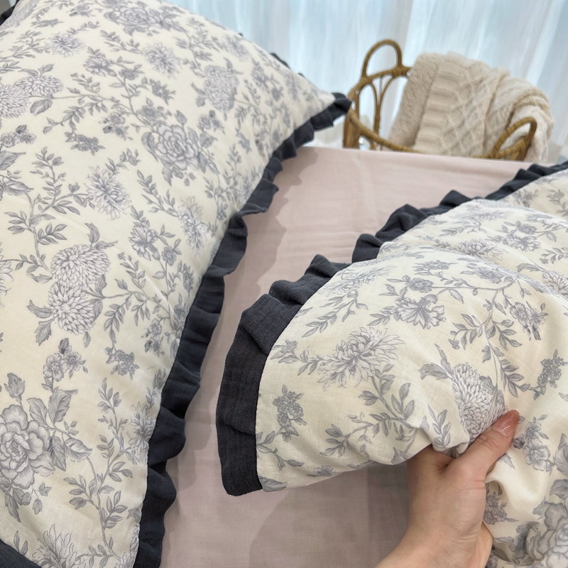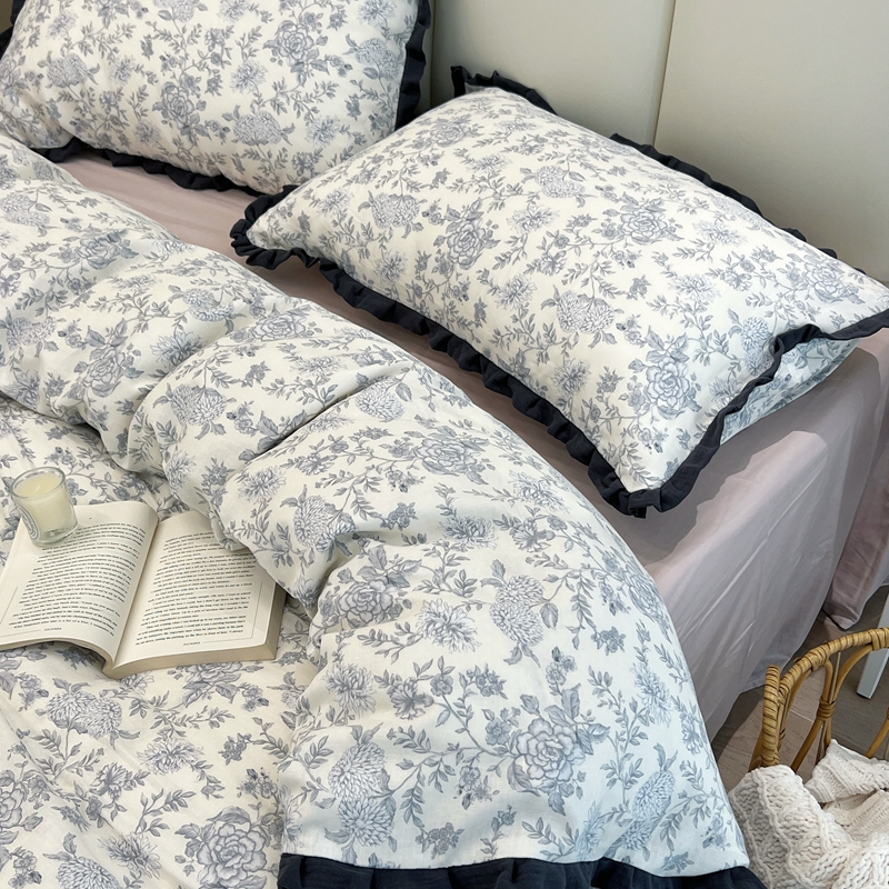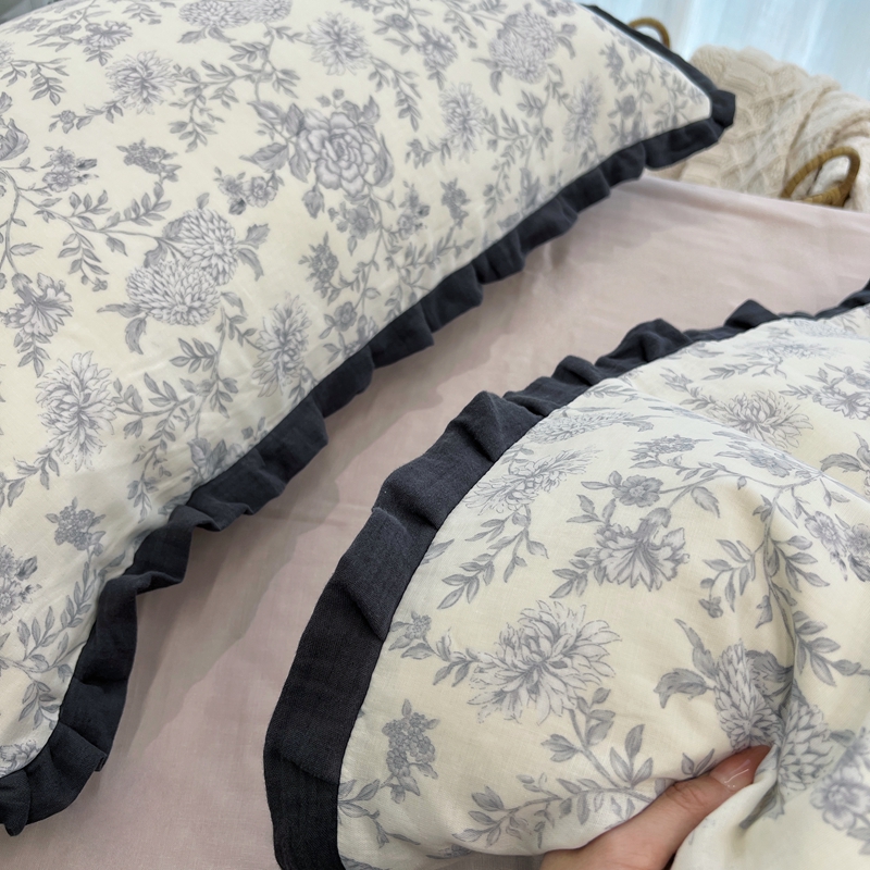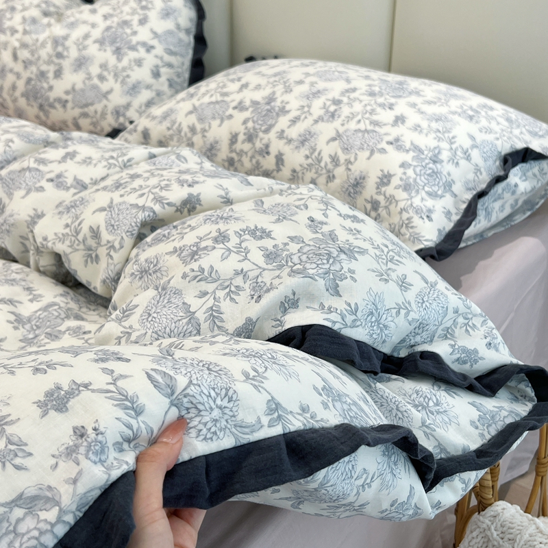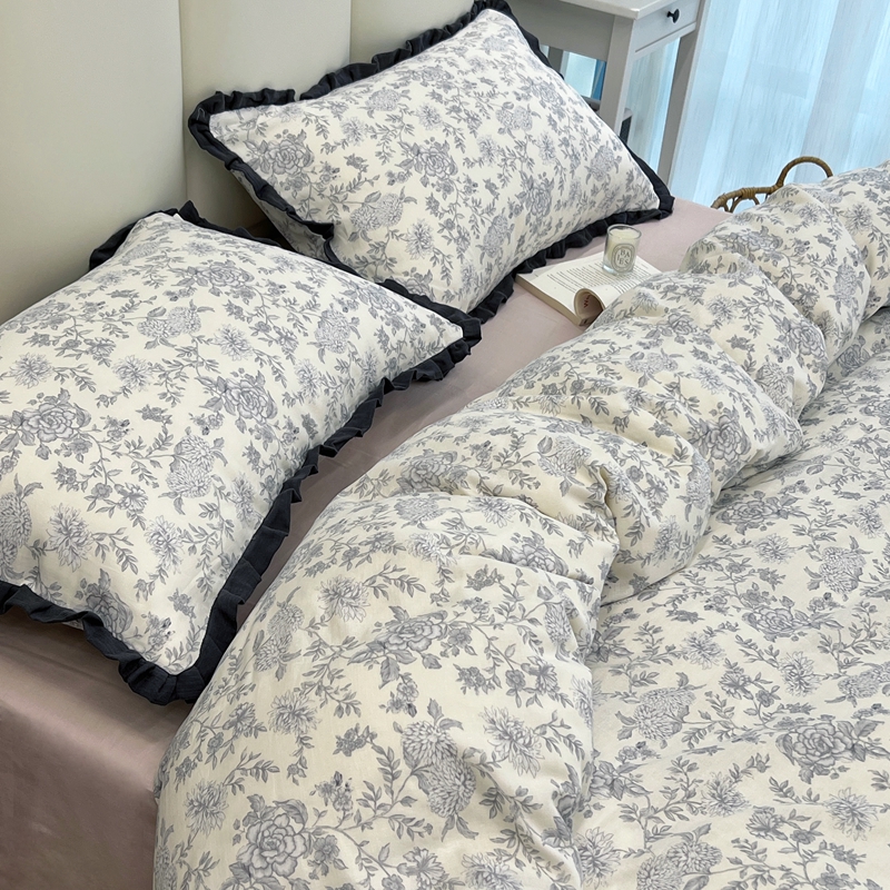 荣轩 2024新款全棉印花双层纱四件套 皱皱纱花边款 雾野山茶