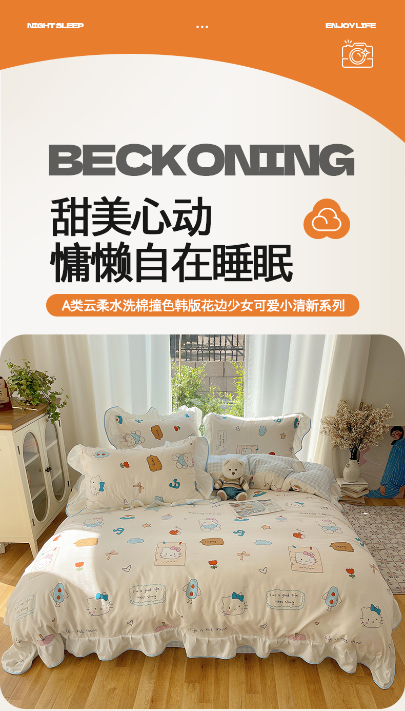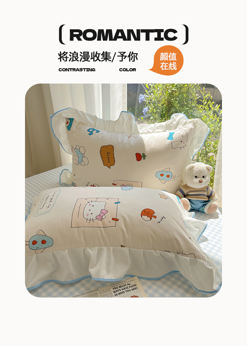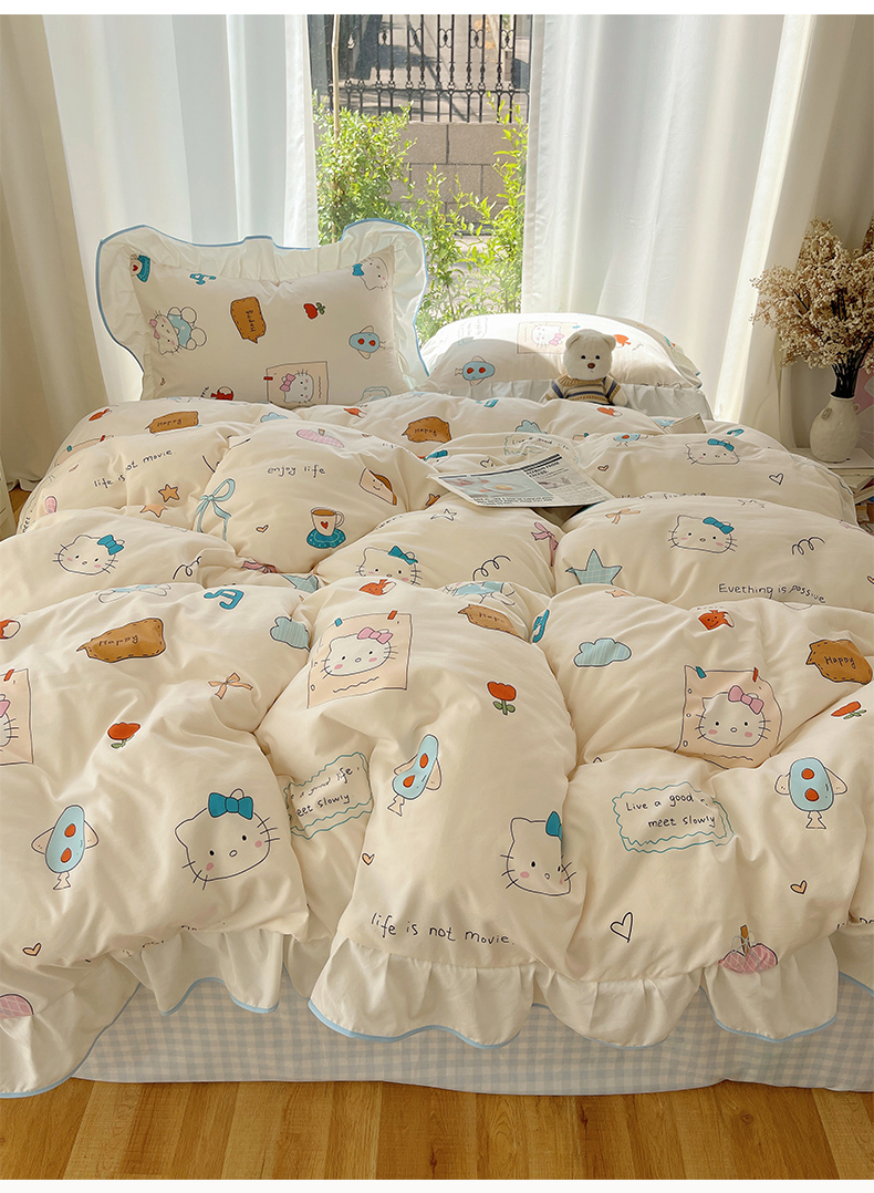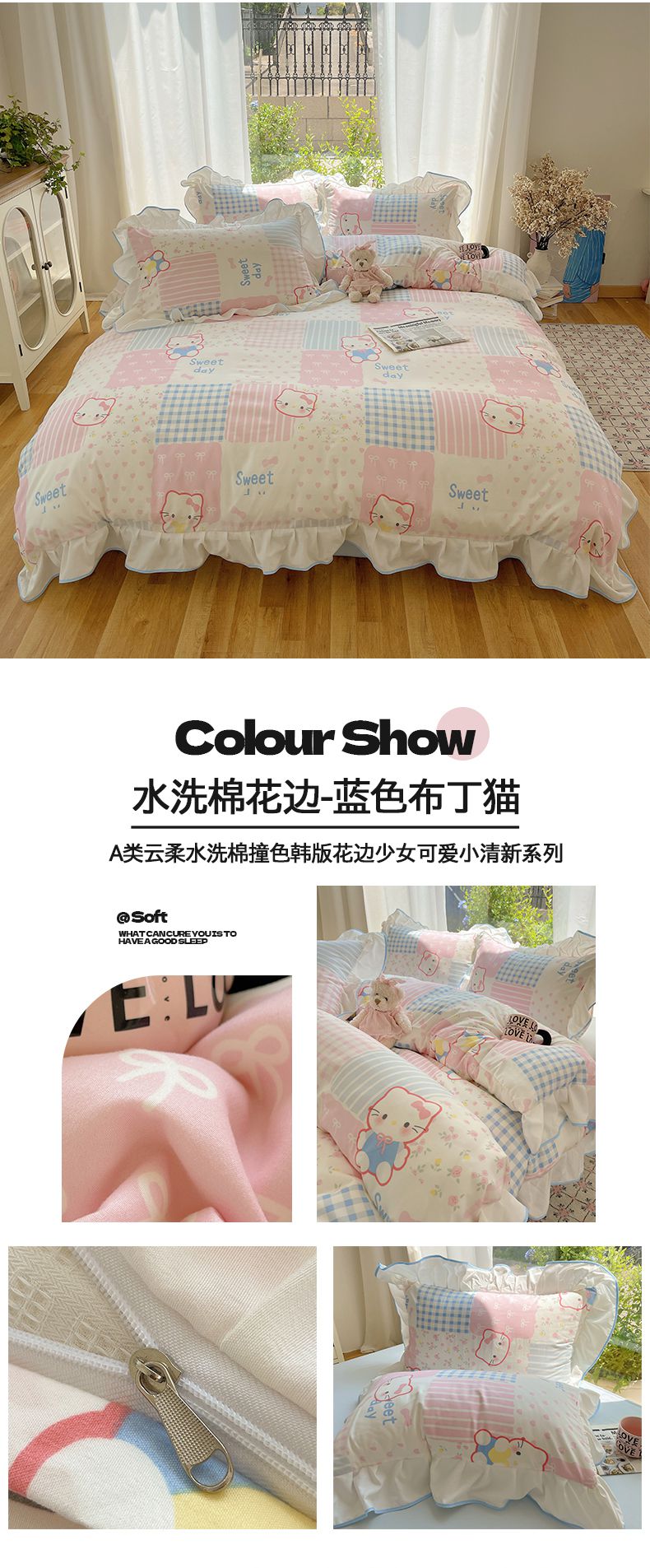 当前位置: 91家纺网 > 商品网购 > 床品套件 > 四件套 > 水洗棉四件套 > 桃心家居 2025新款A类云柔水洗棉花边四件套 水洗棉花边-蓝色猫咪日记