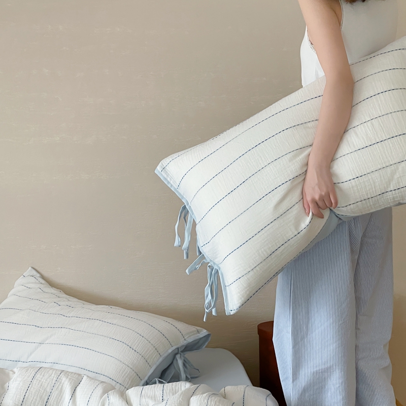 (总)小春日和 2025新款全棉提花条纹四件套纯棉人字纹水洗提花绑带款四件套民宿四件套纯色床单1.8床笠简约被套,云漫