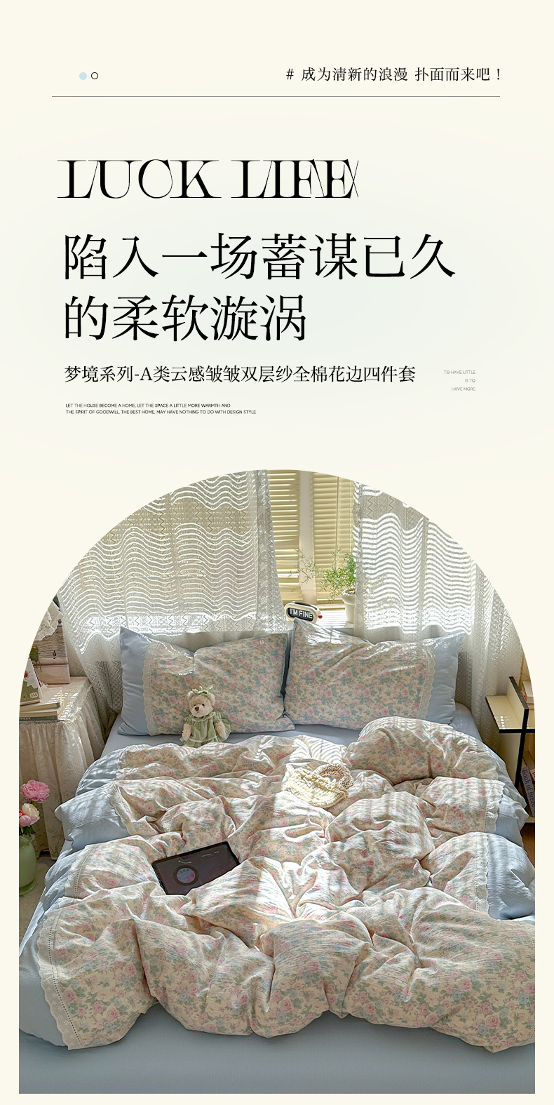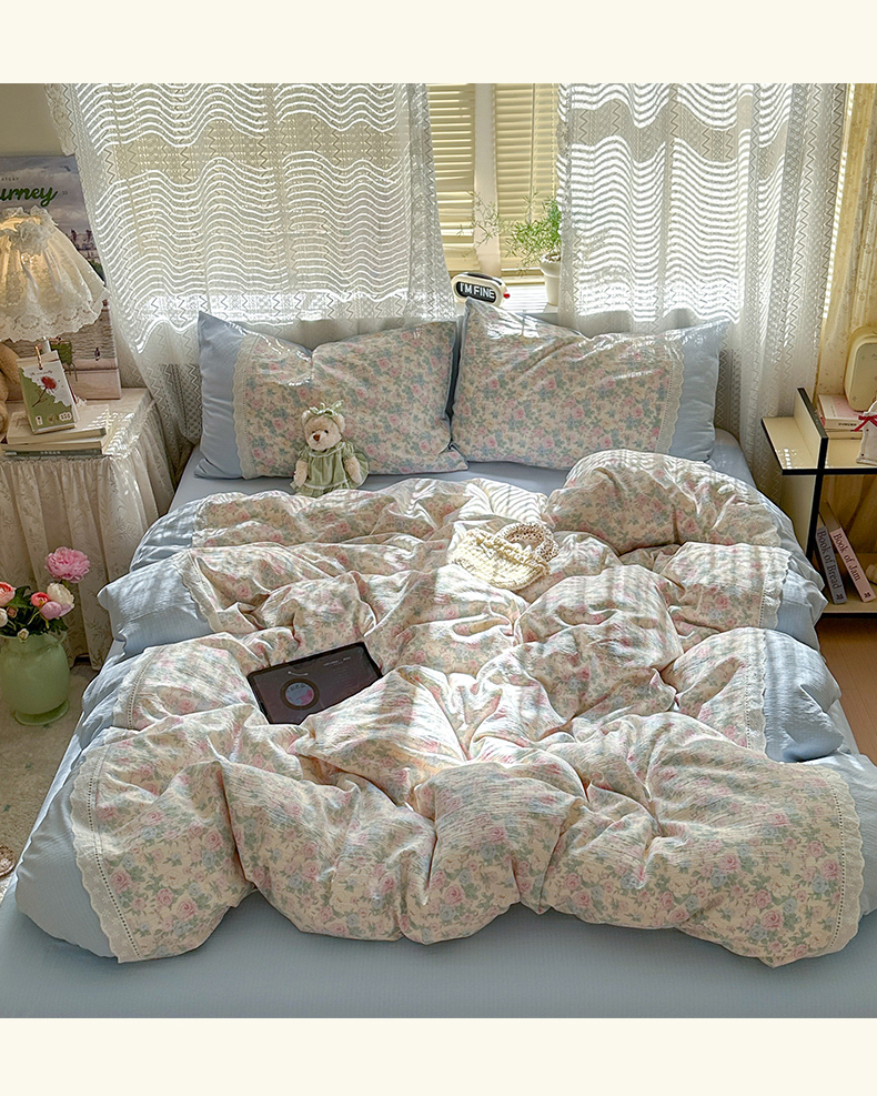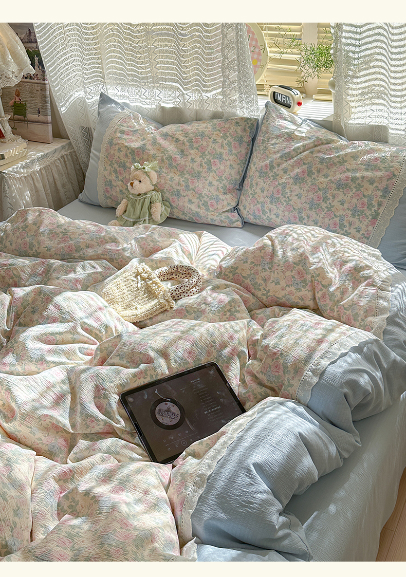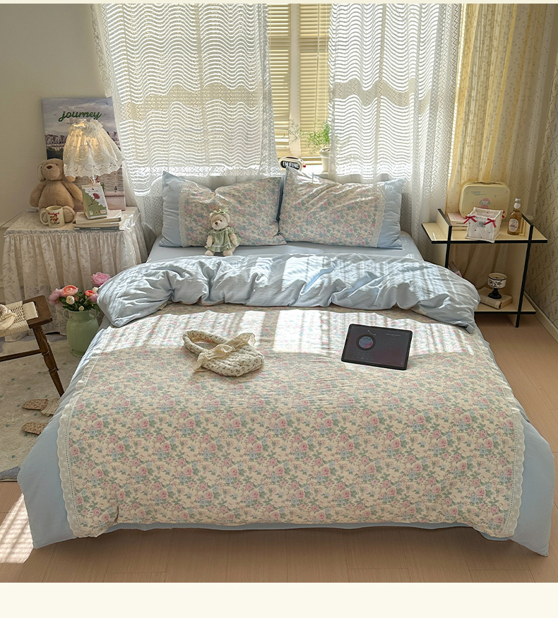当前位置: 91家纺网 > 商品网购 > 床品套件 > 四件套 > 全棉普通四件套 > 罗亿家纺 2025新款云感双层纱全棉纯棉镂空花边四件套 梦境-童话花岛