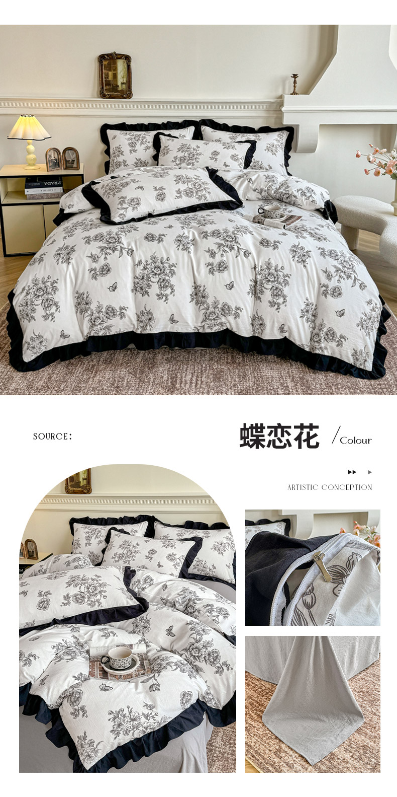 当前位置: 91家纺网 > 商品网购 > 床品套件 > 四件套 > 双层纱四件套 > 芷凡家纺 2025新款水洗棉双层纱赫本风四件套-风格二 蝶恋花