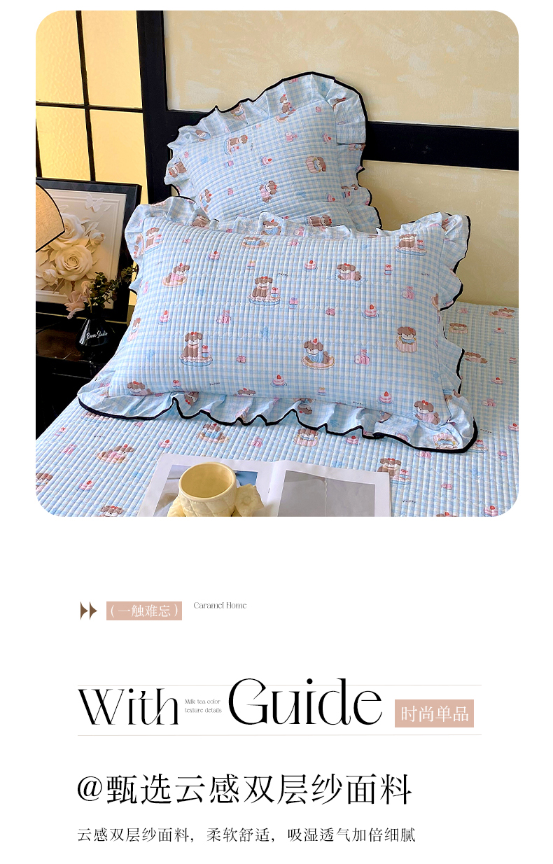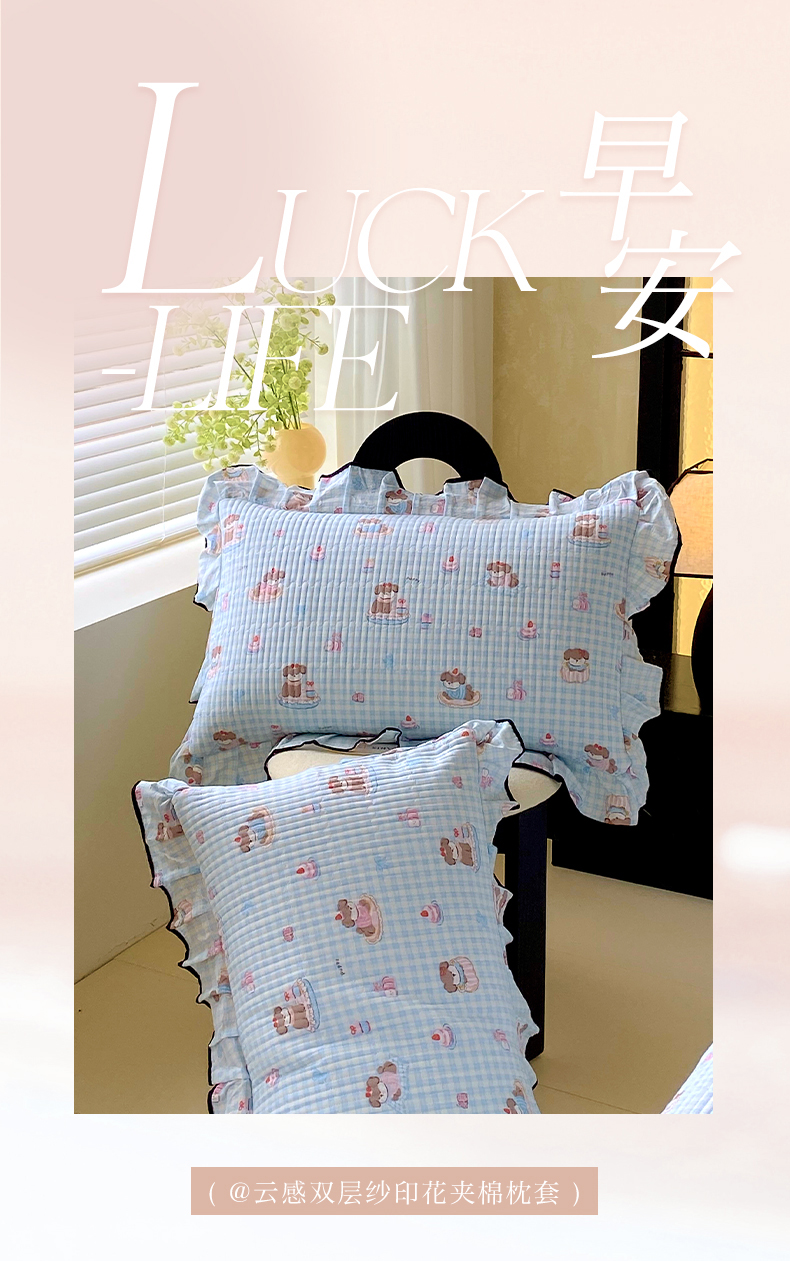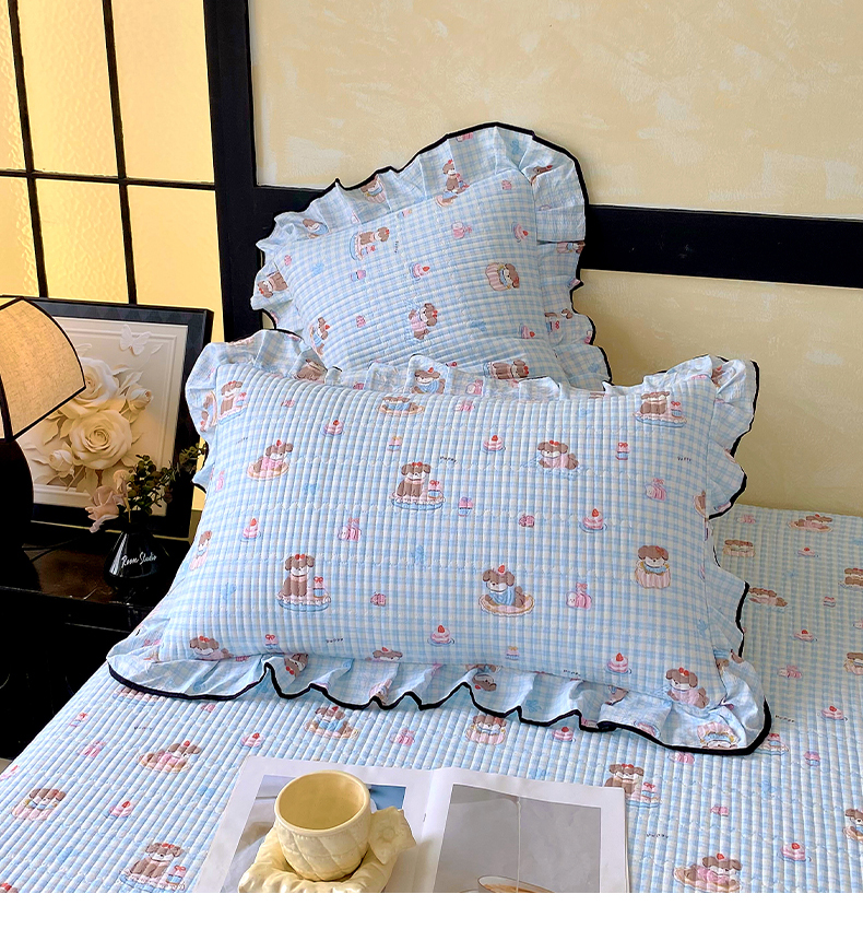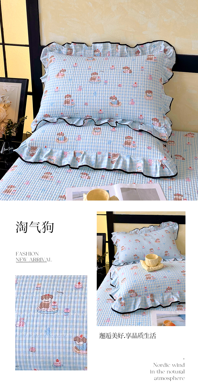商品名称:雨彤家纺 2025新款A类云感公主风双层纱印花夹棉花边款枕套 淘气狗-公主风