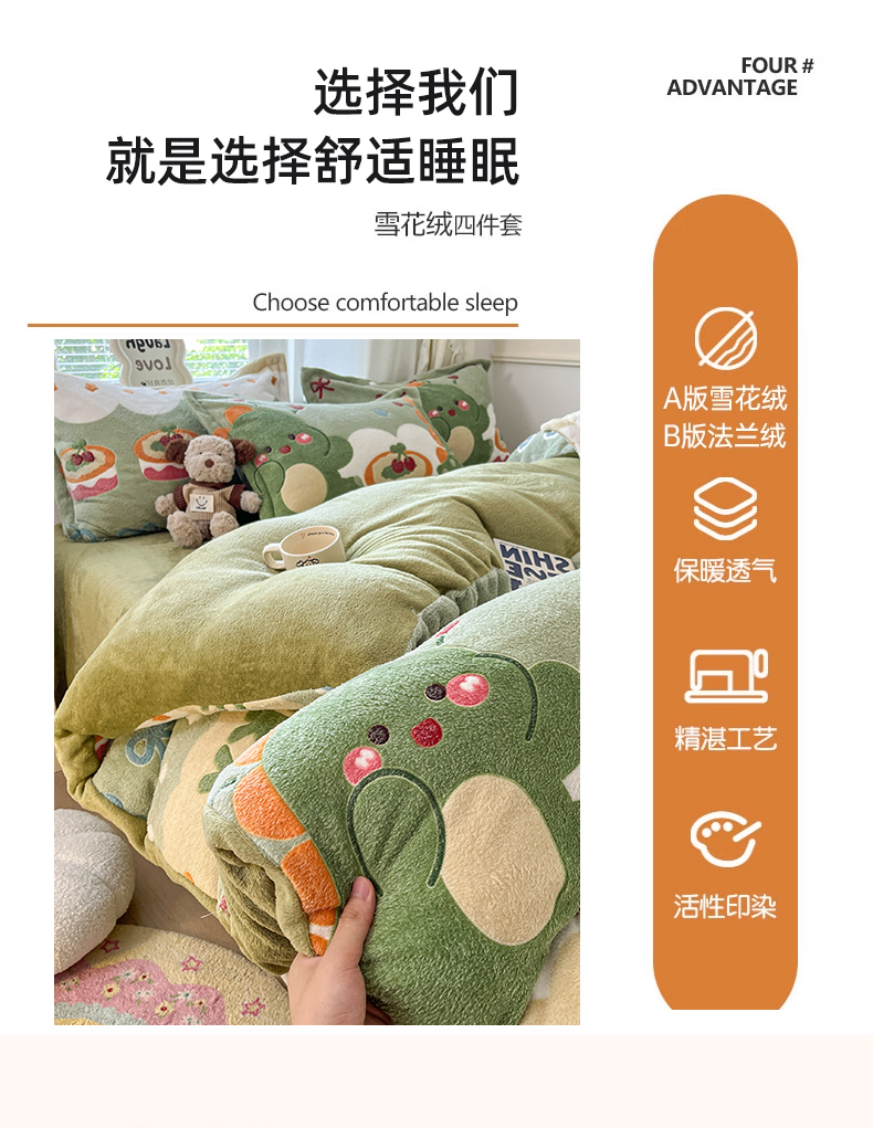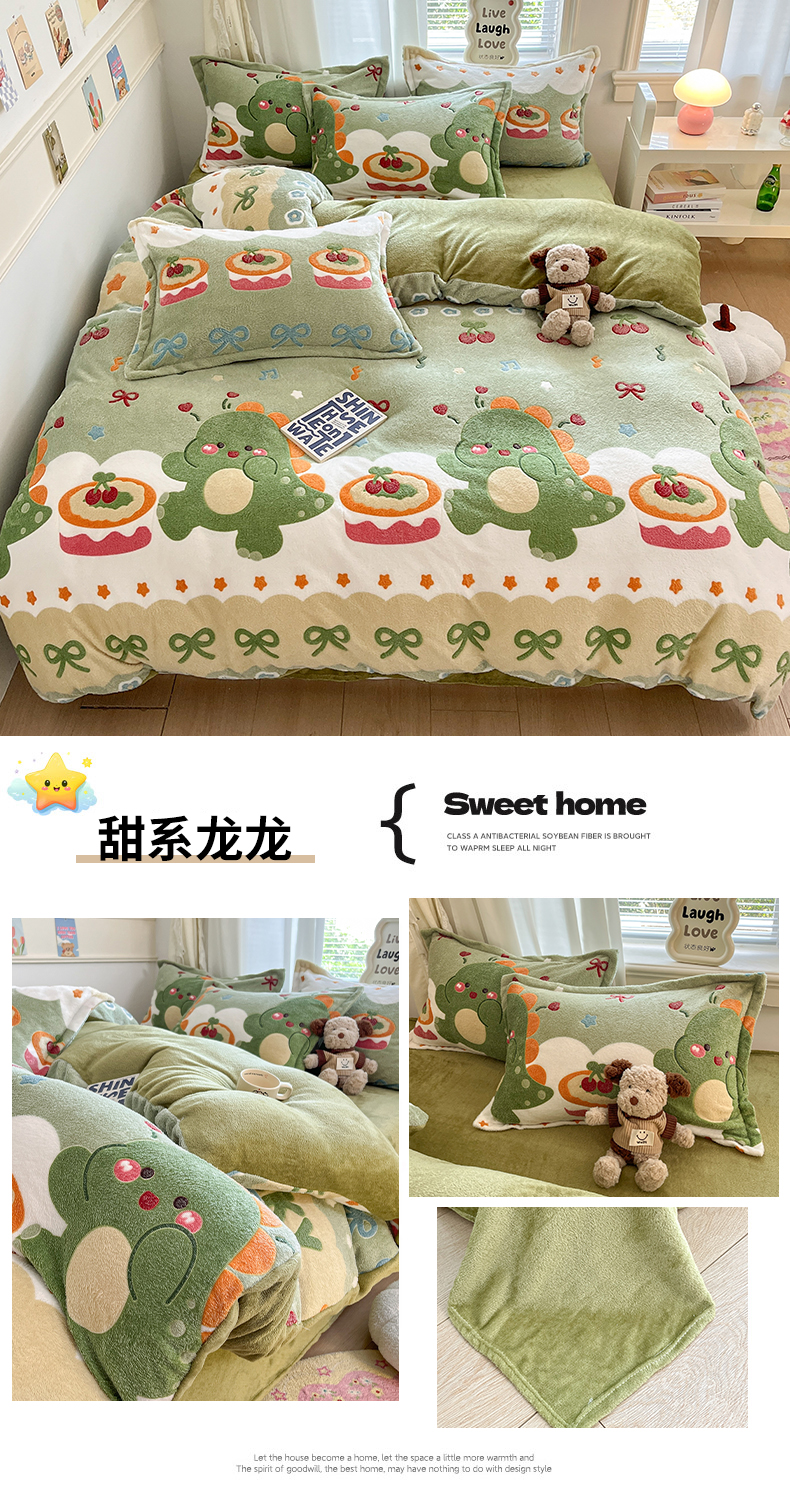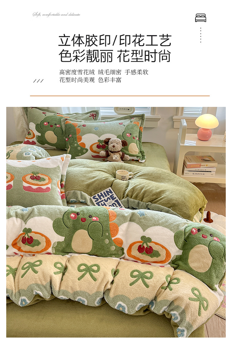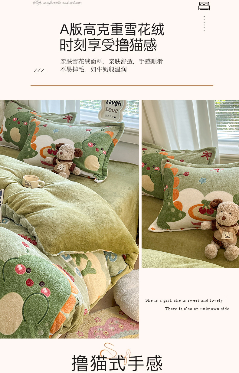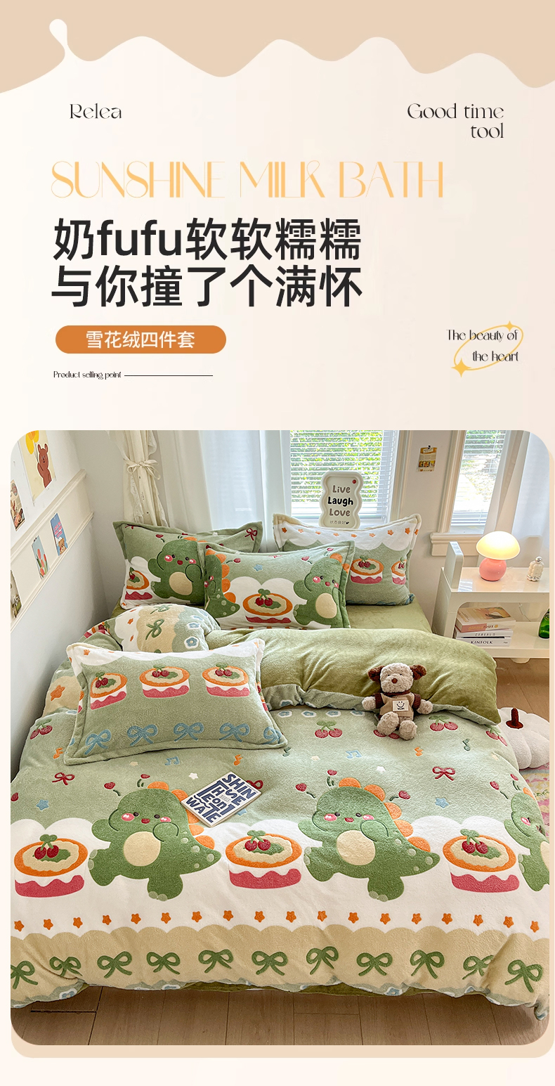 当前位置: 91家纺网 > 商品网购 > 床品套件 > 四件套 > 法莱绒四件套 > 川悦生活 2025新款立体雪花绒印花大床四件套系列一场景二 甜系龙龙