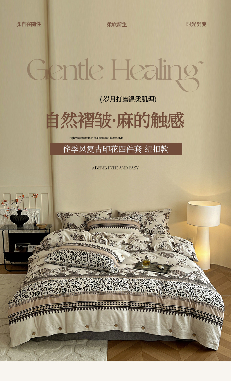 商品名称:一比一家纺 2025新款原麻纽扣款四件套 粉黛