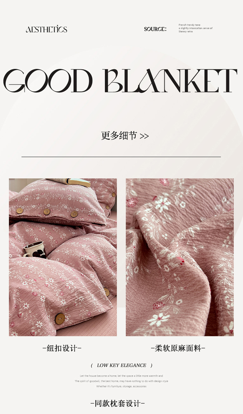 当前位置: 91家纺网 > 商品网购 > 床品套件 > 四件套 > 其它四件套 > 优尚佳生活馆 2025秋冬新款高克重亚麻复古侘季风复麻系列四件套 紫菱粉蔓