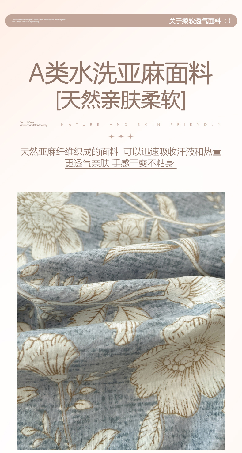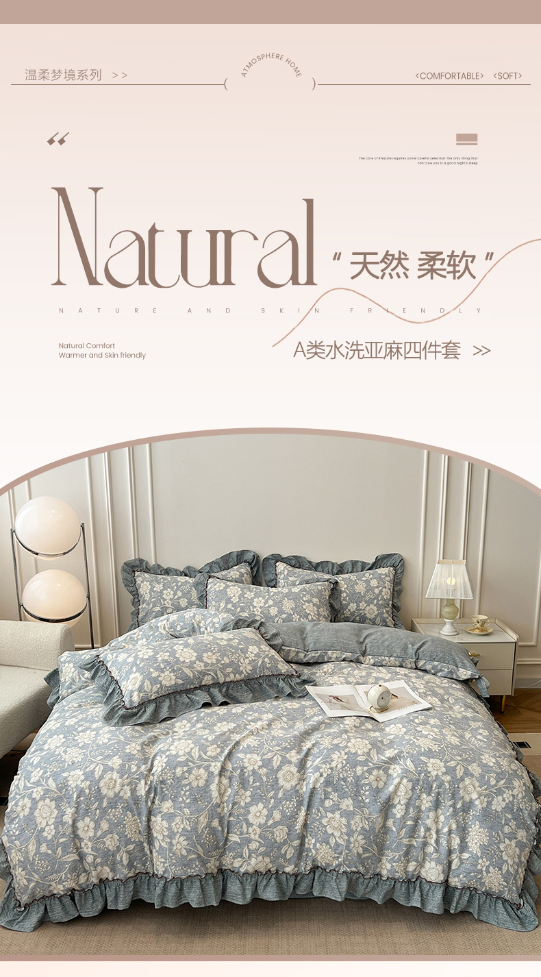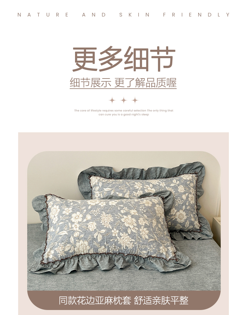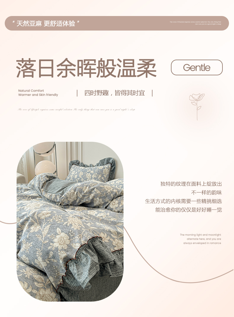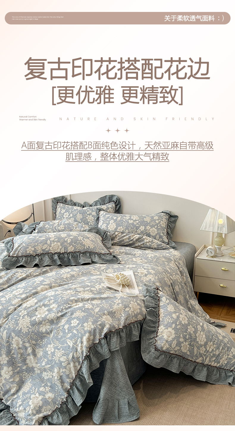 商品名称:鑫利来家纺 2025新款加厚高克重亚麻复古原麻皱皱纱印花法式花边四件套 满园花开