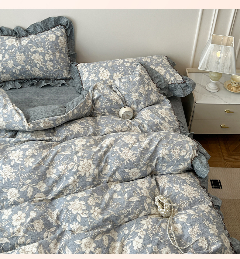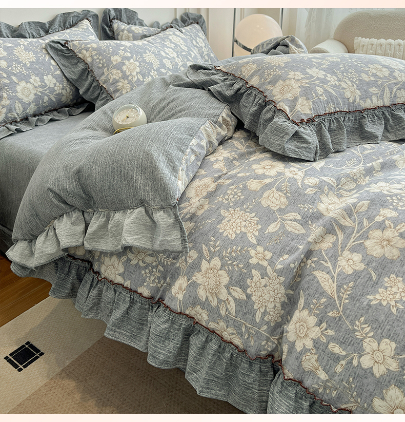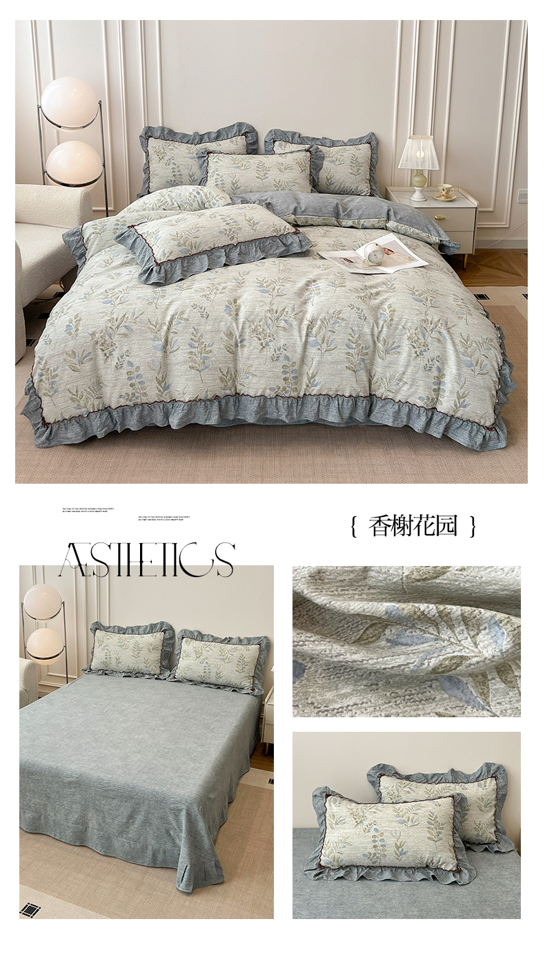 鑫利来家纺 2025新款加厚高克重亚麻复古原麻皱皱纱印花法式花边四件套 满园花开