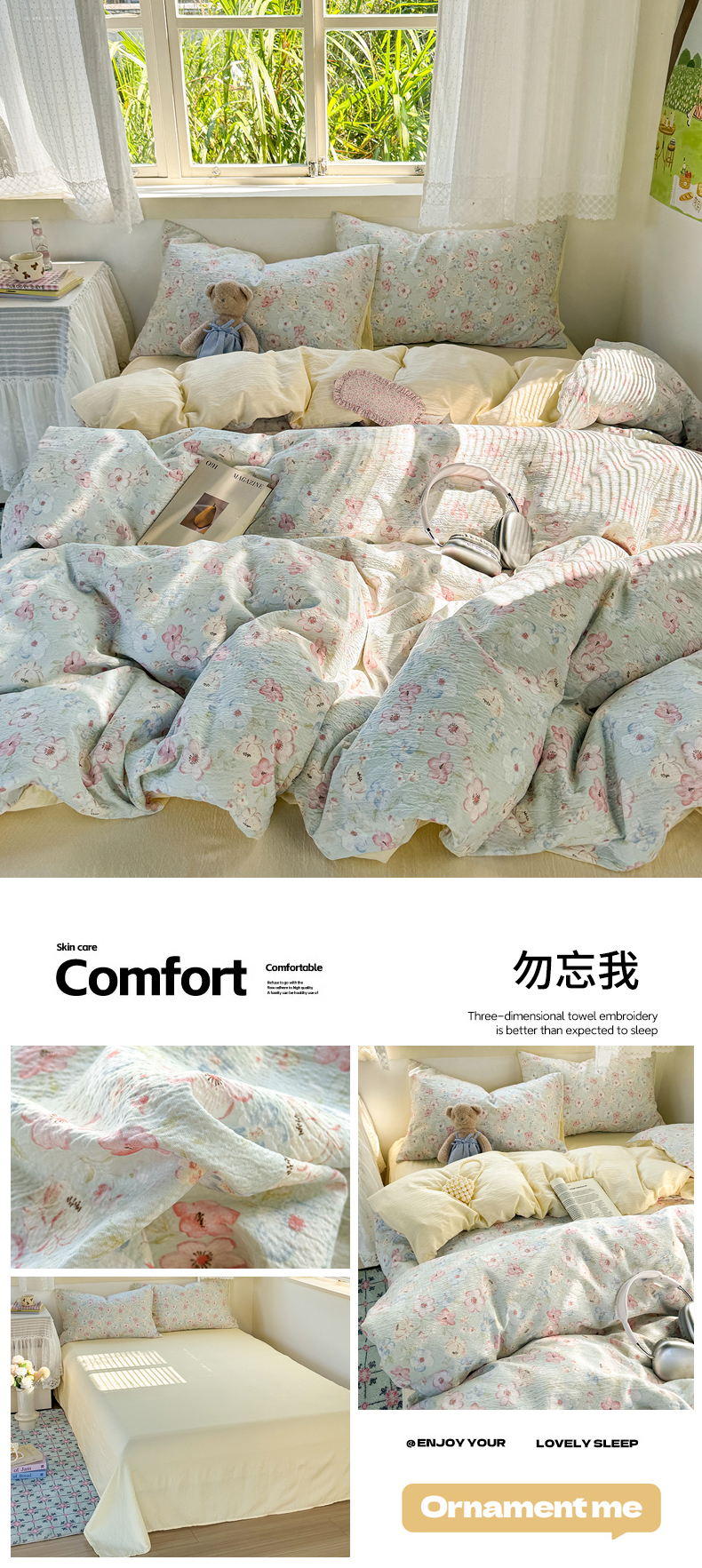 当前位置: 91家纺网 > 商品网购 > 床品套件 > 四件套 > 化纤活性四件套 > 优兰朵 2025新款超柔云感木棉印花小清新四件套 勿忘我