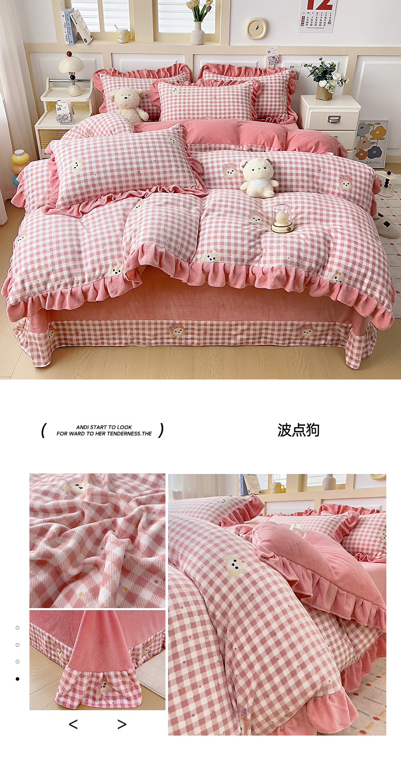 商品名称:找底底家纺 2025新款韩版加厚8斤牛奶绒花边四件套(日发50套优惠10元一套) 方块狗