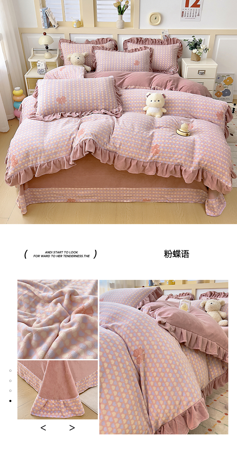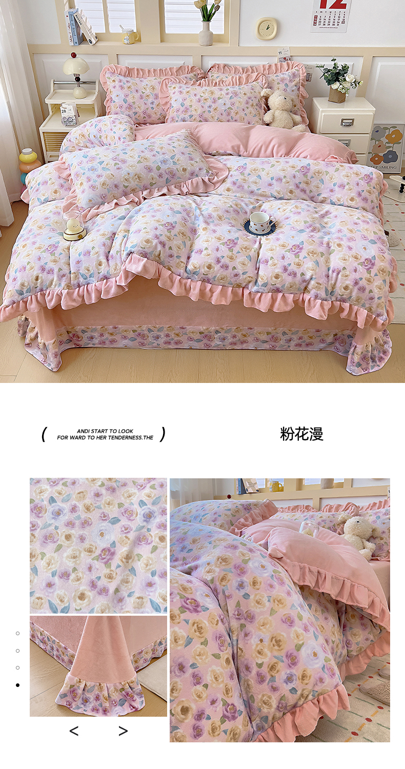 (总)找底底家纺 2025新款花边9-10斤牛奶绒床盖款四件套,花妖,梨花落,小樱桃,紫蔻