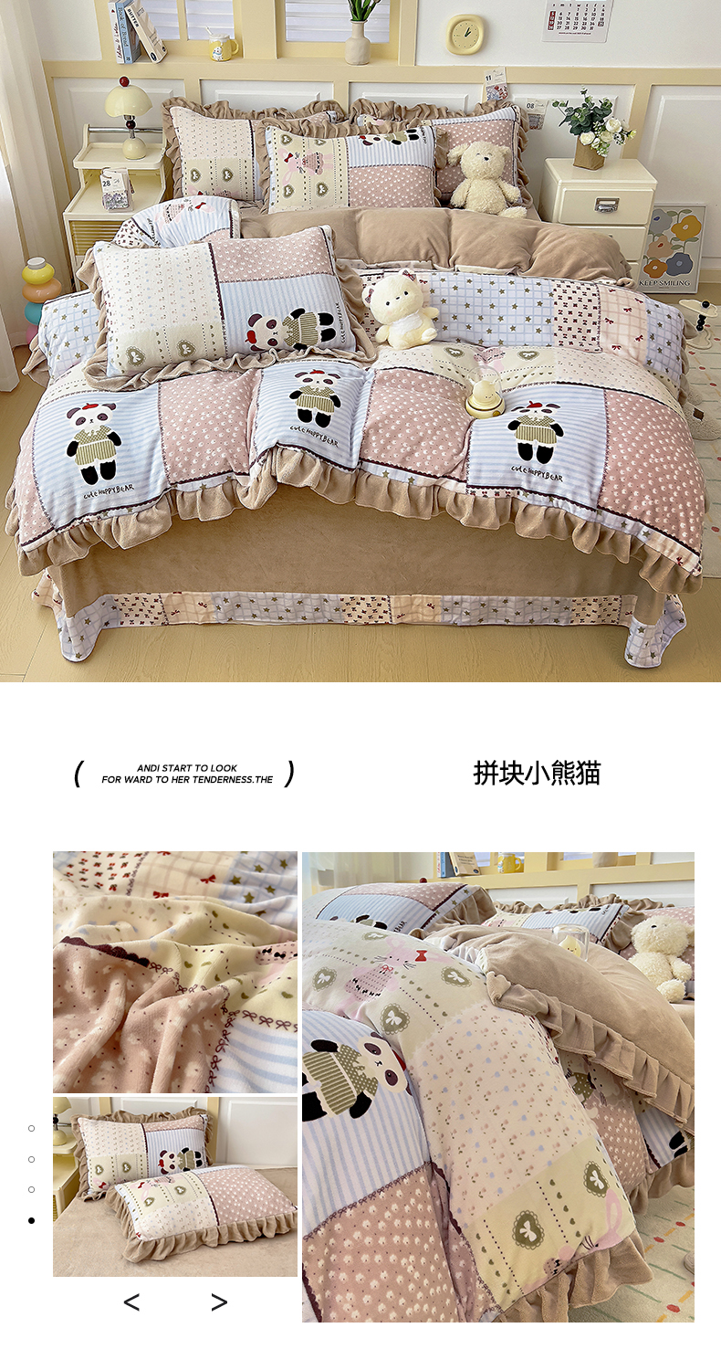 商品名称:找底底家纺 2025新款韩版加厚8斤牛奶绒花边四件套(日发50套优惠10元一套) 拼块小熊猫