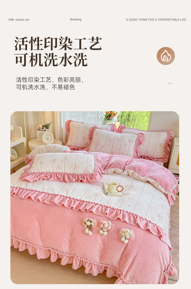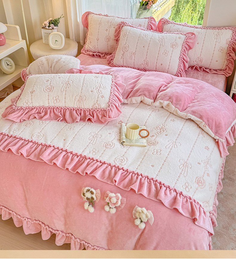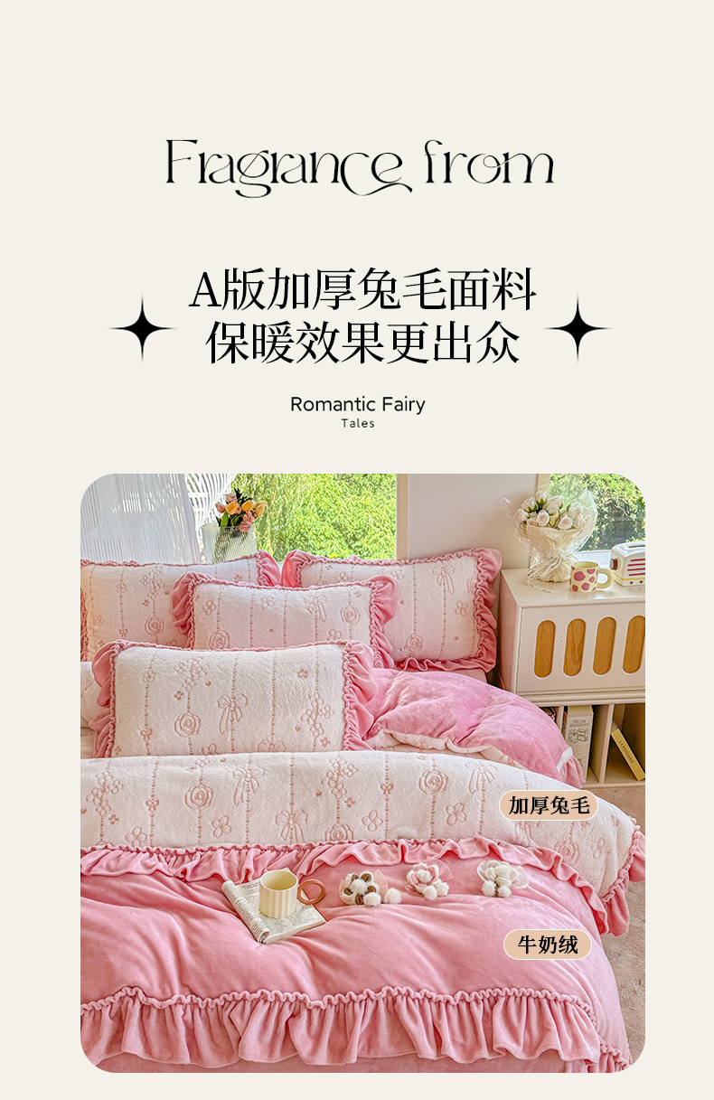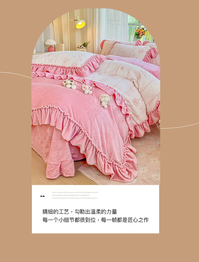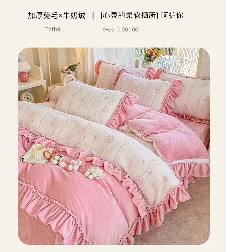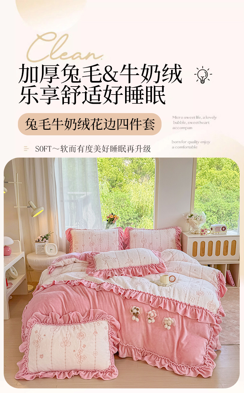 苏东来家纺2025兔毛绒韩版工艺款花边牛奶绒四件套刺绣绣花套件 甜心公主灰