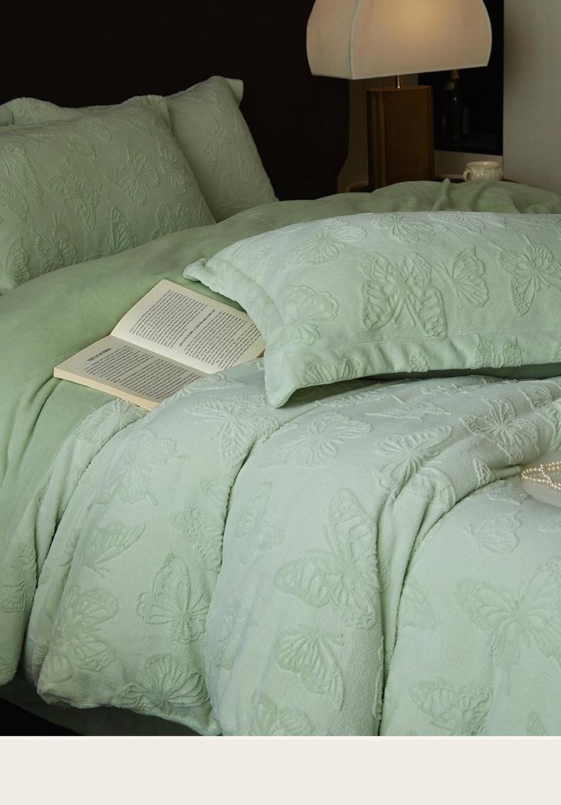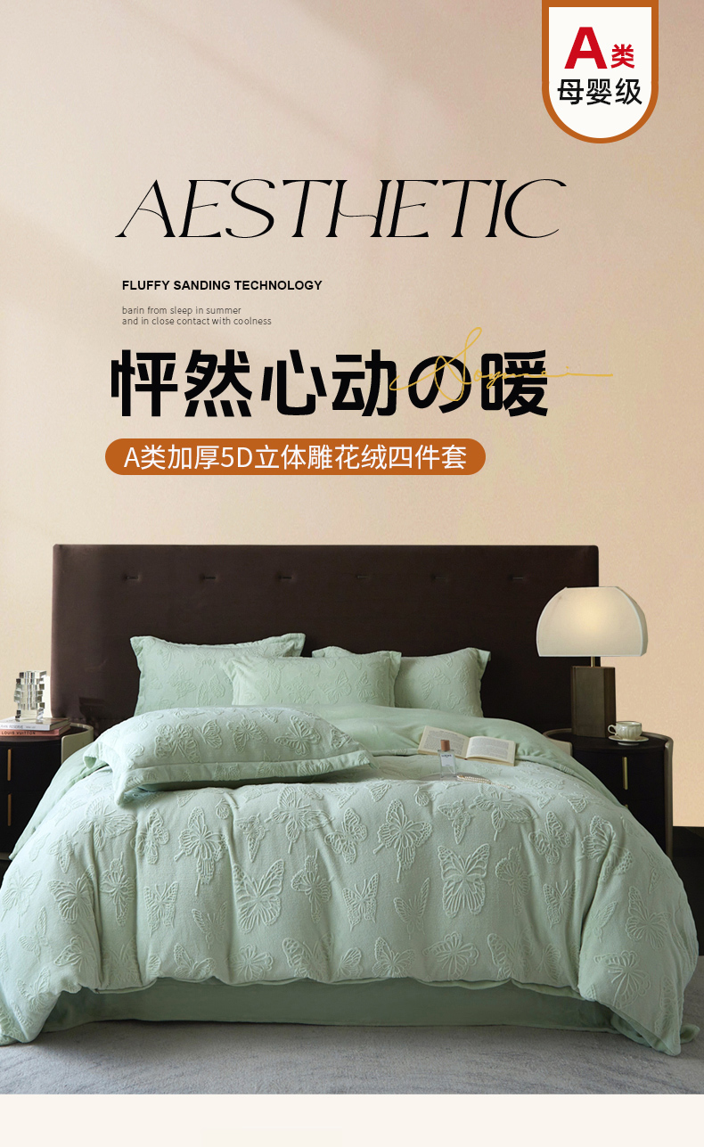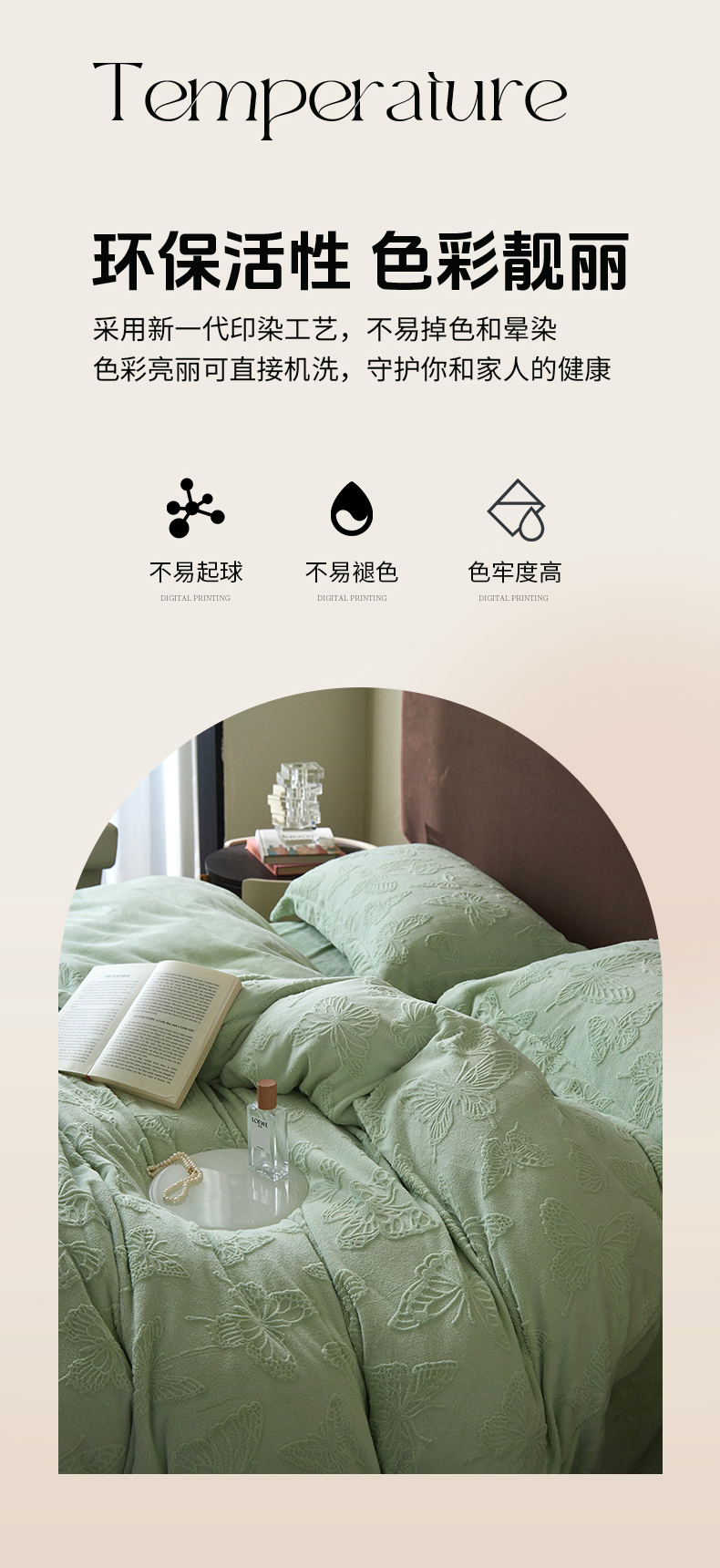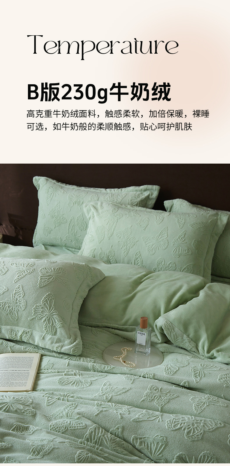当前位置: 91家纺网 > 商品网购 > 床品套件 > 四件套 > 牛奶绒四件套 > 亿梵 2025秋冬新款A类全消光牛奶绒立体5D雕花绒四件套蝶舞轻裳-清新绿