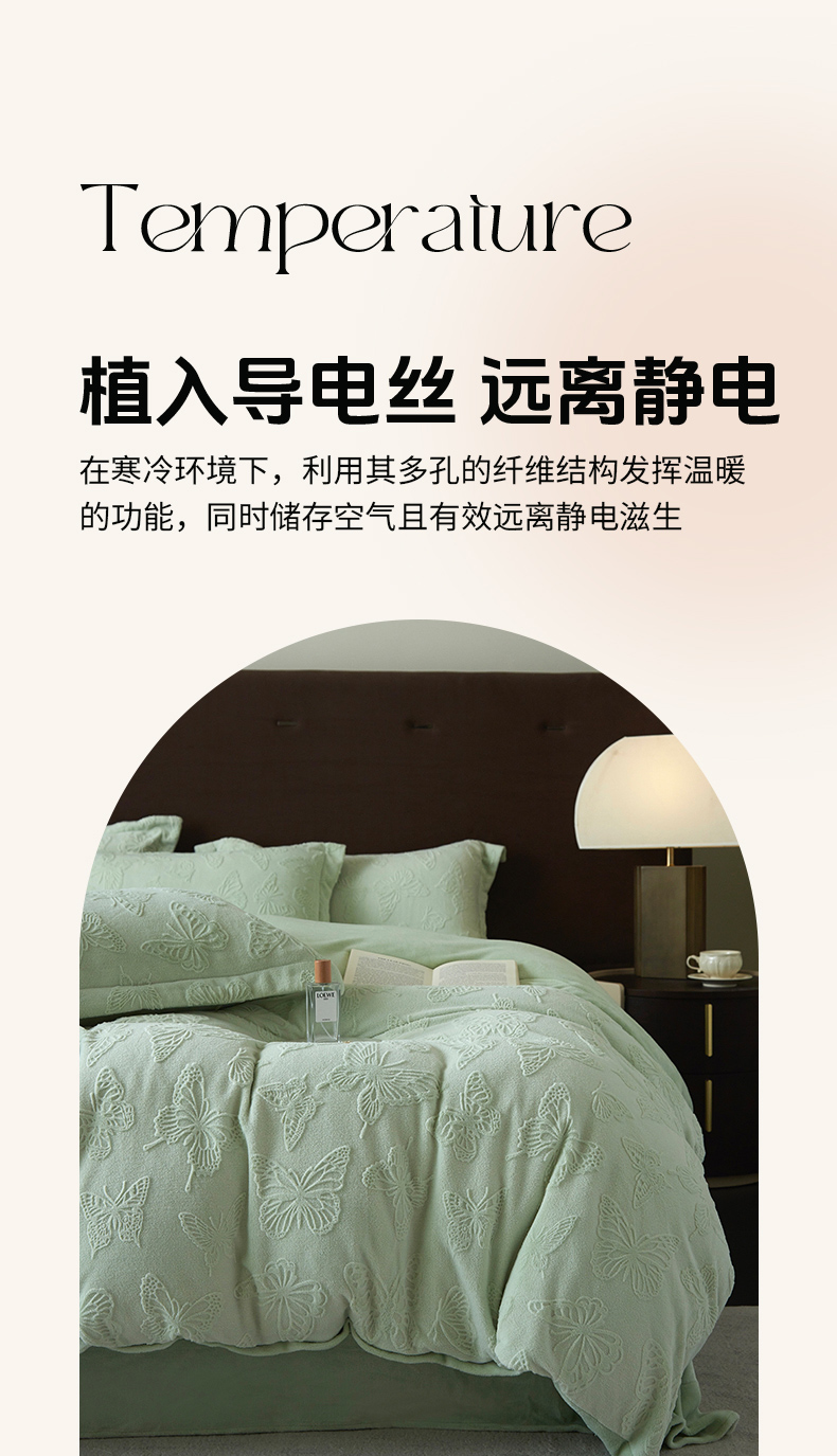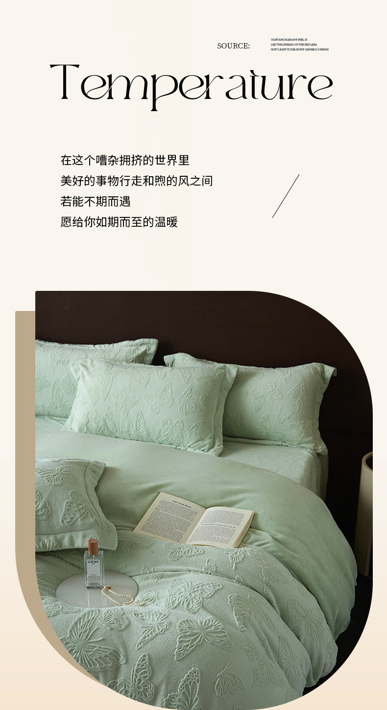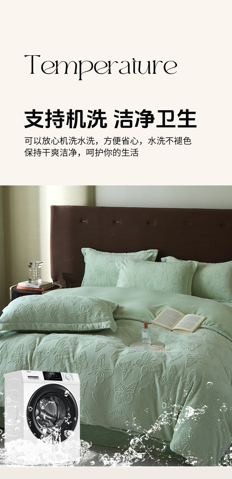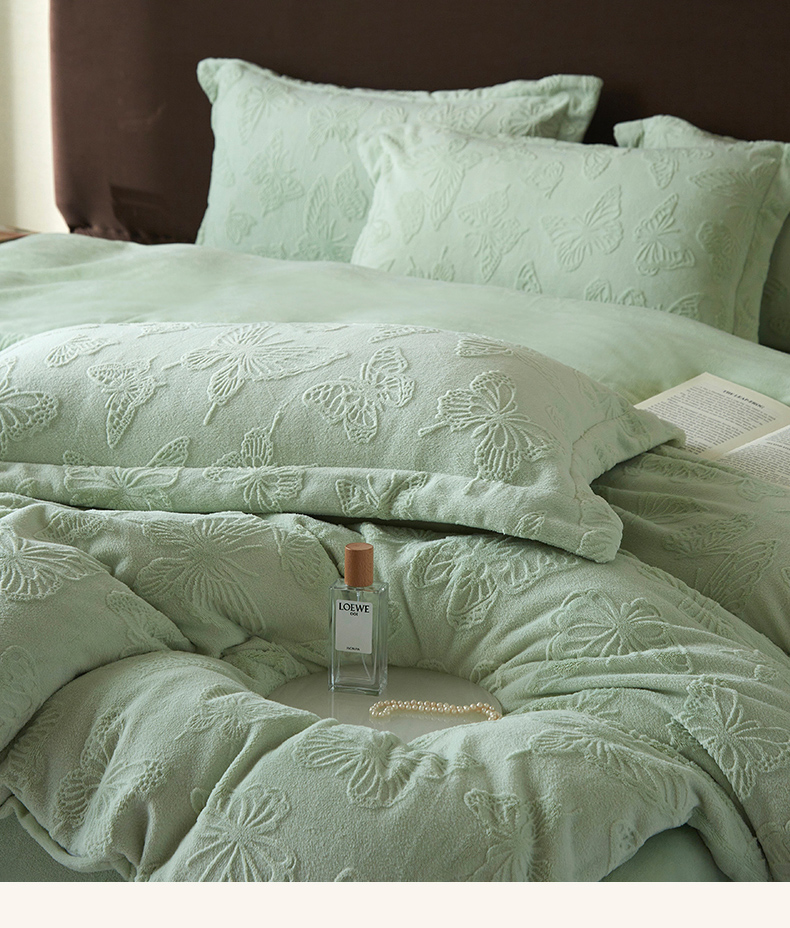 当前位置: 91家纺网 > 商品网购 > 床品套件 > 四件套 > 牛奶绒四件套 > 亿梵 2025秋冬新款A类全消光牛奶绒立体5D雕花绒四件套蝶舞轻裳-清新绿