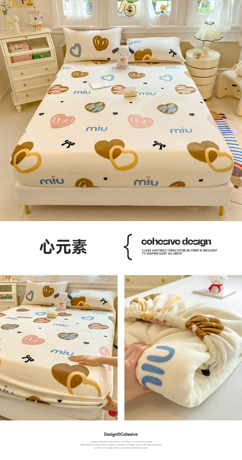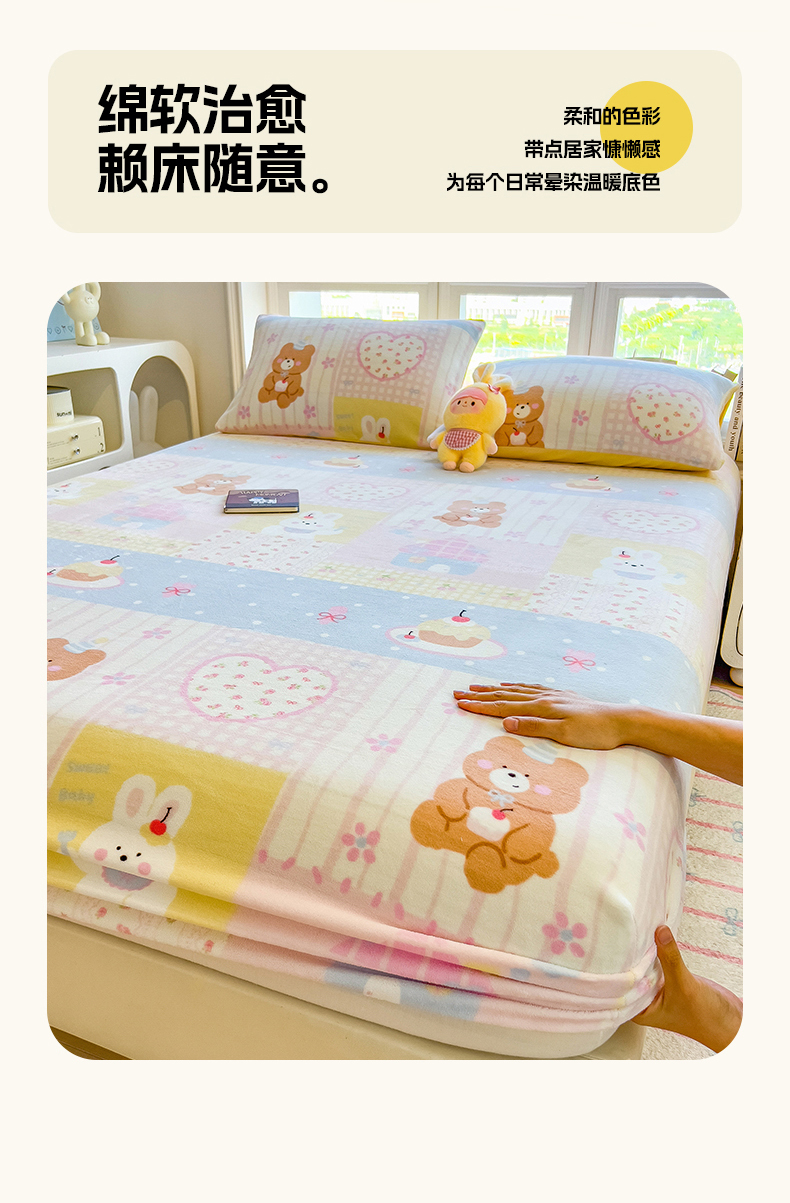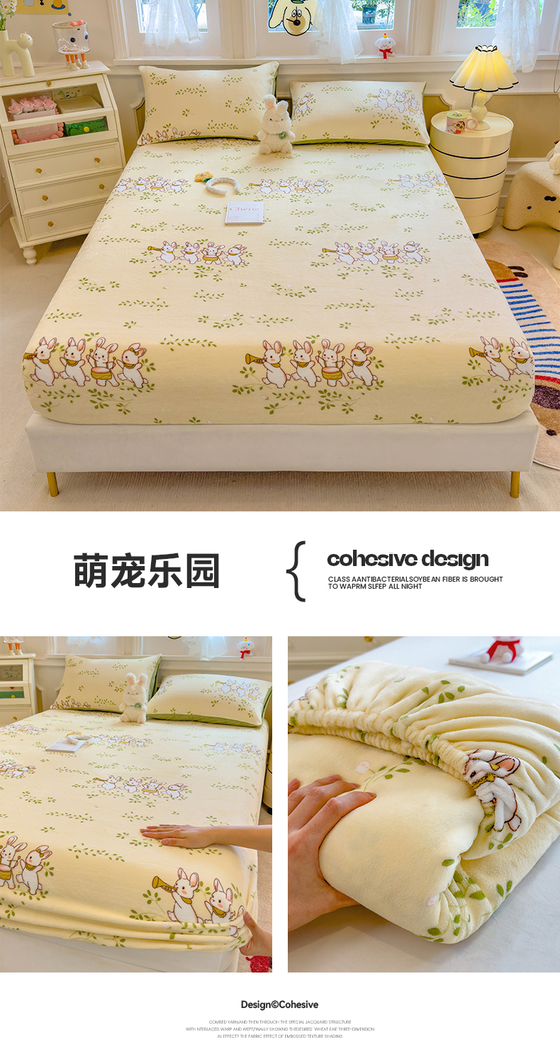 • 91家纺网 家纺一手货源 找家纺 摩妮卡 2025新款印花系列小清新牛奶绒印花床笠三件套 奶系萌宠