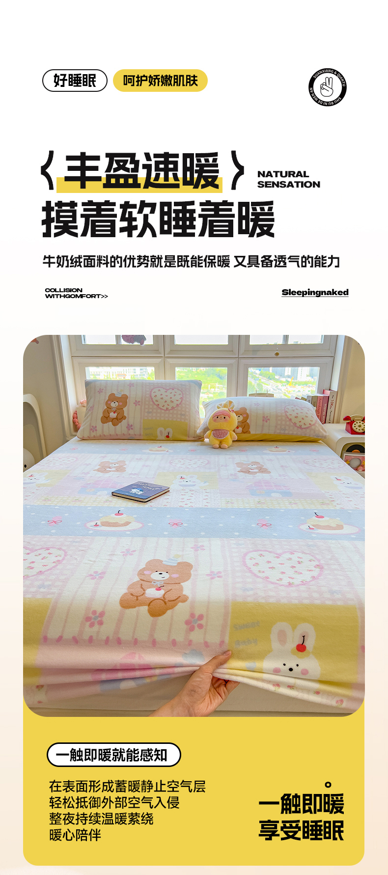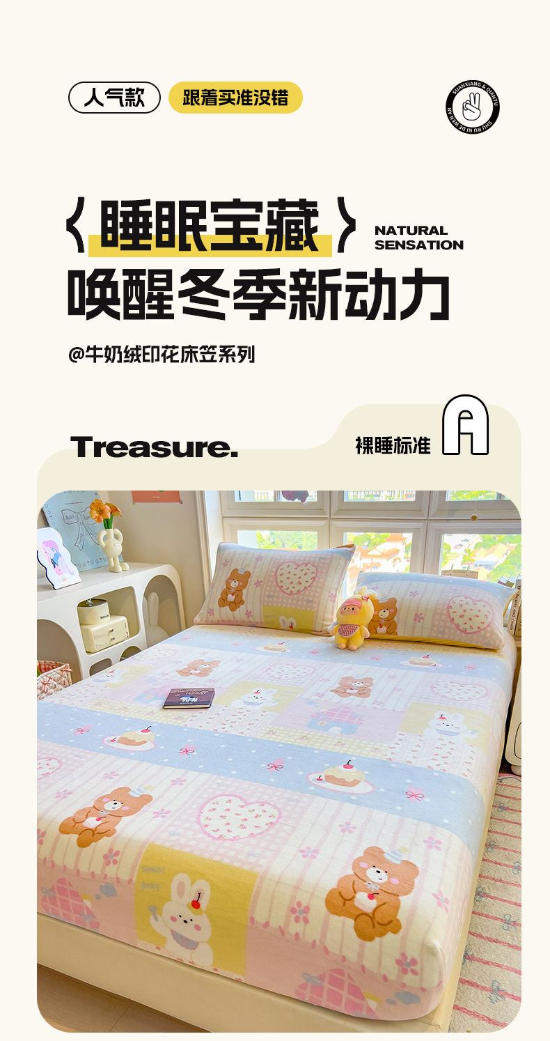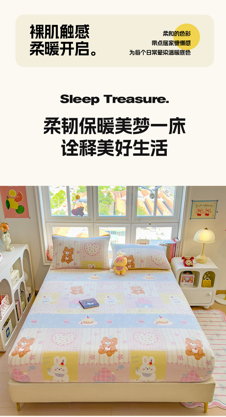• 91家纺网 家纺一手货源 找家纺 摩妮卡 2025新款印花系列小清新牛奶绒印花床笠三件套 奶系萌宠