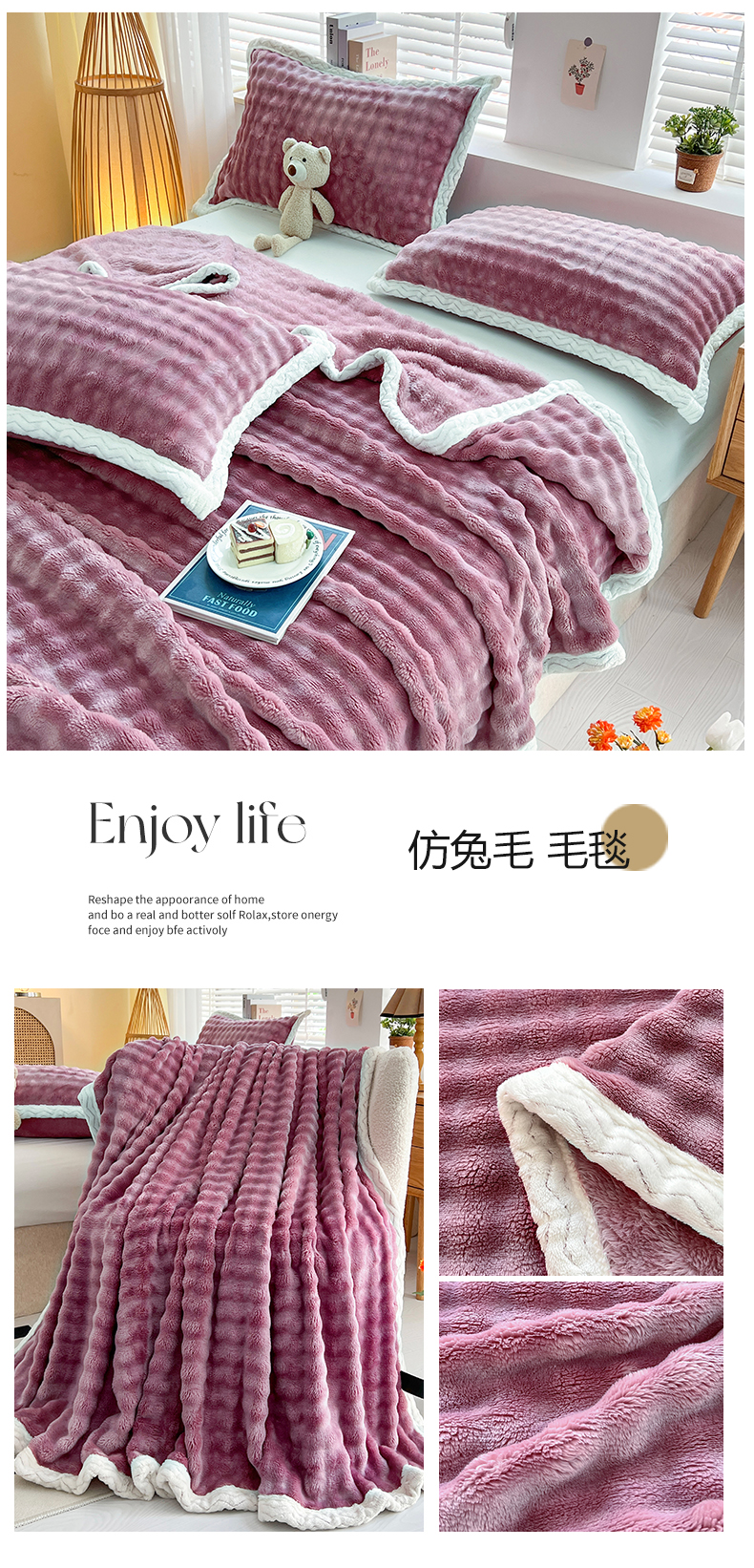 商品名称:栩裕纺织 2025新款简约仿兔毛泡泡绒毛毯系列-包边款 樱花粉