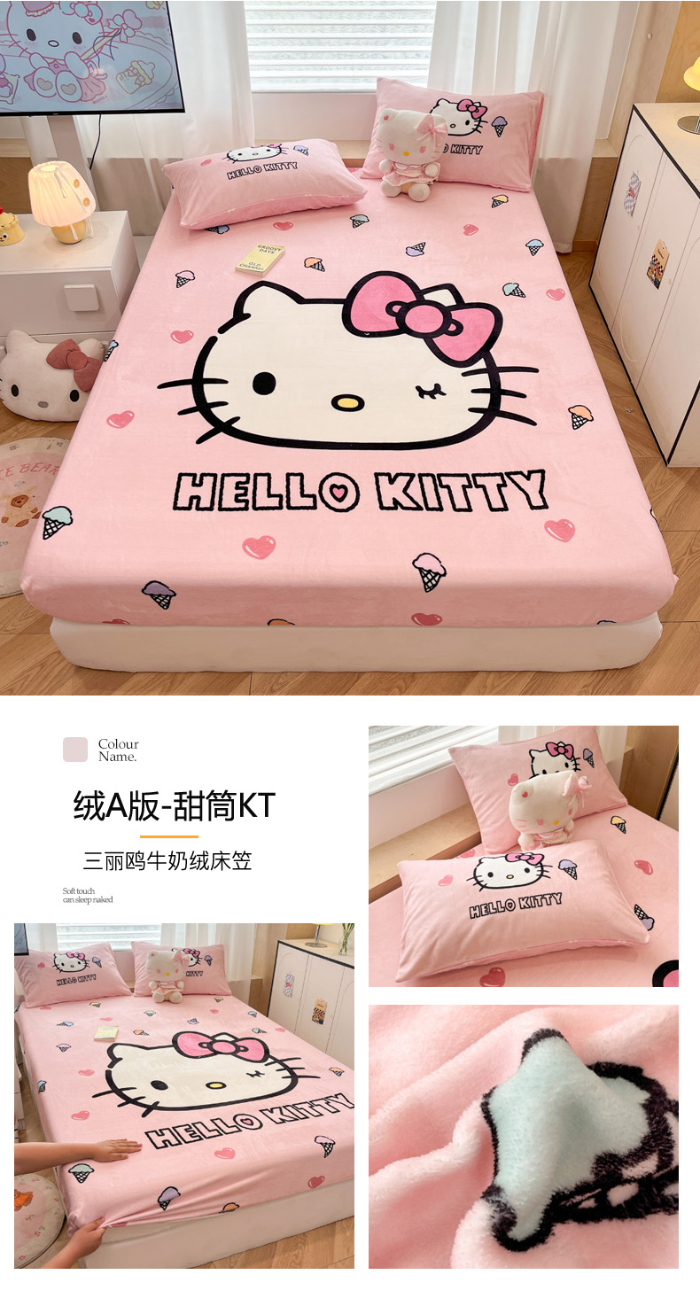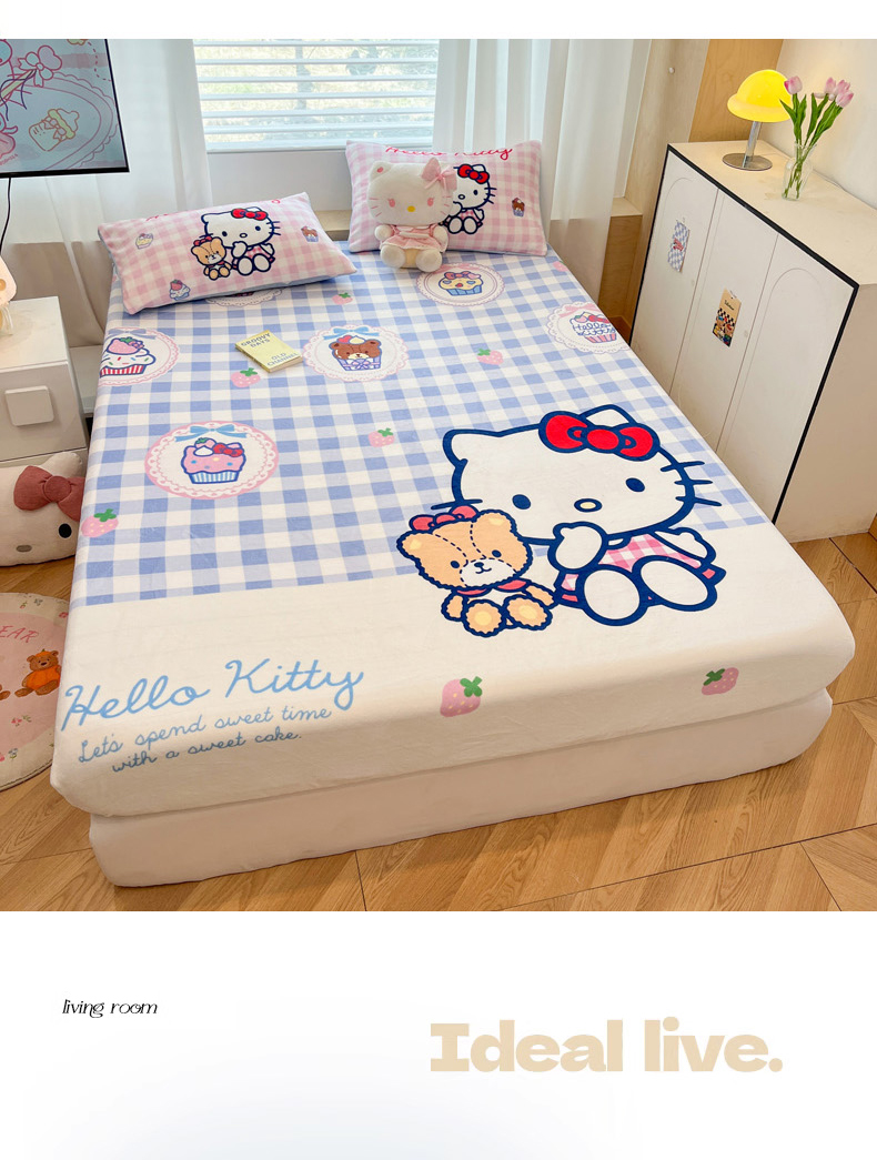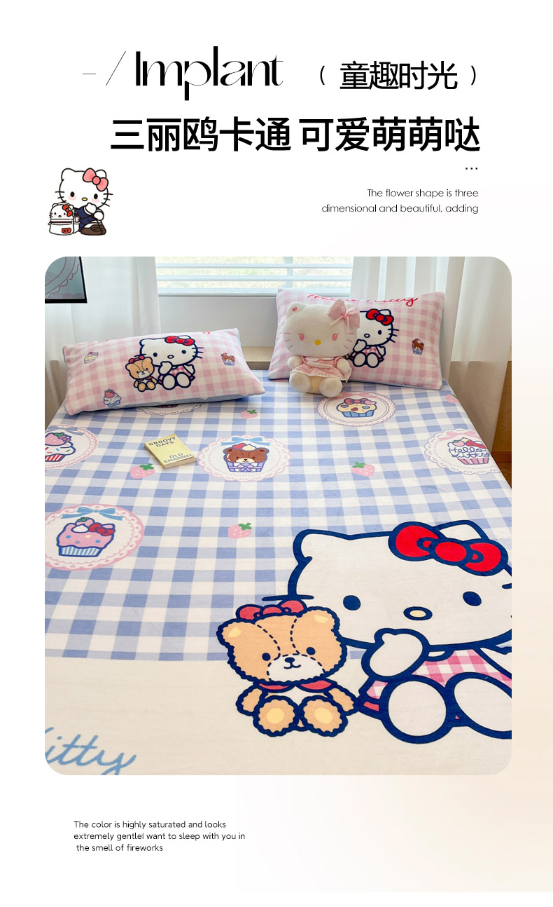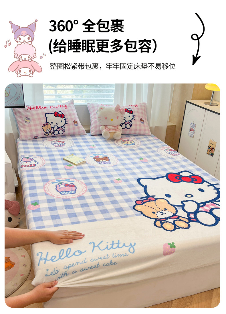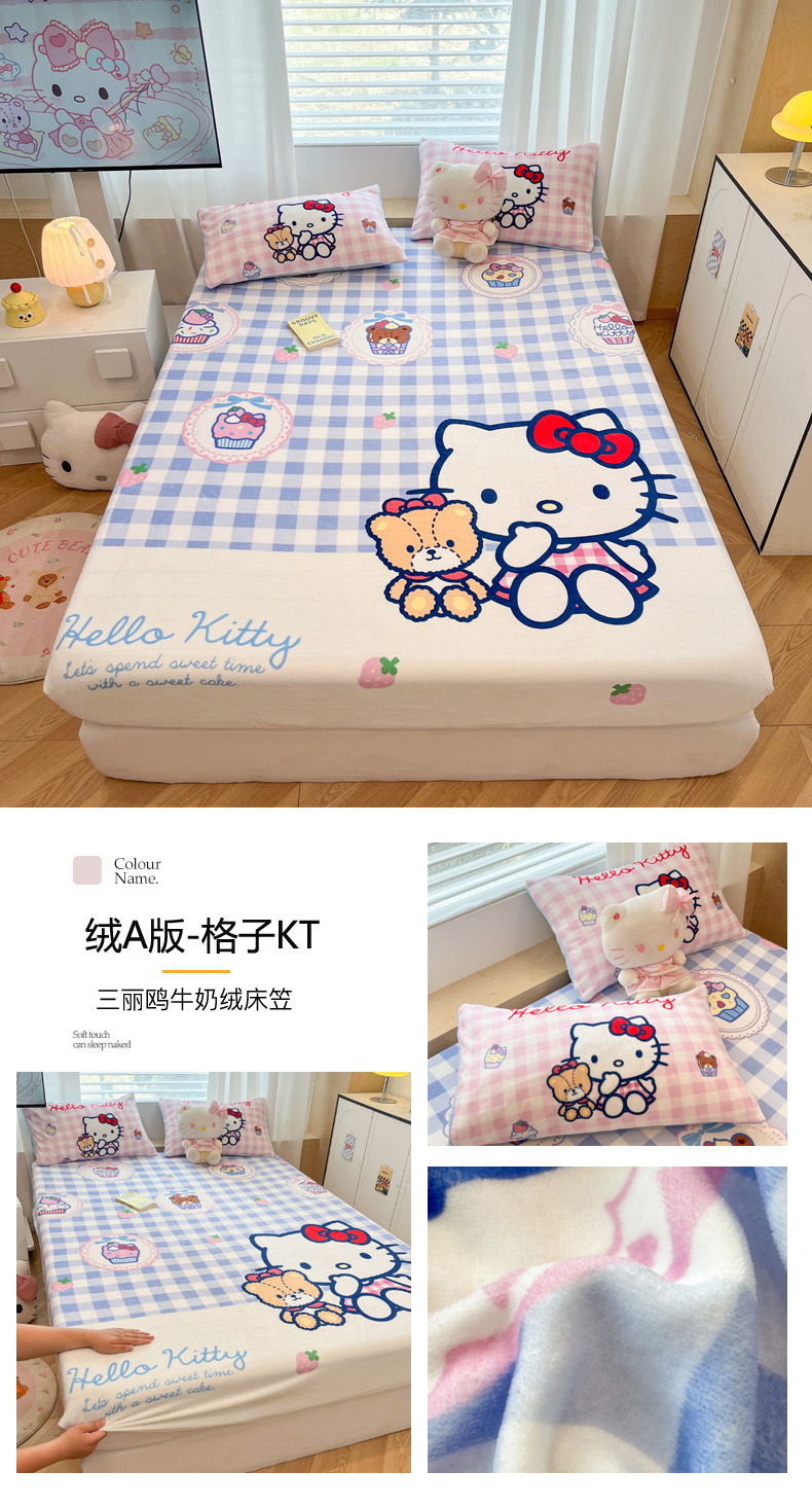 商品名称:暮思家居 2025新款正版授权三丽鸥大版牛奶绒数码印花单品床笠单件床笠(带标价格) 绒A版-格子KT