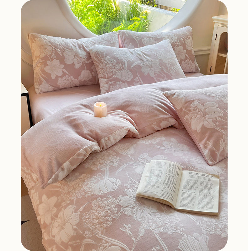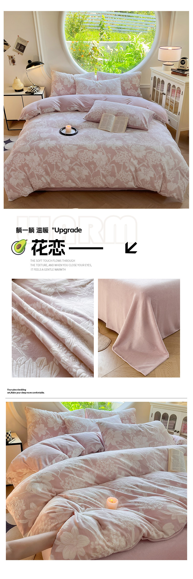商品名称:大境 2025秋冬新款A类230克牛奶绒雕花烂花绒宝宝绒床笠款床单款四件套 浪漫花香 粉