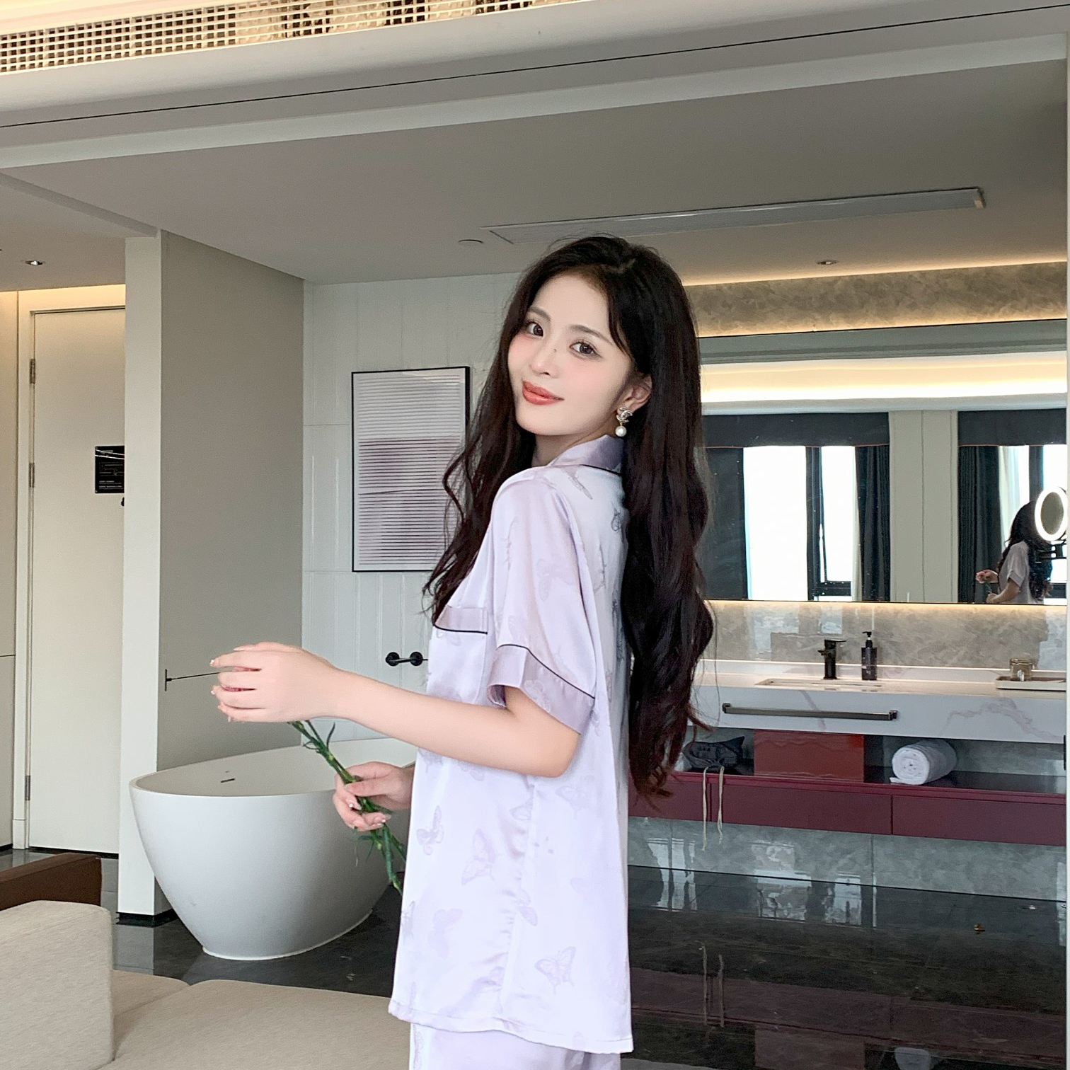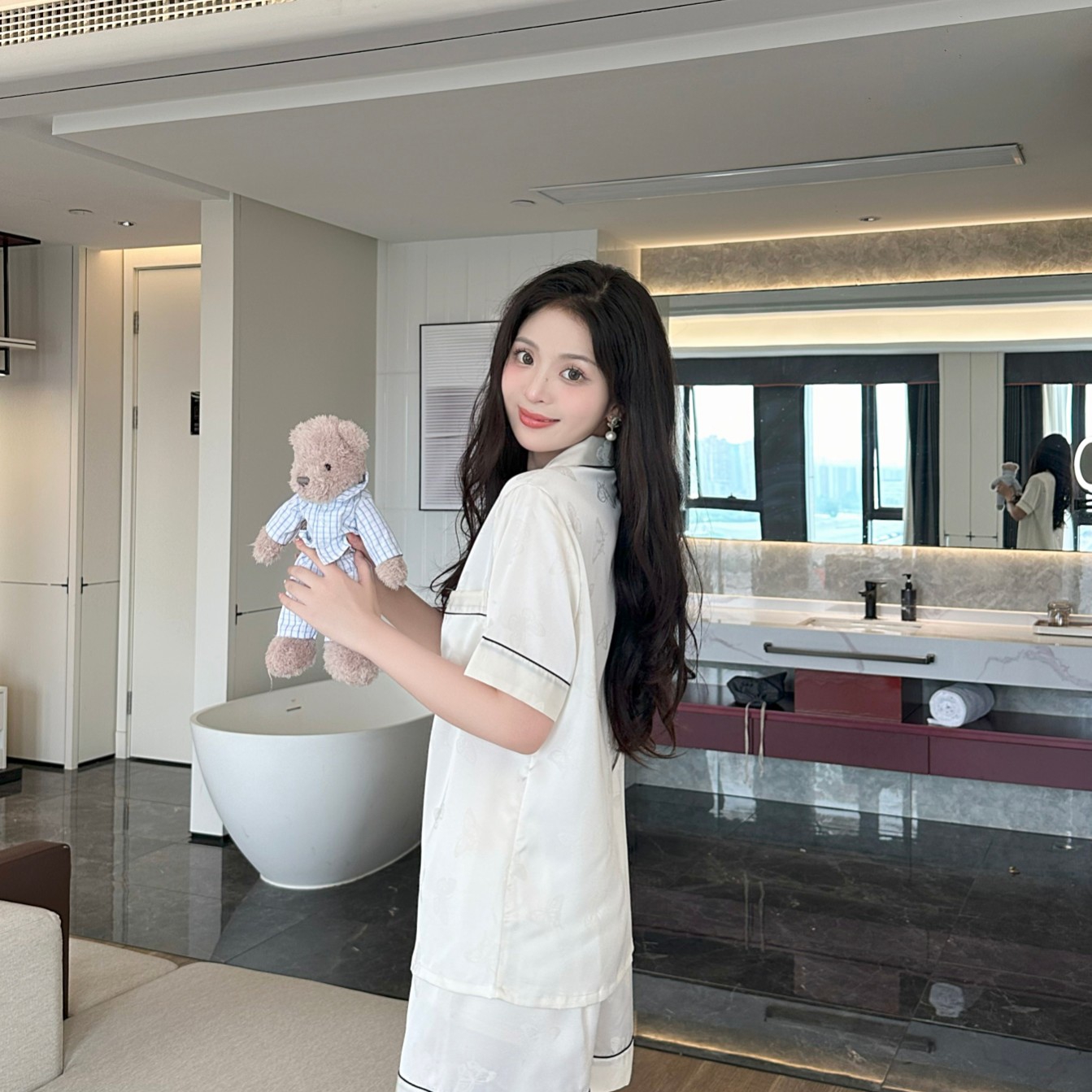 妍景家居生活馆 2025新款冰雪丝简约小翻领短袖短裤 白色