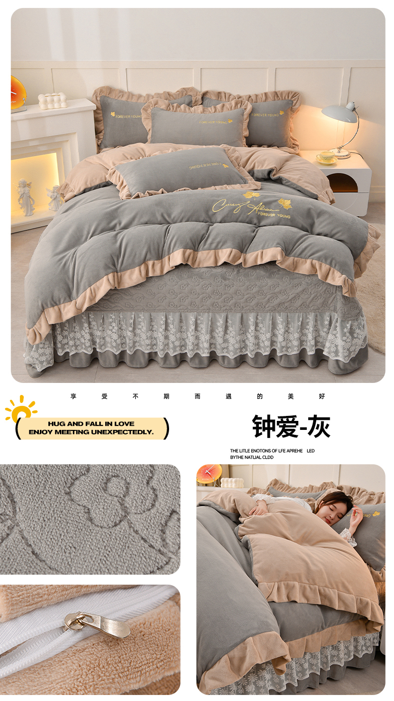 湘雪家居 2025新款高克重纯色刺绣牛奶绒床盖款钟爱系列四件套-提供买家秀 钟爱款-浅灰色