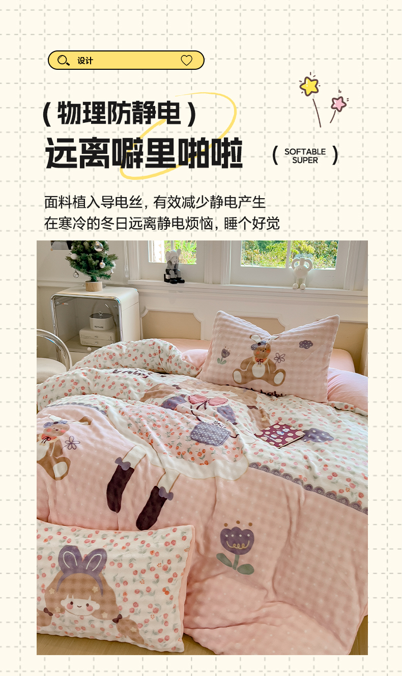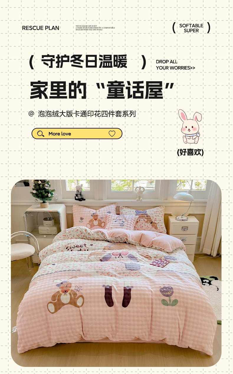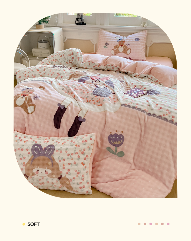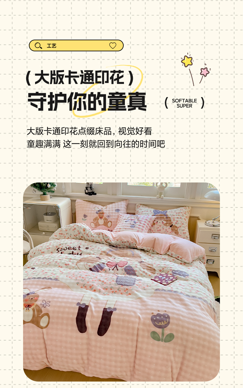 商品名称:摩妮卡 2025新款亲肤舒适泡泡绒大版卡通印花五件套 大版萌趣梦乡