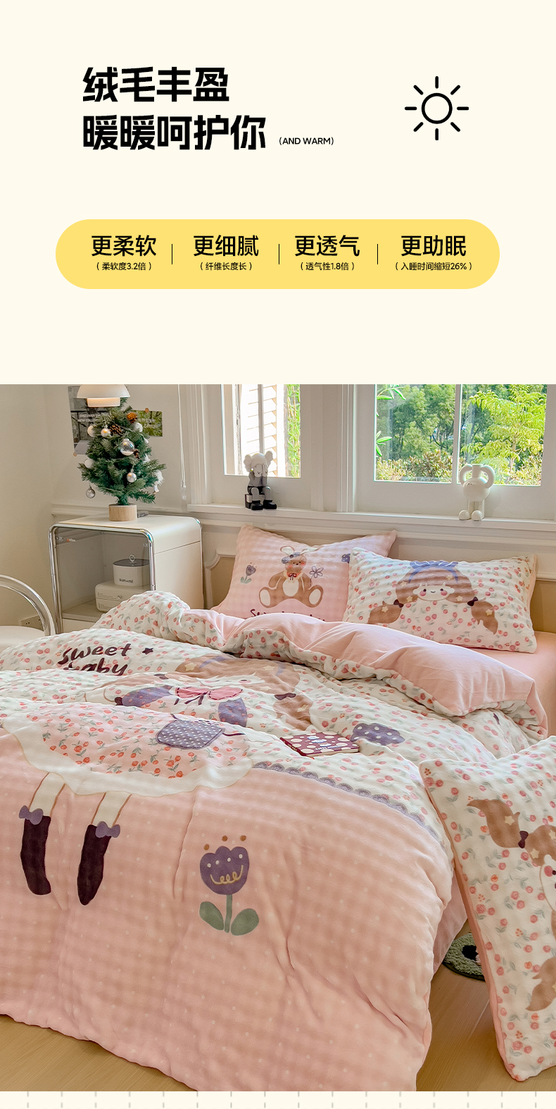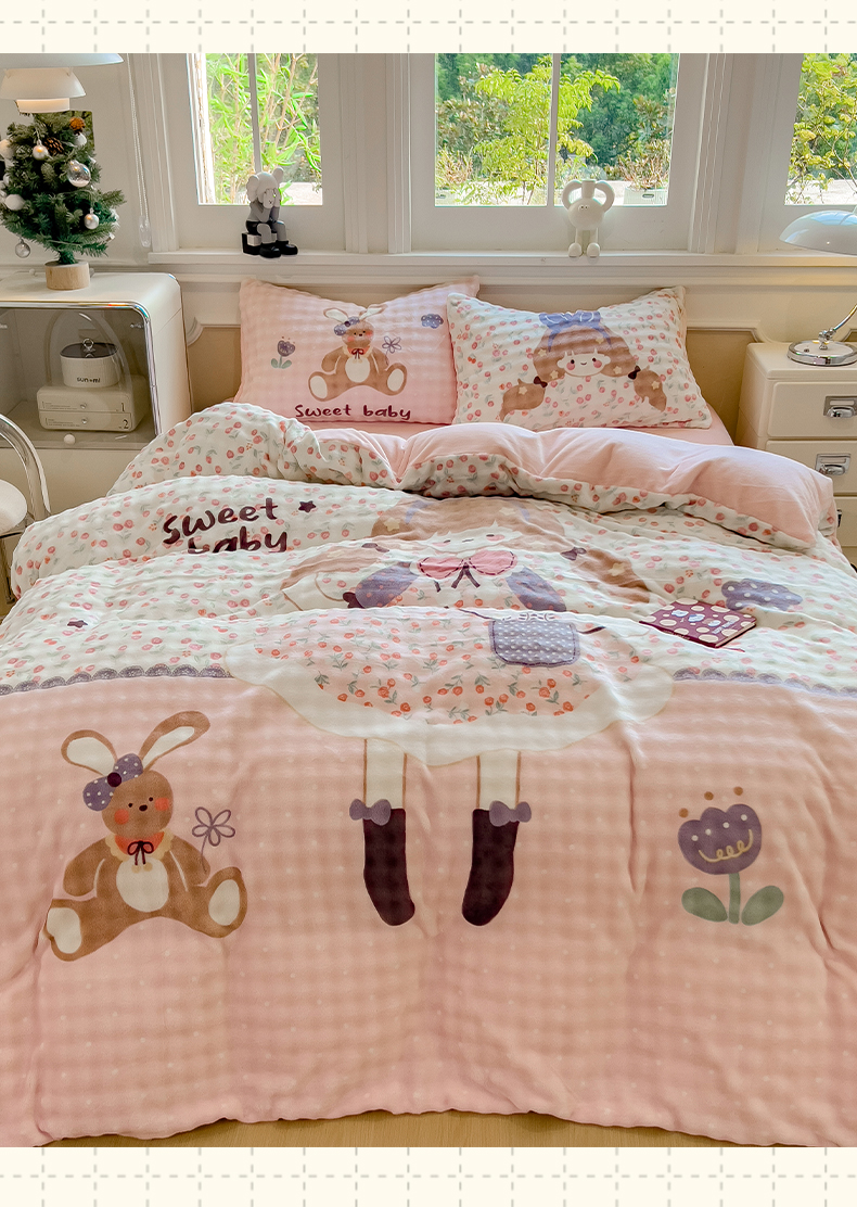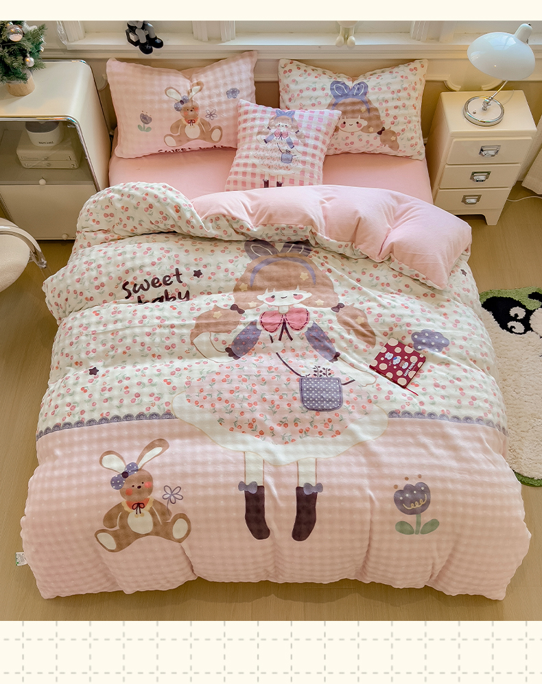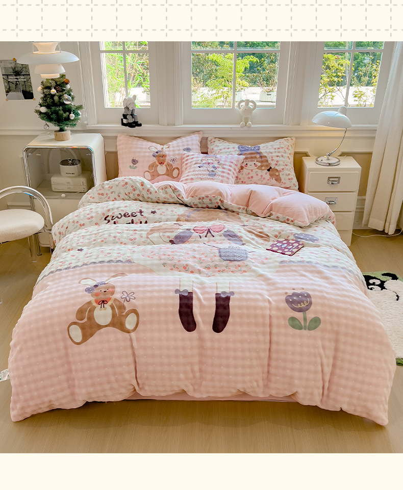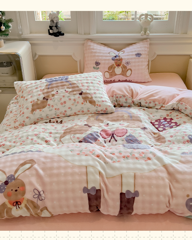(总)摩妮卡 2025新款小清新加厚260克牛奶绒泡泡绒四件套,甜系兔兔,幽香恋曲,软萌萌小兔,洛丽兔,紫韵美乐蒂,萌兔时光,凯蒂小熊,软萌小猫,暮雅,快乐每一天,花园狗,奶蓝玉桂狗,小兔甜甜酱
