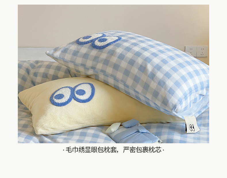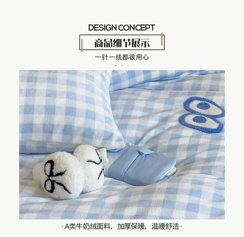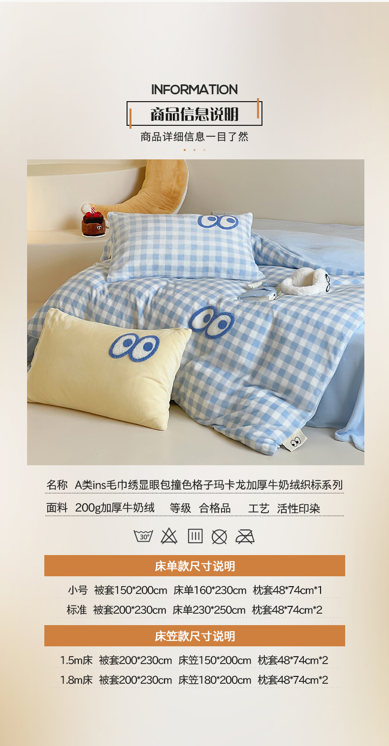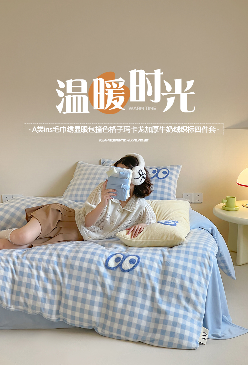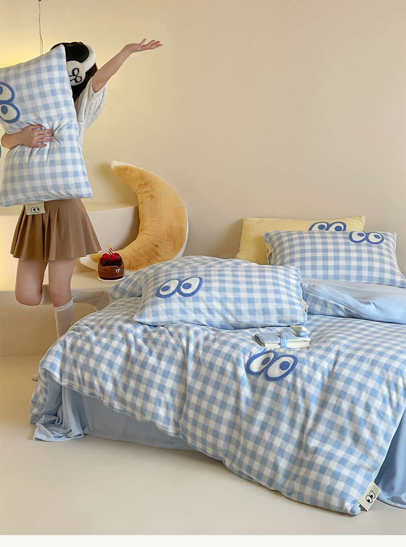 当前位置: 91家纺网 > 商品网购 > 床品套件 > 四件套 > 牛奶绒四件套 > 桃子家居 2025新款A类ins毛巾绣显眼包撞色格子玛卡龙加厚牛奶绒织标四件套时尚模特 绒-显眼包蓝格蓝蓝